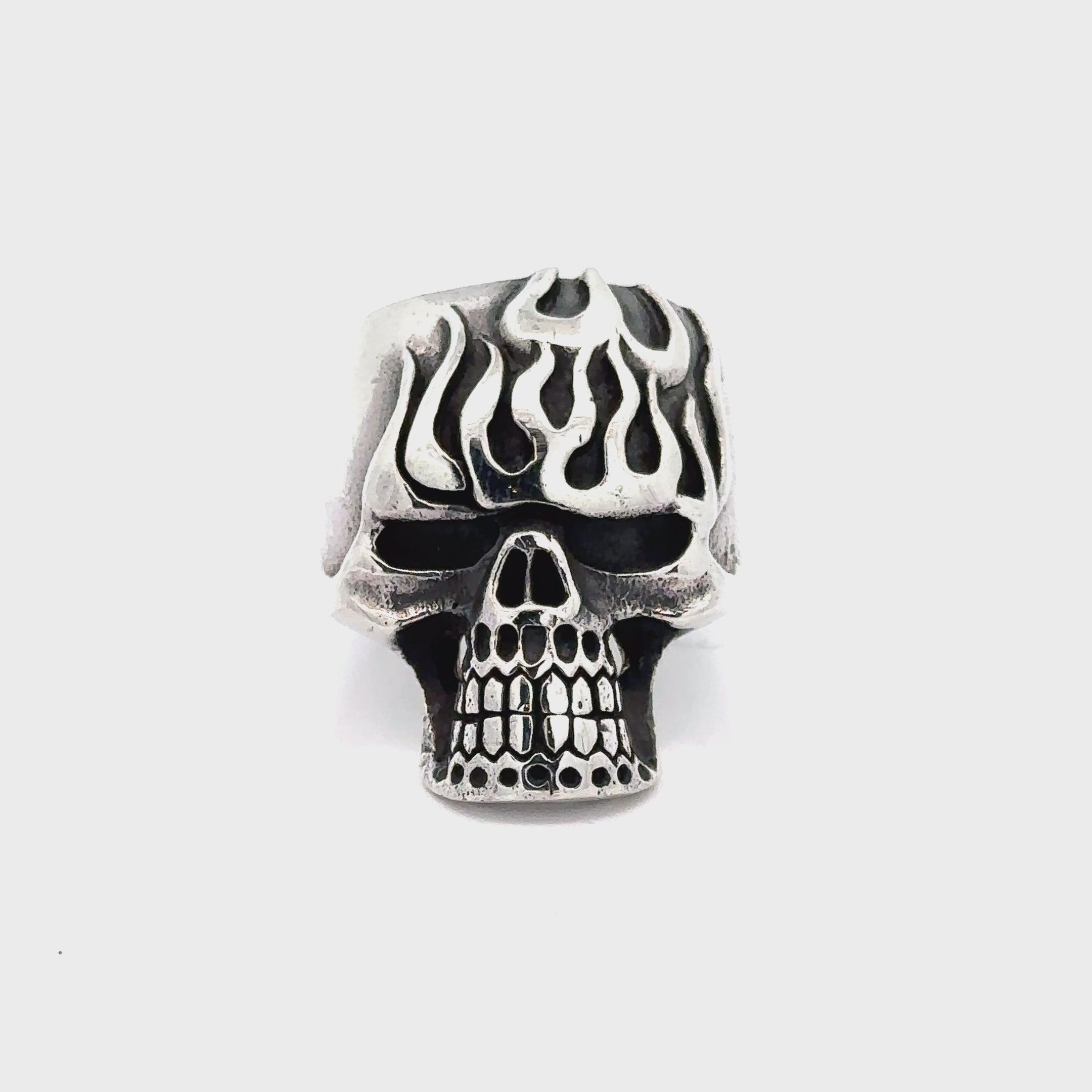 Ignite your style with our Silver Statement Ring, featuring a bold skull design adorned with flames on the forehead. This striking piece combines rugged charm with fiery details, creating a look that's both edgy and captivating. The substantial silver band adds weight and presence, making it a standout accessory for any occasion. Whether you're enhancing your everyday attire or adding a rebellious touch to a special outfit, this ring is sure to turn heads and spark conversations. Embrace the power of this unique design and let your individuality shine through.