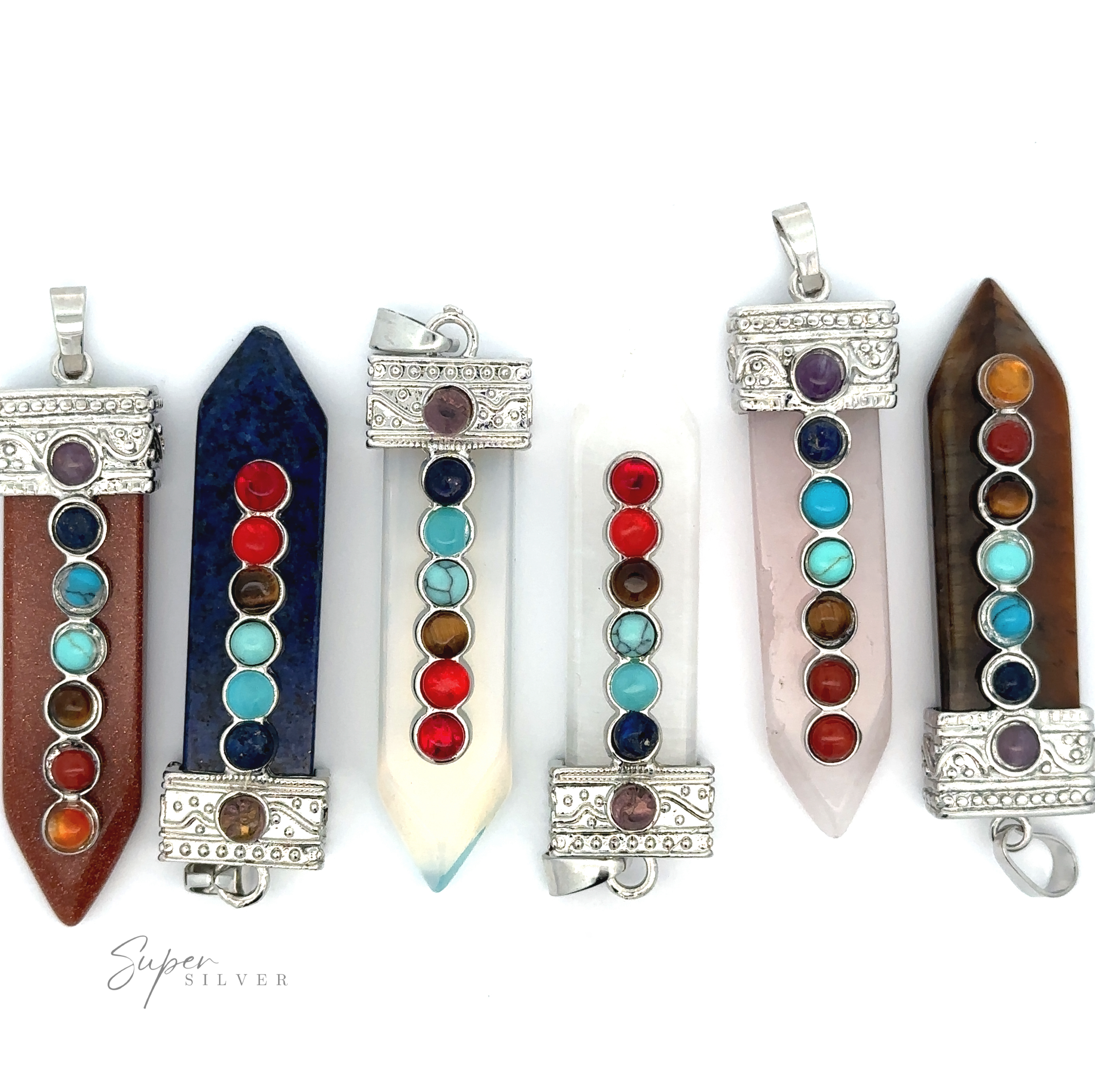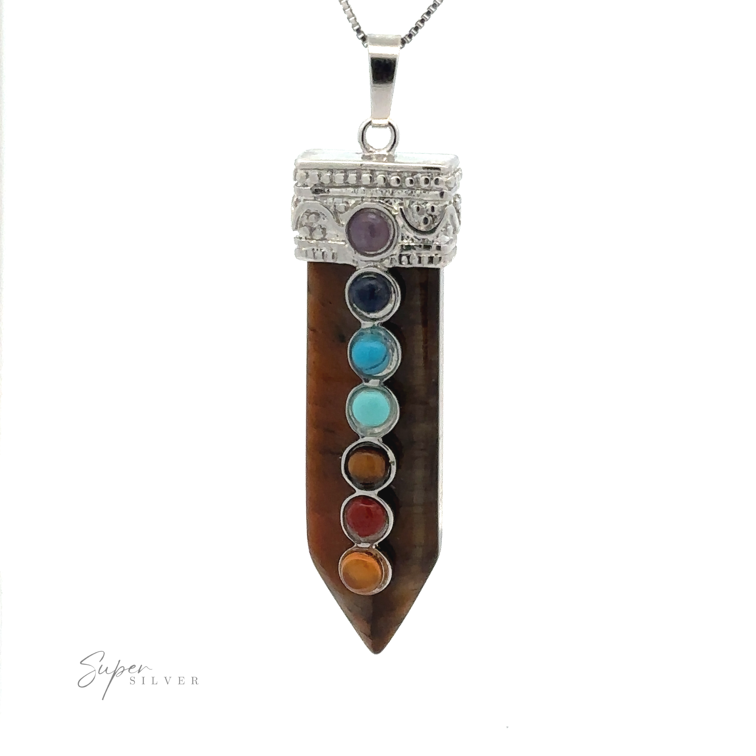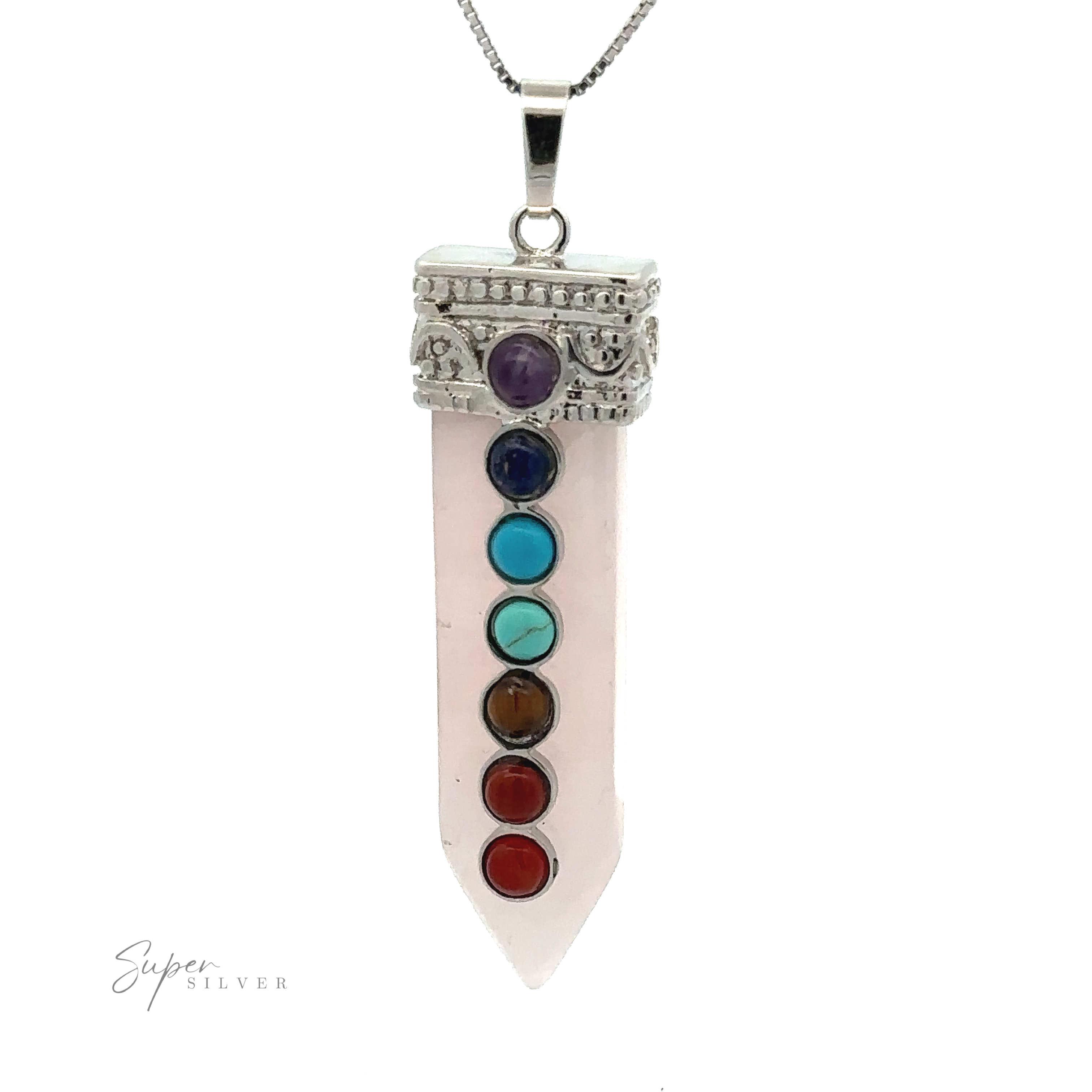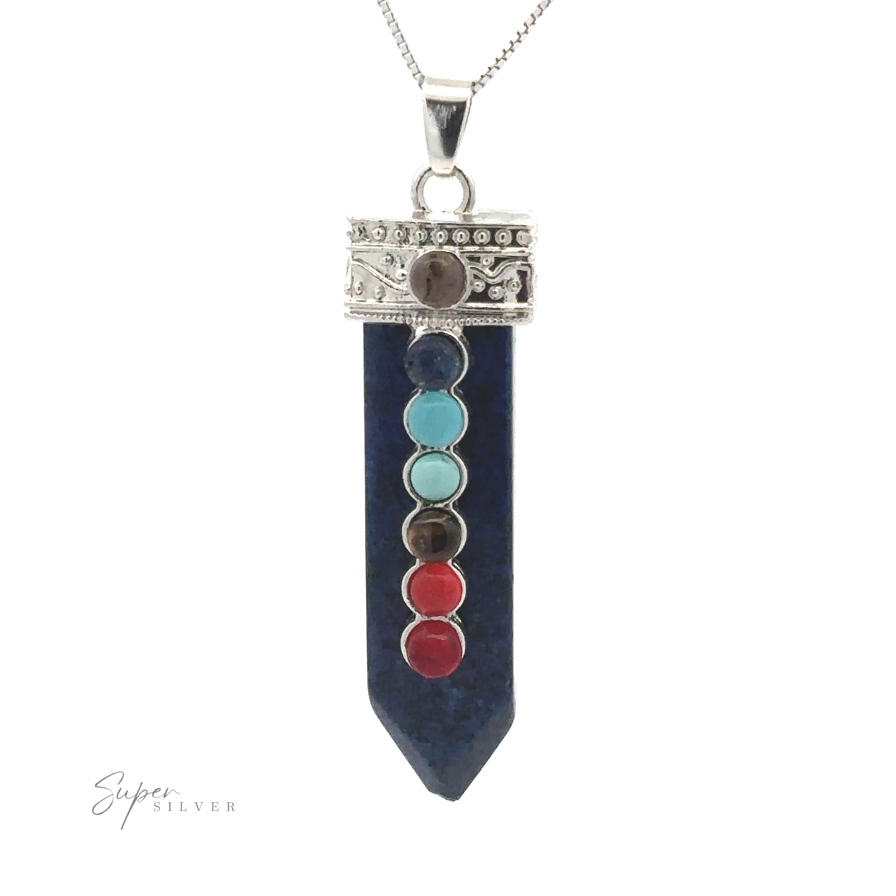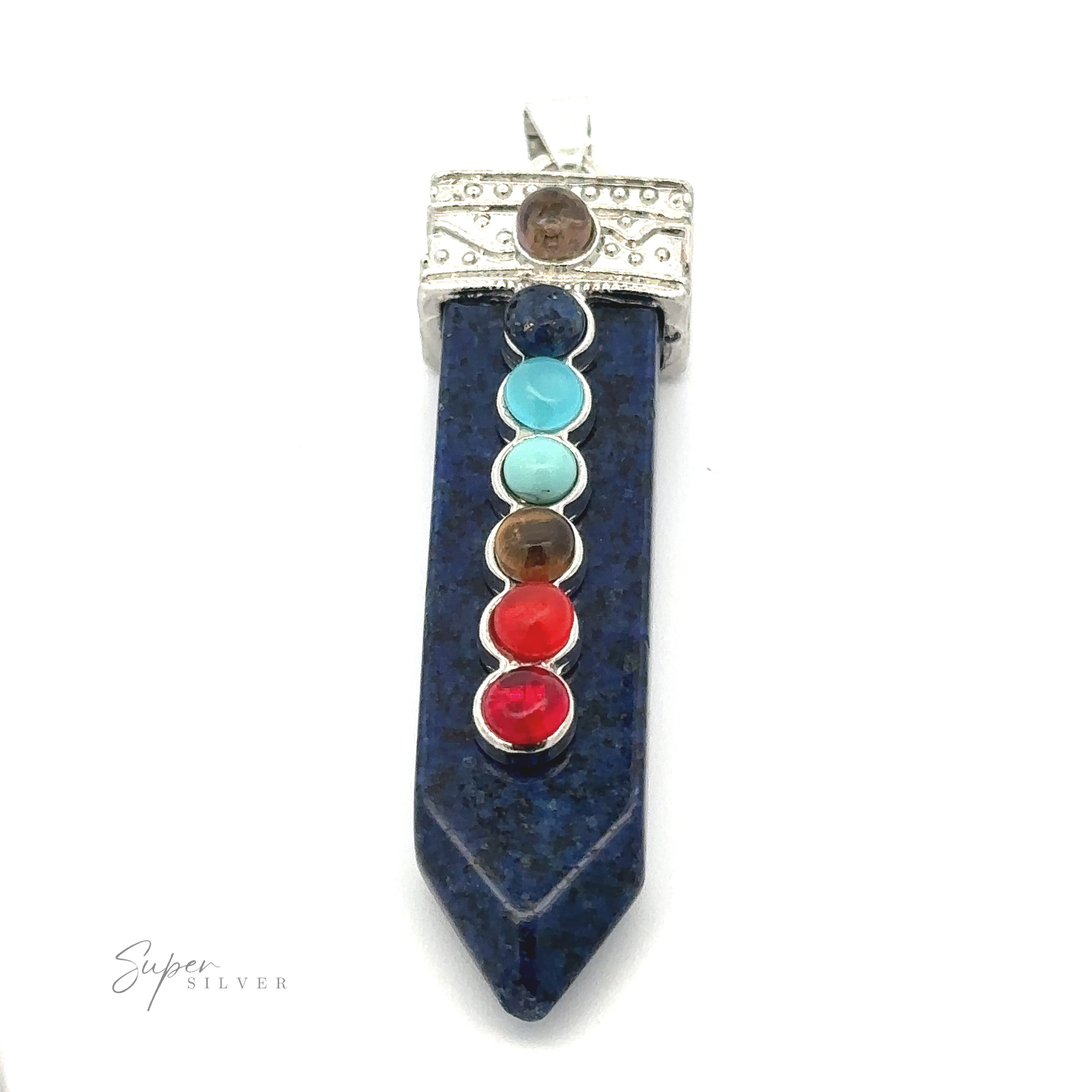 Flat Obelisk pendant with chakra stones in the center. Set in a silver-plated design is perfect for balancing your chakras while providing the energy of your favorite stone.