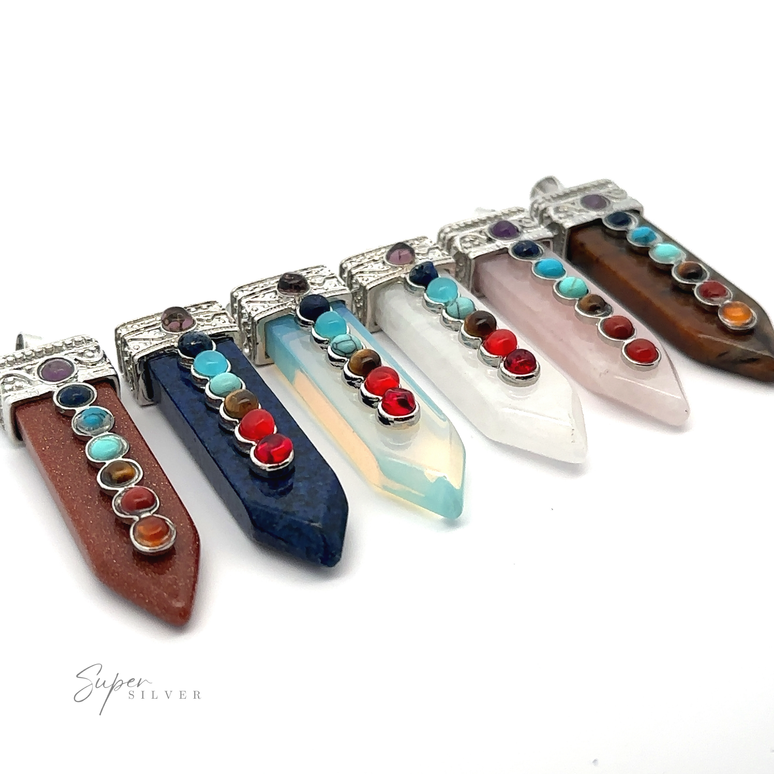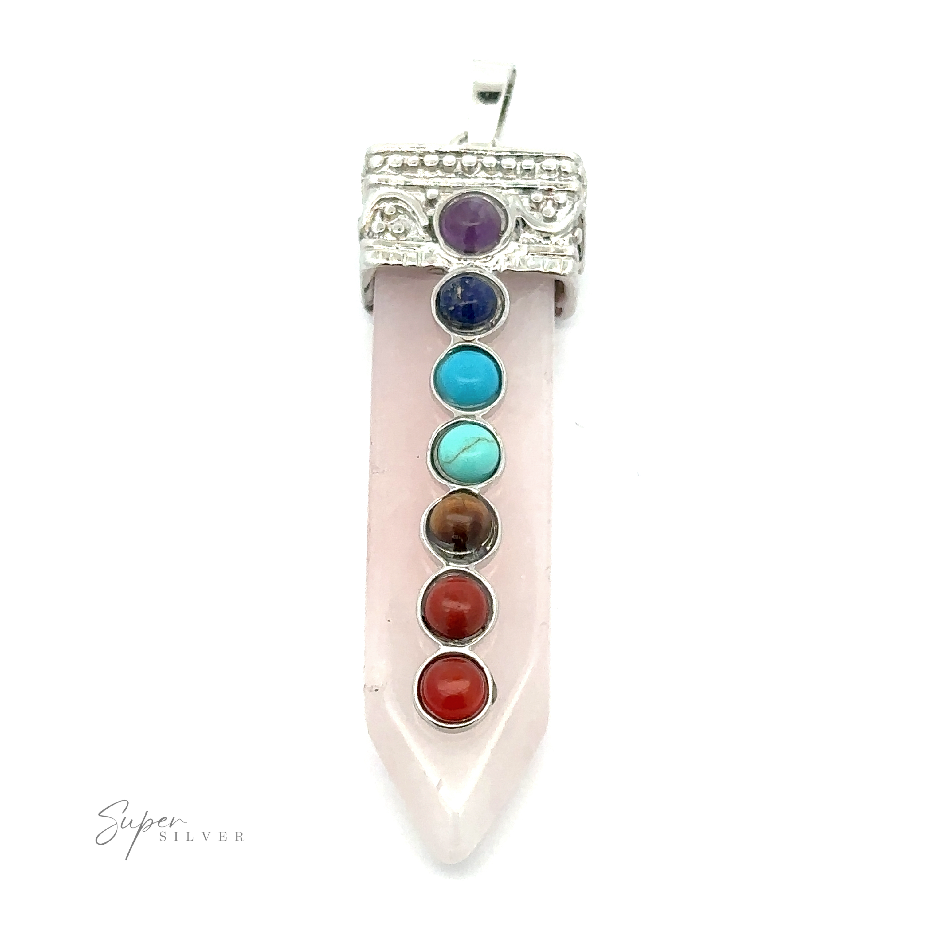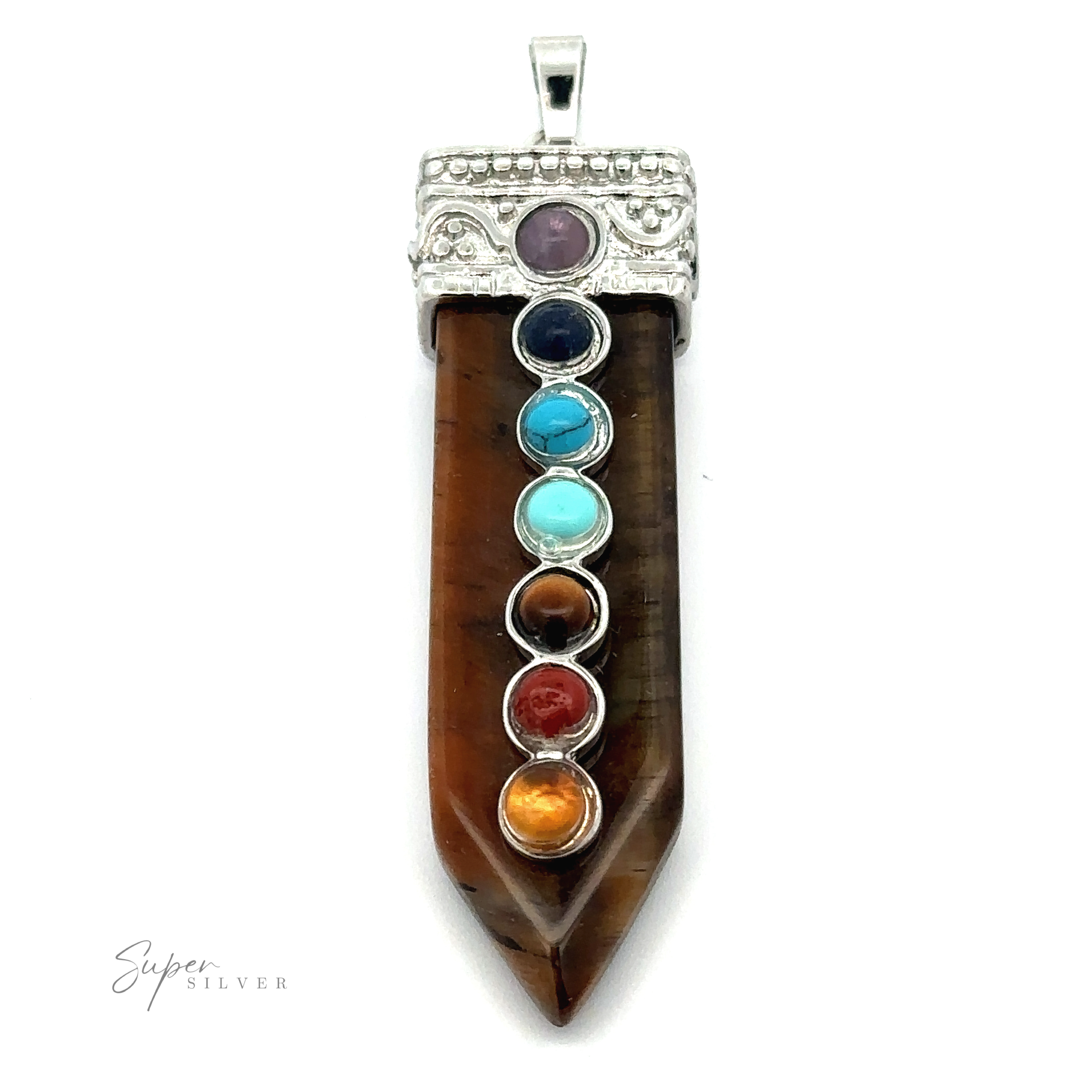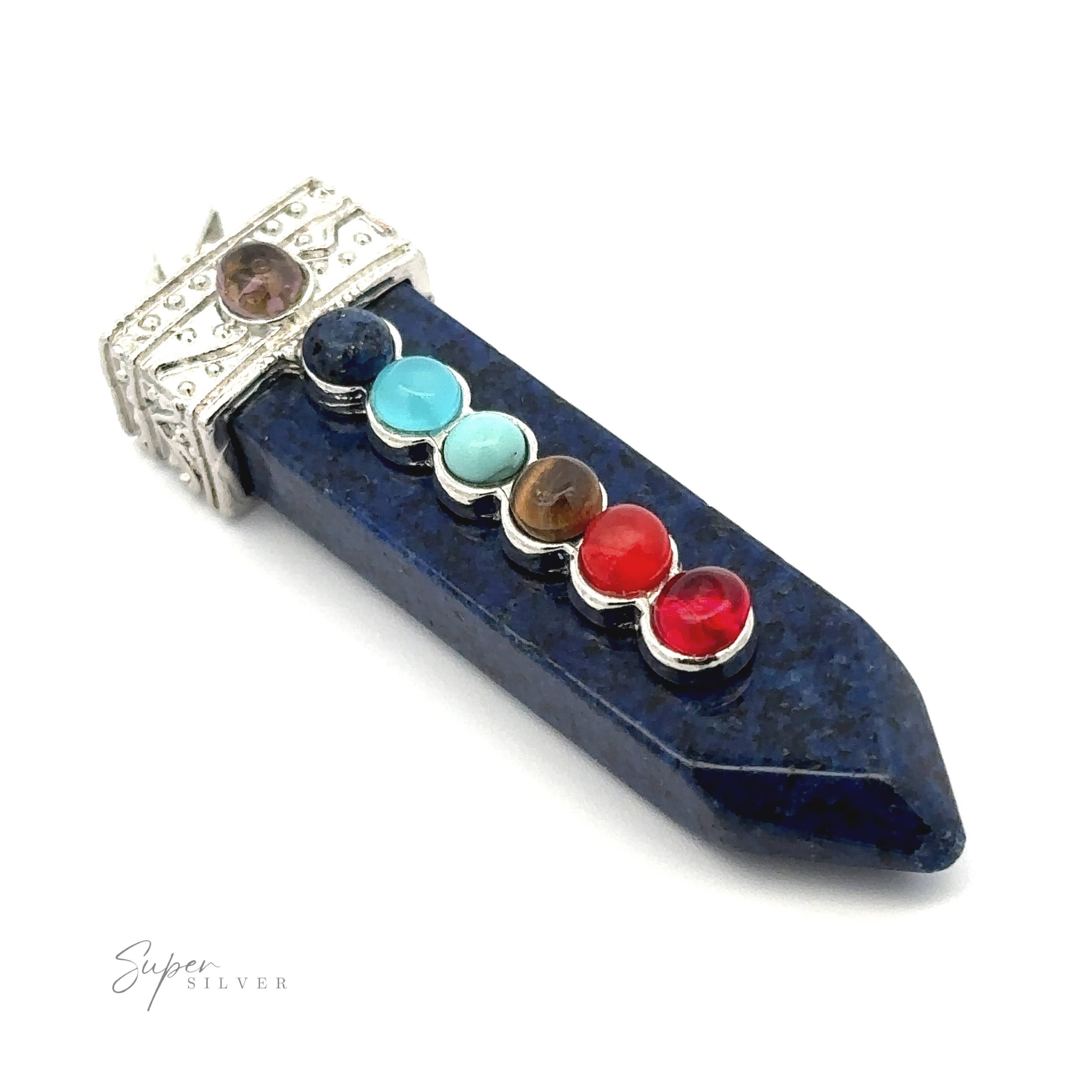 Flat Obelisk pendant with chakra stones in the center. Set in a silver-plated design is perfect for balancing your chakras while providing the energy of your favorite stone.