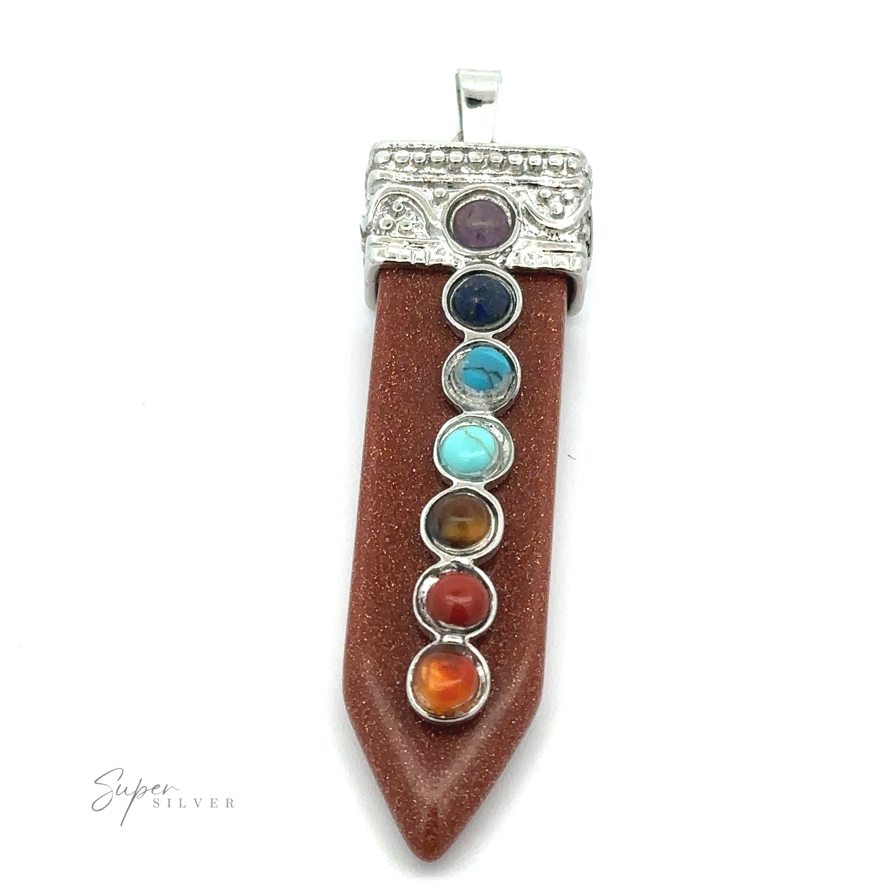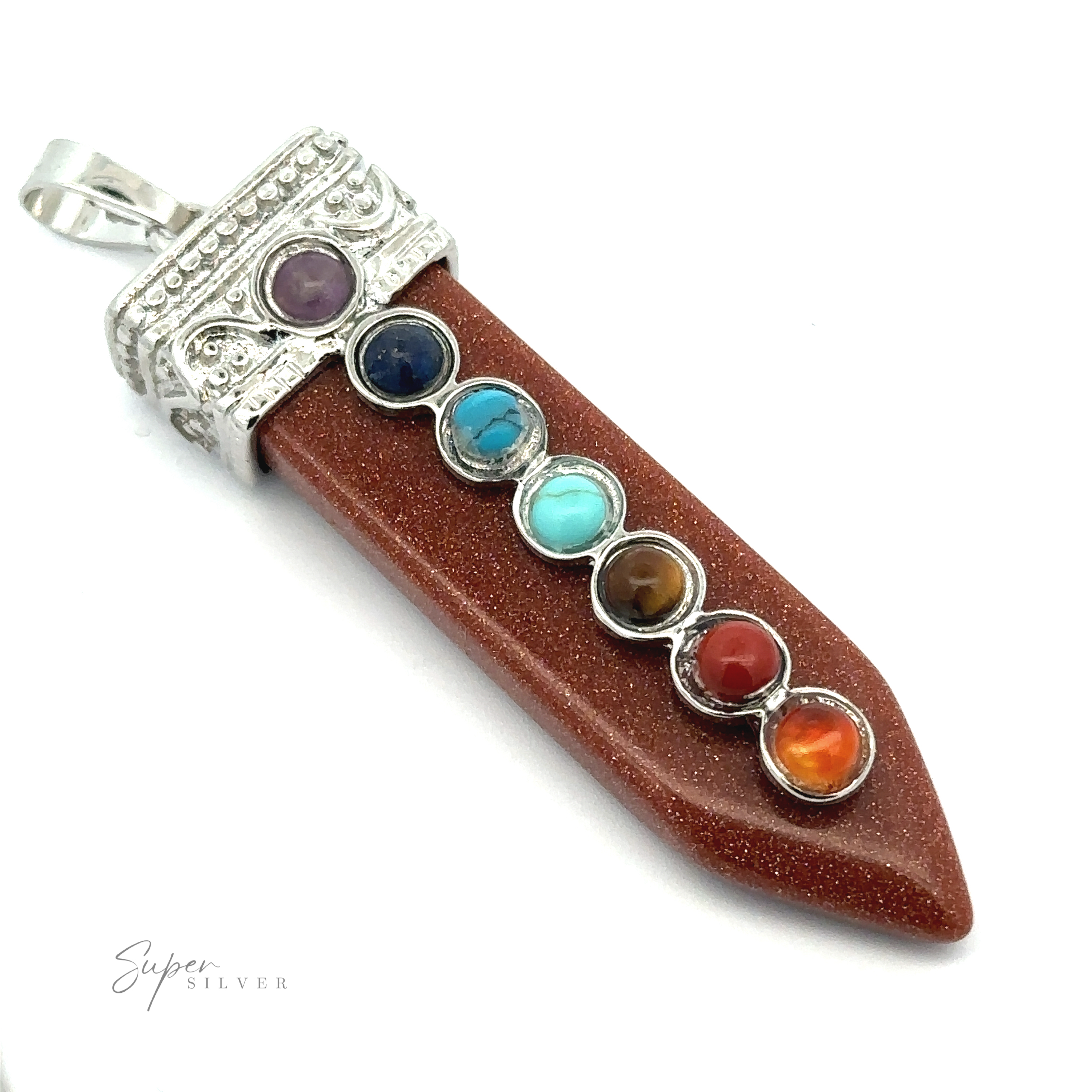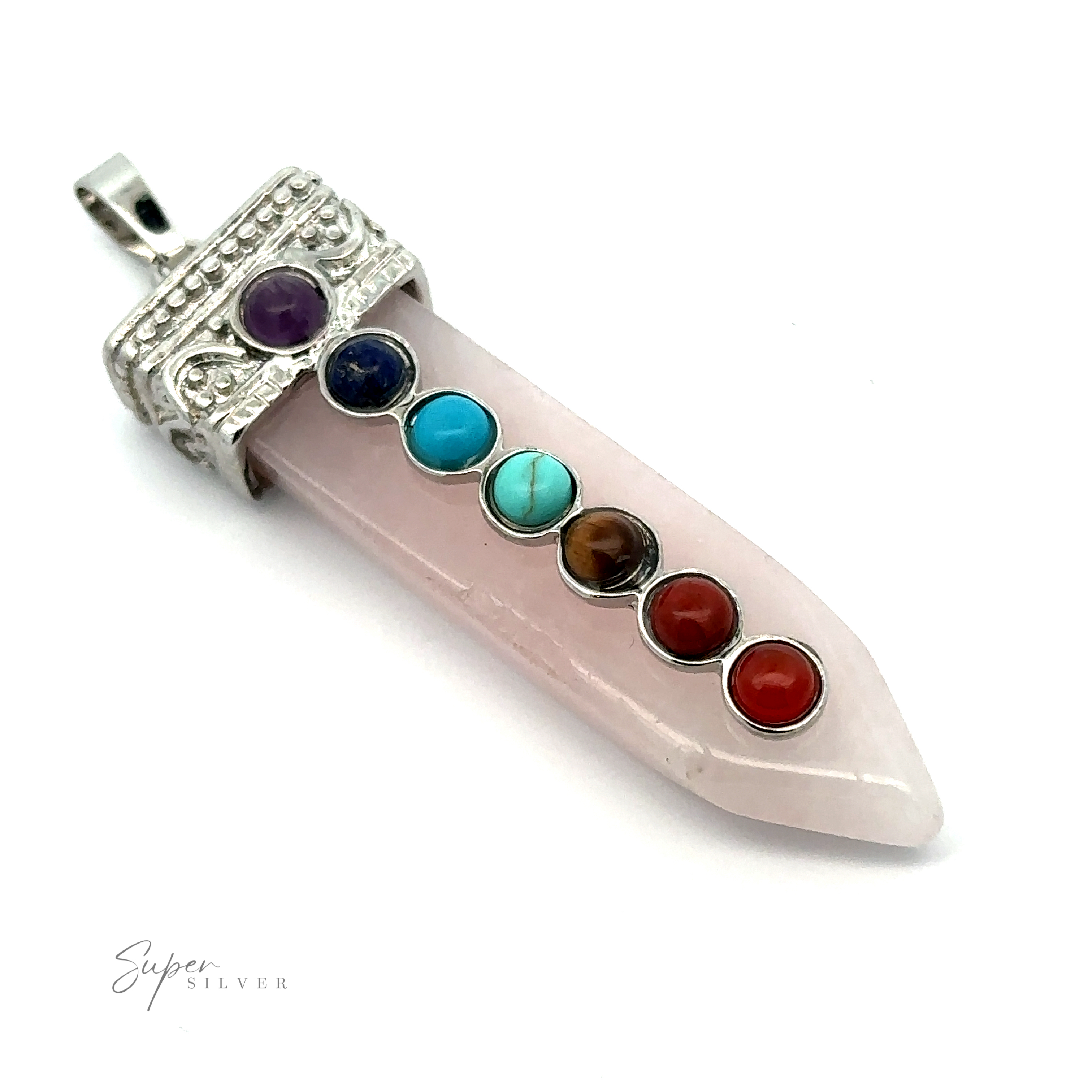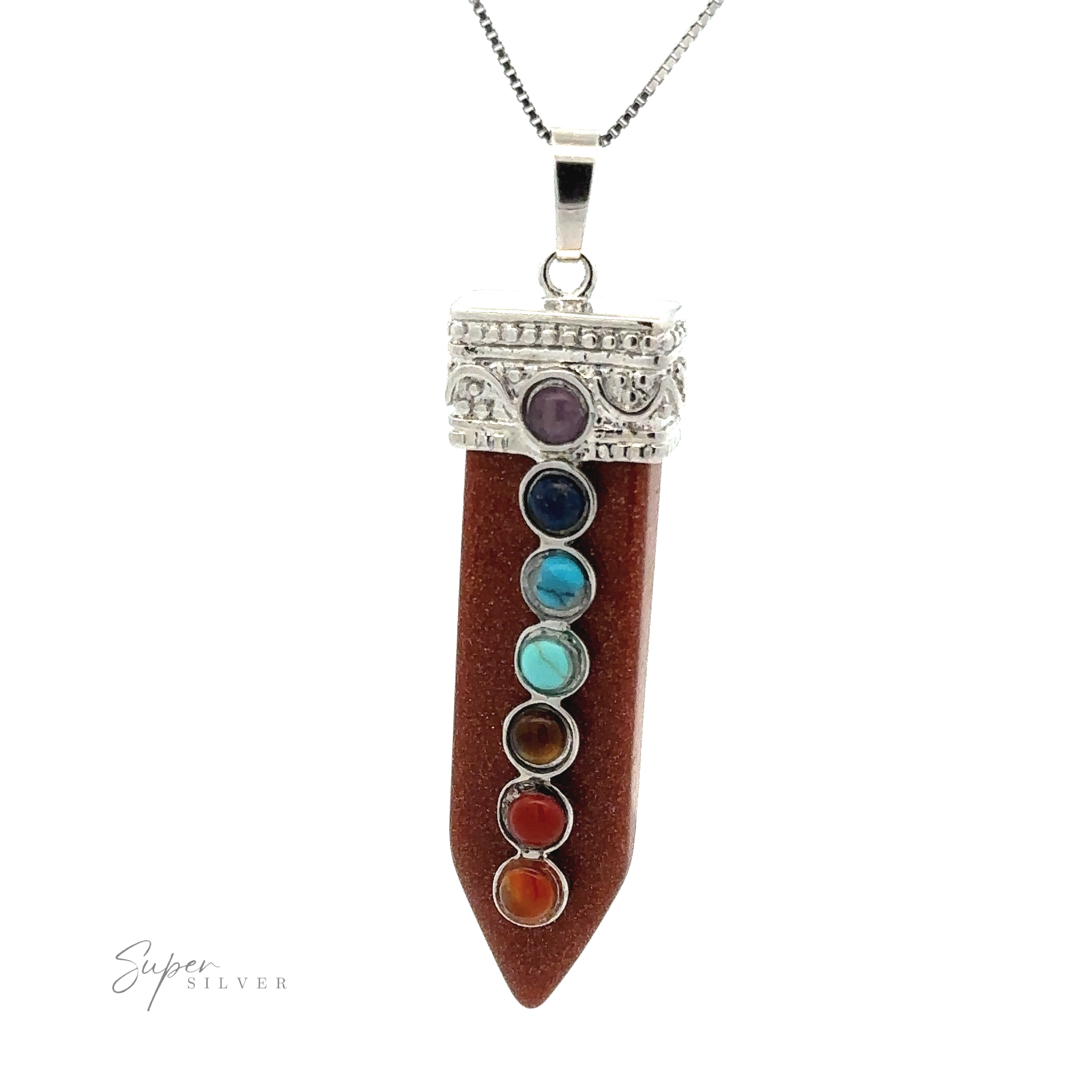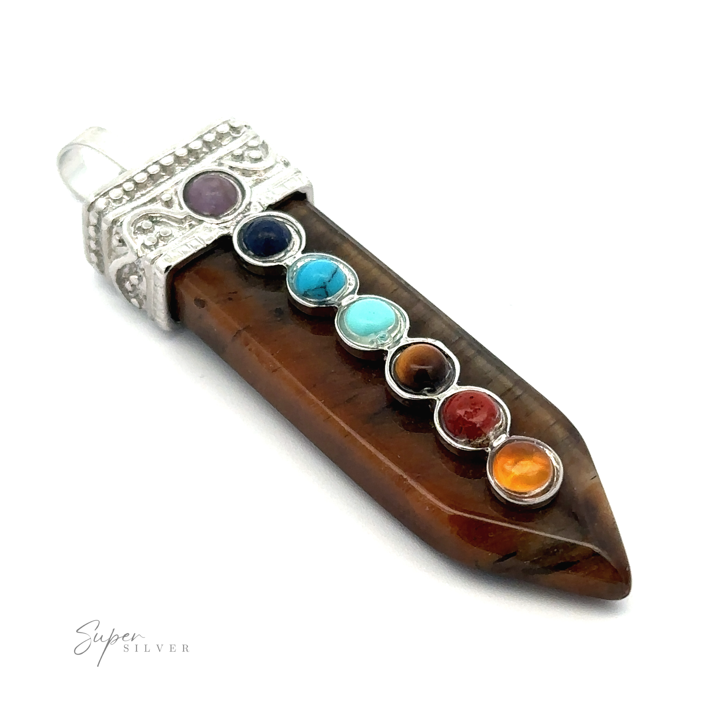 Flat Obelisk pendant with chakra stones in the center. Set in a silver-plated design is perfect for balancing your chakras while providing the energy of your favorite stone.