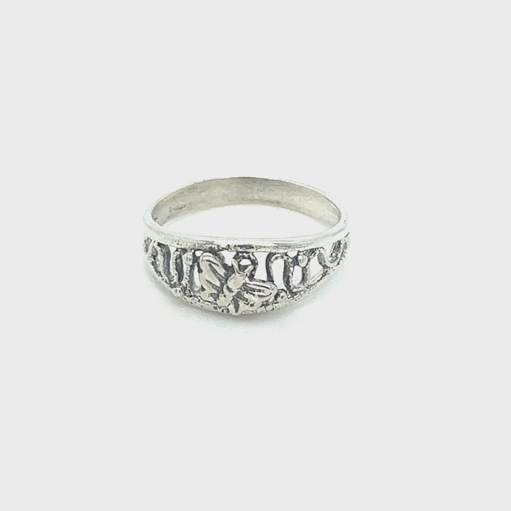 This adorable butterfly ring dances in flight across the domed cutout band of this dainty and comfortable ring. A delicate ring that embraces one of the earth's most captivating creatures, the butterfly; this graceful insect symbolizes transformation, hope, and change. A perfect addition for any nature lover, this ring is offered in smaller sizes for children, toe-rings, or makes for a fabulous midi-ring.