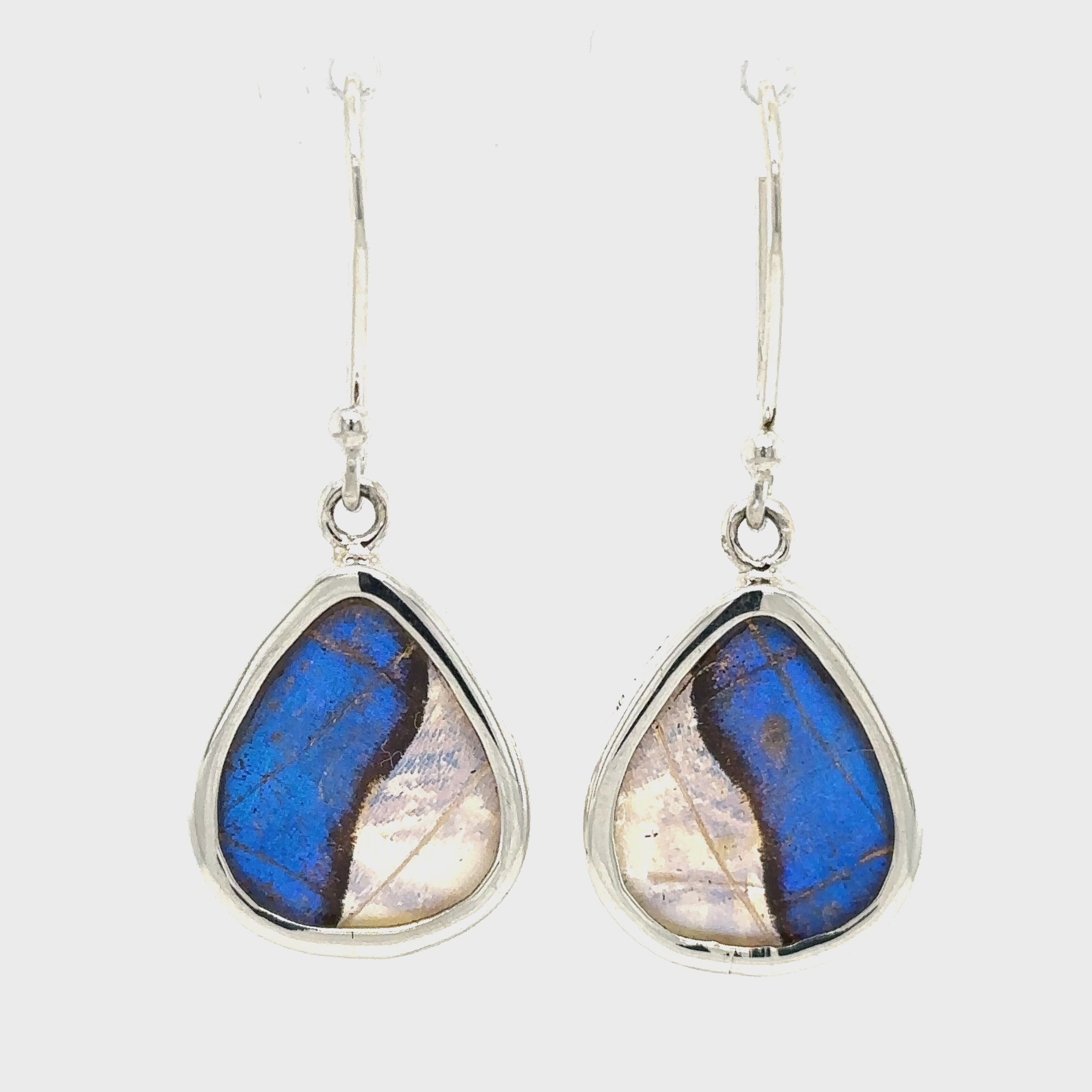 Elevate your style with our Genuine Morpho/Sulkowsky Butterfly Wing Teardrop Earrings, a stunning combination of deep, iridescent blues that shimmer with an enchanting light. These unique earrings capture the breathtaking beauty of Morpho and Sulkowsky butterfly wings, showcasing the intricate patterns and hues of the natural world.