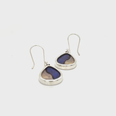 The deep, dark blue hues contrasted by the shimmering light blue create a captivating and harmonious visual display, making these earrings a standout accessory for any occasion. These ethically sourced butterfly wing earrings are not only a celebration of nature's artistry but also a symbol of personal transformation and growth, just as the butterfly undergoes its remarkable journey. Adorn yourself with the elegance of the butterfly and embrace the beauty of the natural world with our Genuine Morpho/Sulkowsky Butterfly Wing Teardrop Earrings.