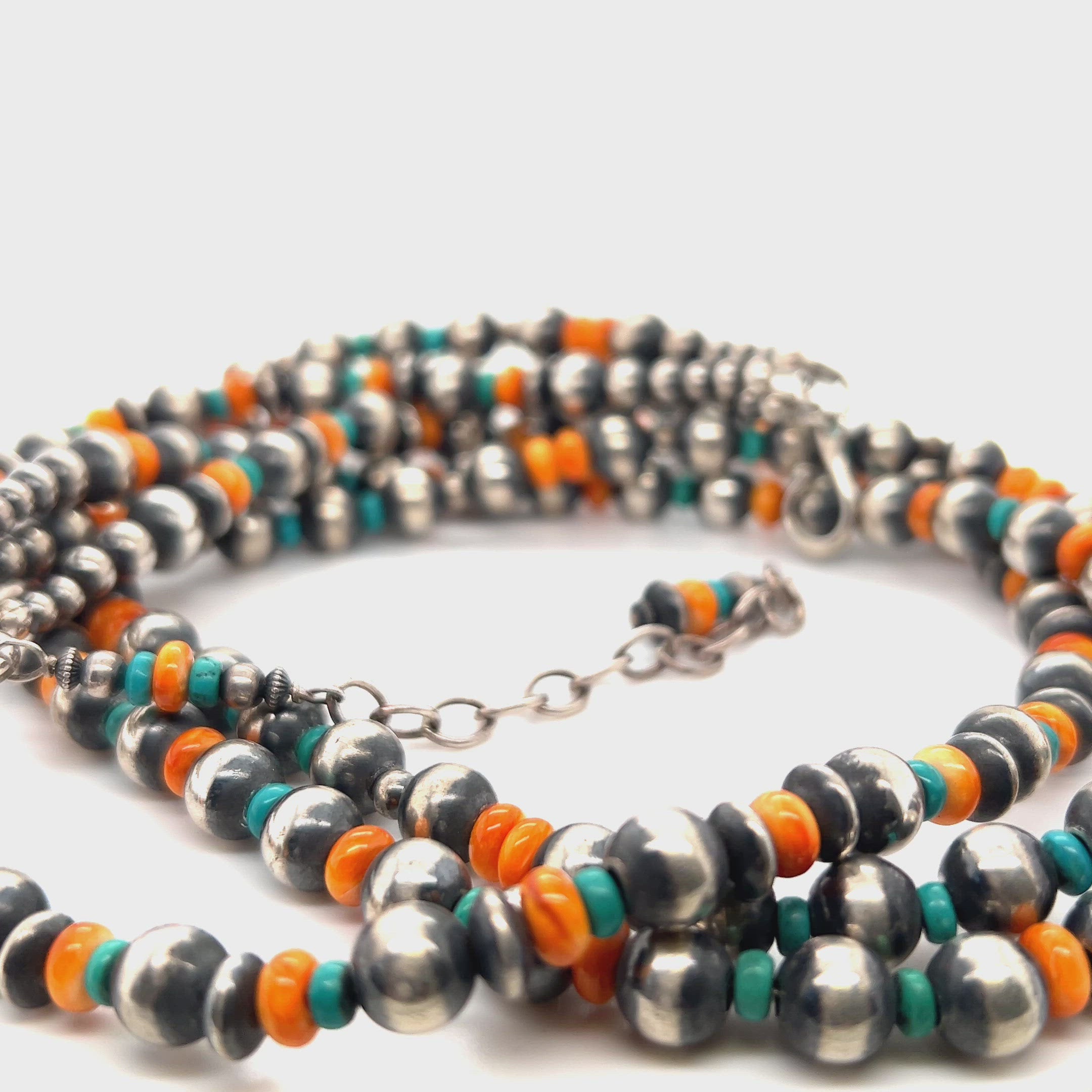 This beautiful handcrafted Native American necklace brings out the perfect contrast with its brilliant sunset shades of the spiny oyster shell and dreamy ocean blues of turquoise. The stunning oxidized silver beads balance the bright stones in a rustic design. Turquoise is an important symbol in the southwest, known for its spiritual powers to calm and cool your emotions while enhancing your intuition and strengthening your aura. The spiny oyster shell builds confidence and carries the energy of the ocean, bringing understanding and peace of mind. This confident necklace is gorgeous for dressing up and down and a fierce piece of jewelry for any collector.