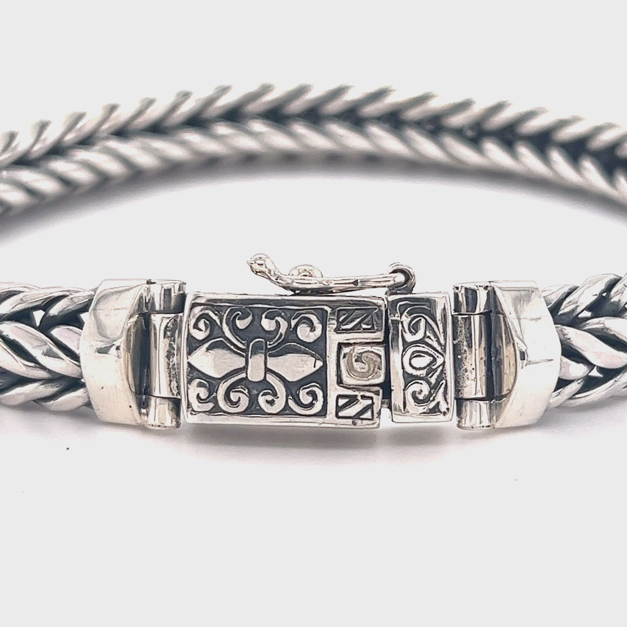This stunning masculine bracelet features a thick, squared braided chain that demands attention. Tastefully made with an appealing detailed clasp, this bracelet is a defined statement piece you won't be disappointed with.