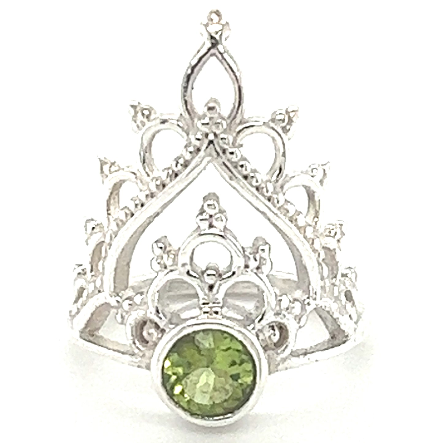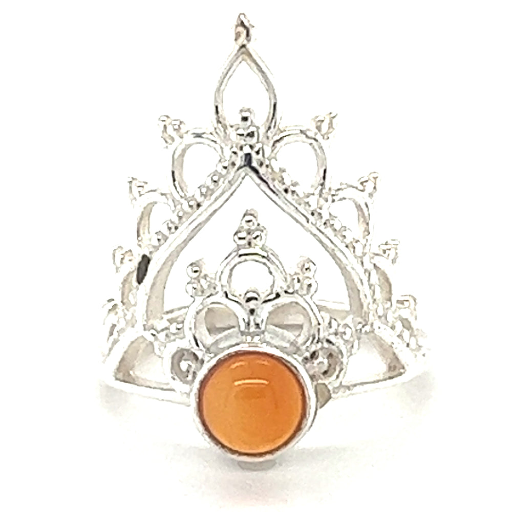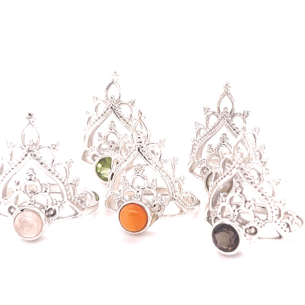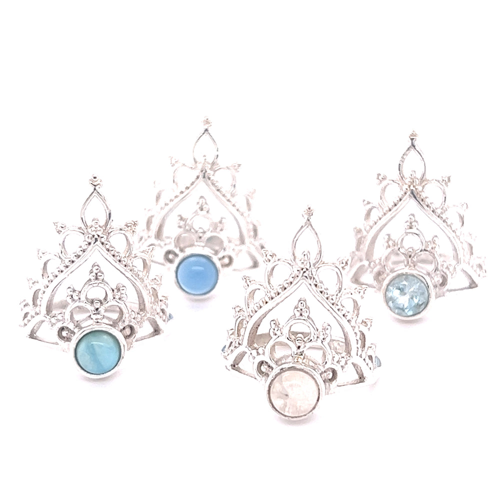 Popular Mandala crown ring with brilliant natural gemstones, so gorgeous when on, you won't want to take it off. The attractive silver work makes this ring unique and a great conversational piece. It comes in various gemstones, including Moonstone, Labradorite, Rose Quartz, Carnelian, Chalcedony, Larimar, Peridot, Smokey Quartz, Blue Topaz, and Amethyst.