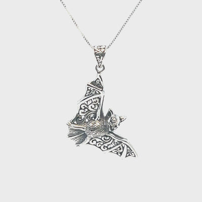 Swoop into a new age with this spellbinding bat pendant. Bats are an age-long symbol of rebirth and transition, abundance and the unseen. These traits have made them long-time companions in the lives of witches and those spiritually inclined. The filigree etching running through the expansive wings gives a unique, romantic, old-world charm. This ornately detailed bat pendant is handcrafted by one of our treasured artisan collections, a mesmerizing and commanding jewelry line that never disappoints. A perfect gift for any nighttime lover.