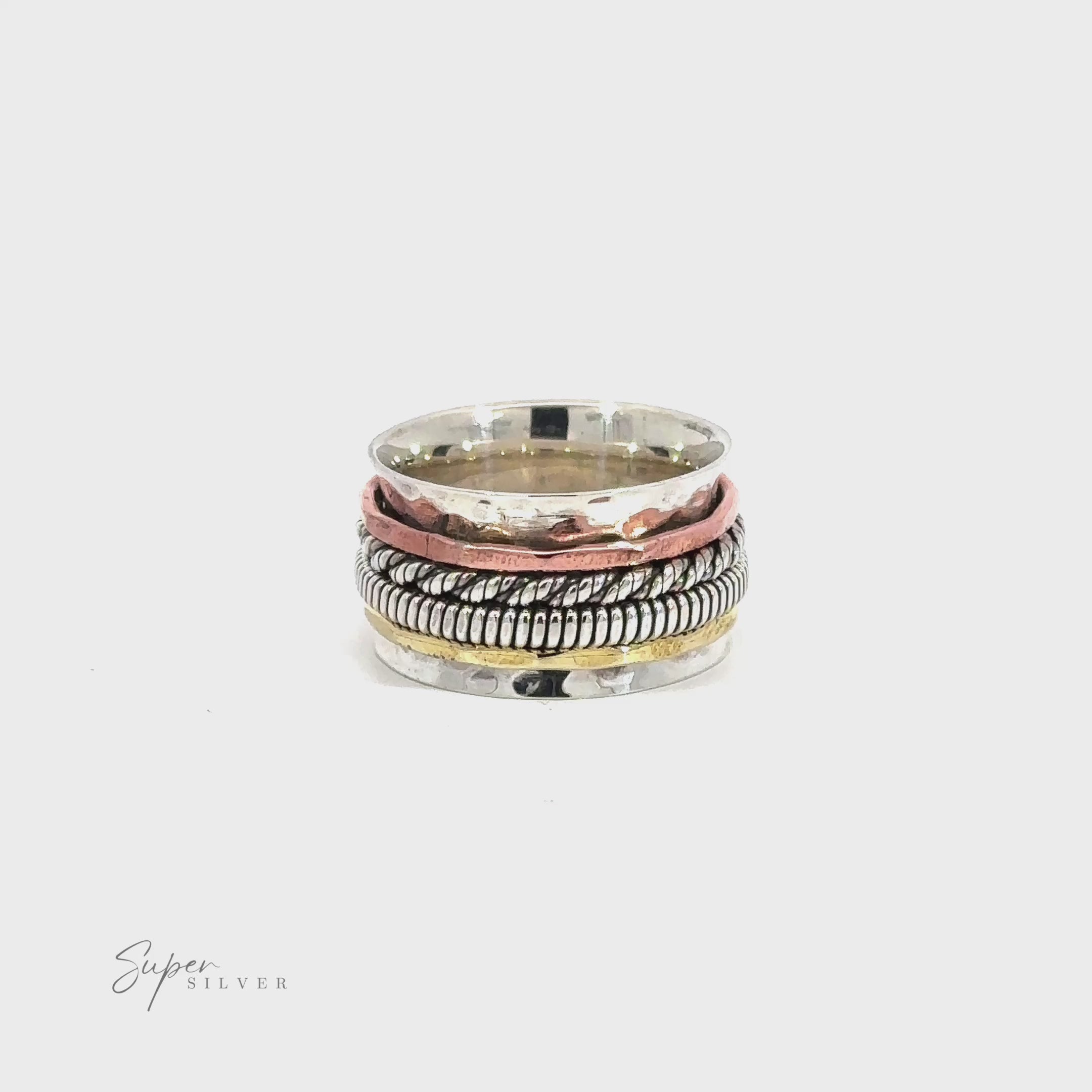 Handmade tricolor spinner ring. Gorgeous hammered concave band with a gold and copper band framing two different rope bands.