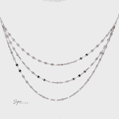 Step into the night with a shimmer that speaks volumes. This elegant Italian necklace features three delicate strands that glisten like mirrors in motion, finished in radiant rhodium for lasting shine. Lightweight and refined, it’s the perfect piece to elevate any look—subtle enough for a dinner date, yet striking enough to turn heads. Sleek, modern, and full of quiet glam.