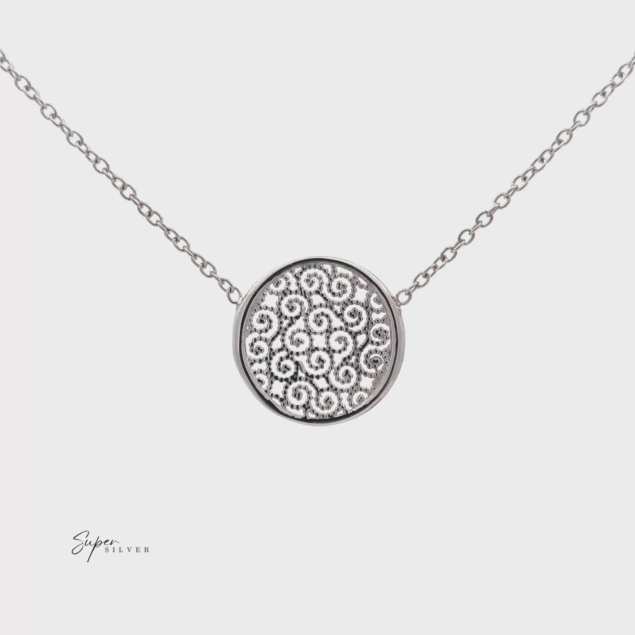 Where vintage charm meets modern shine. This Italian-made necklace features a delicate round medallion with intricate filigree detailing, finished in luminous rhodium for lasting brilliance. The lace-like pattern adds a romantic, old-world touch to a sleek, minimalist chain—making it the perfect piece to dress up your everyday look or add quiet elegance to a layered stack. Lightweight, timeless, and full of artistry.