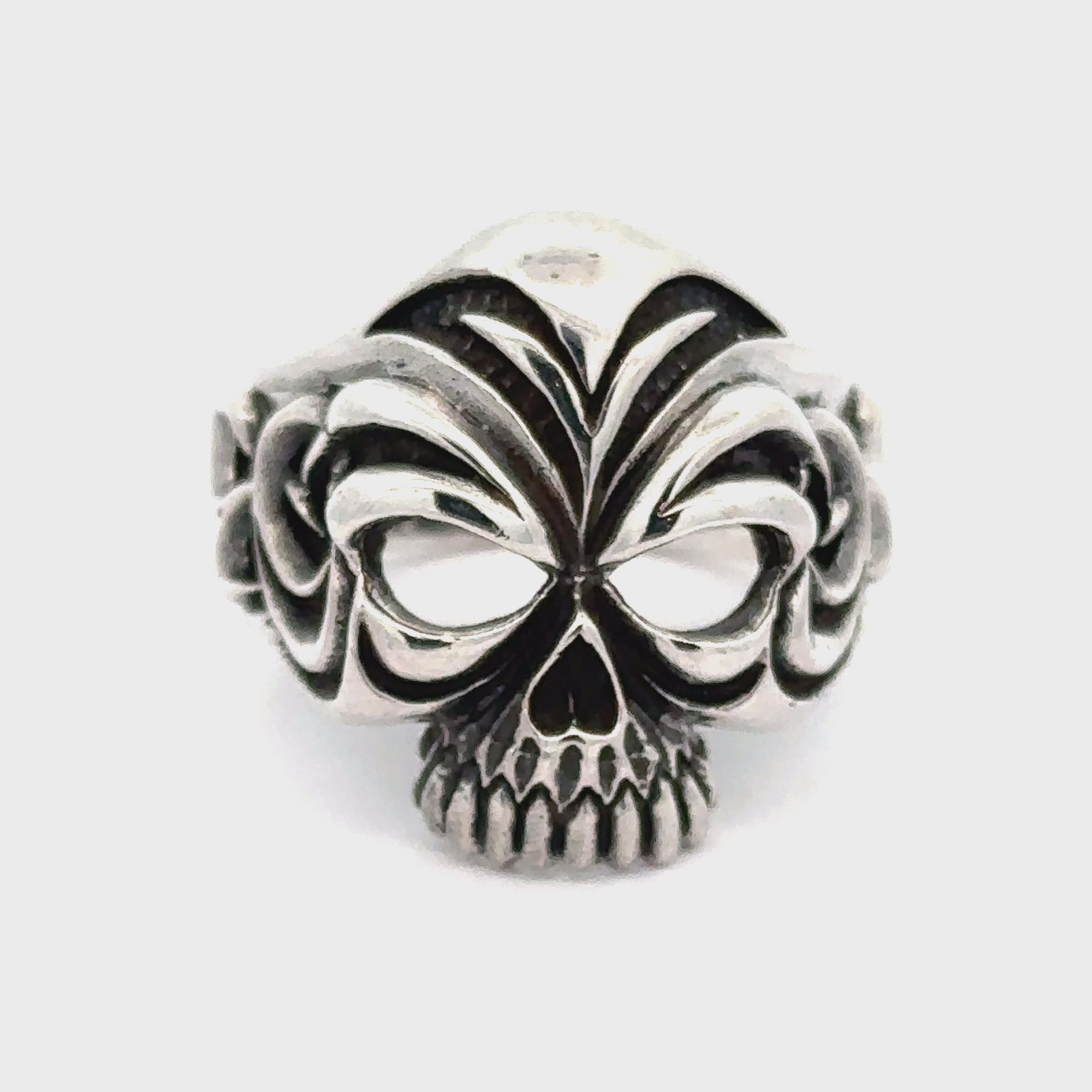 Unleash your inner rebel with our large skull ring, featuring intricate filigree carvings on the face and sides. This unique and edgy piece exudes a dark, mysterious charm that sets it apart from the ordinary. Perfect for those who embrace their bold and fearless style, this striking ring makes a powerful statement wherever you go. Add a touch of daring elegance to your collection with this captivating skull ring.