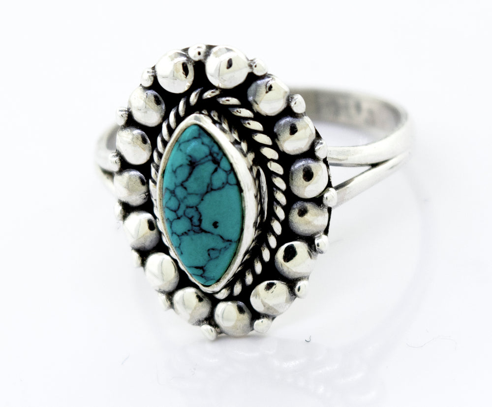 Beautiful and vibrant marquise shape turquoise stone set in a beaded design silver setting.