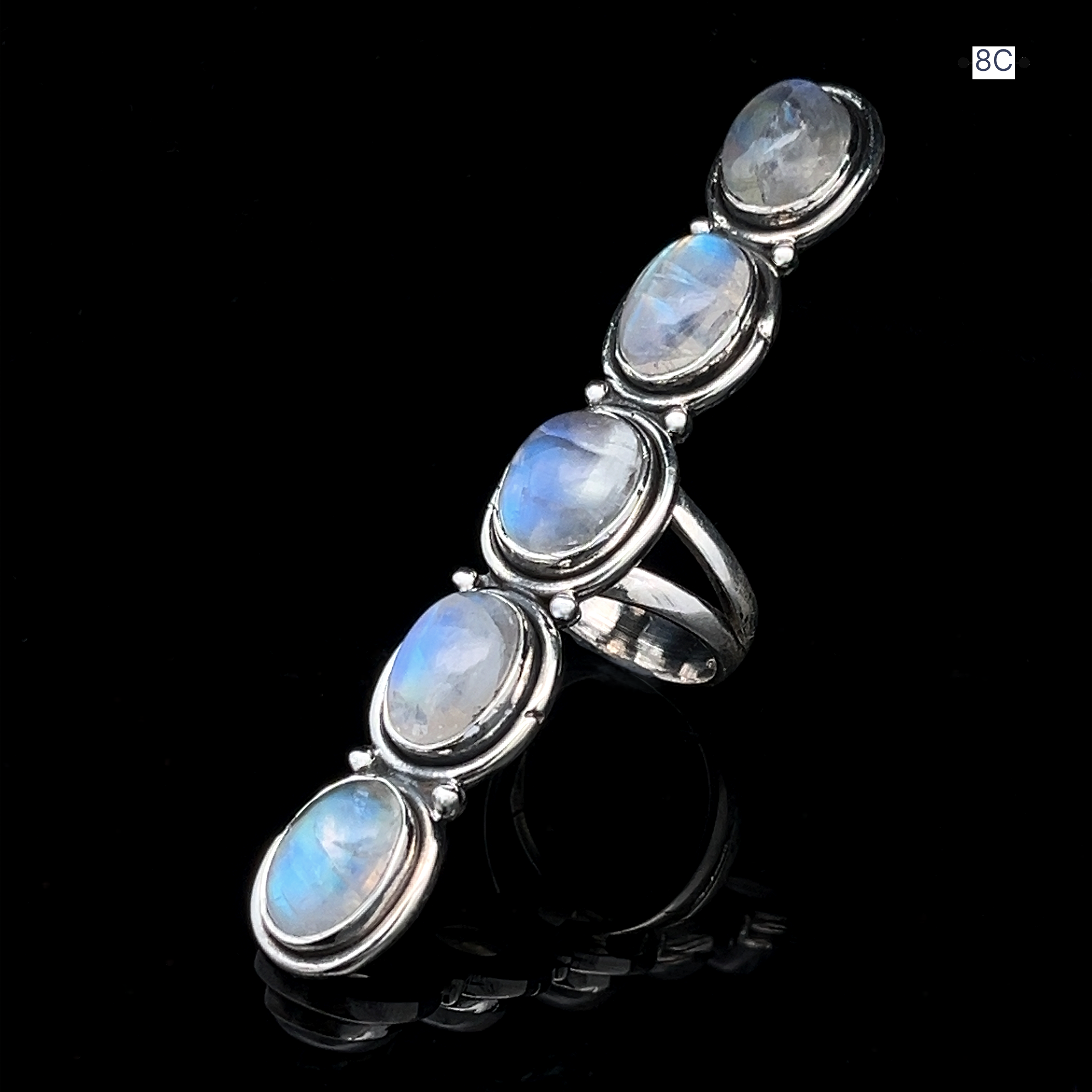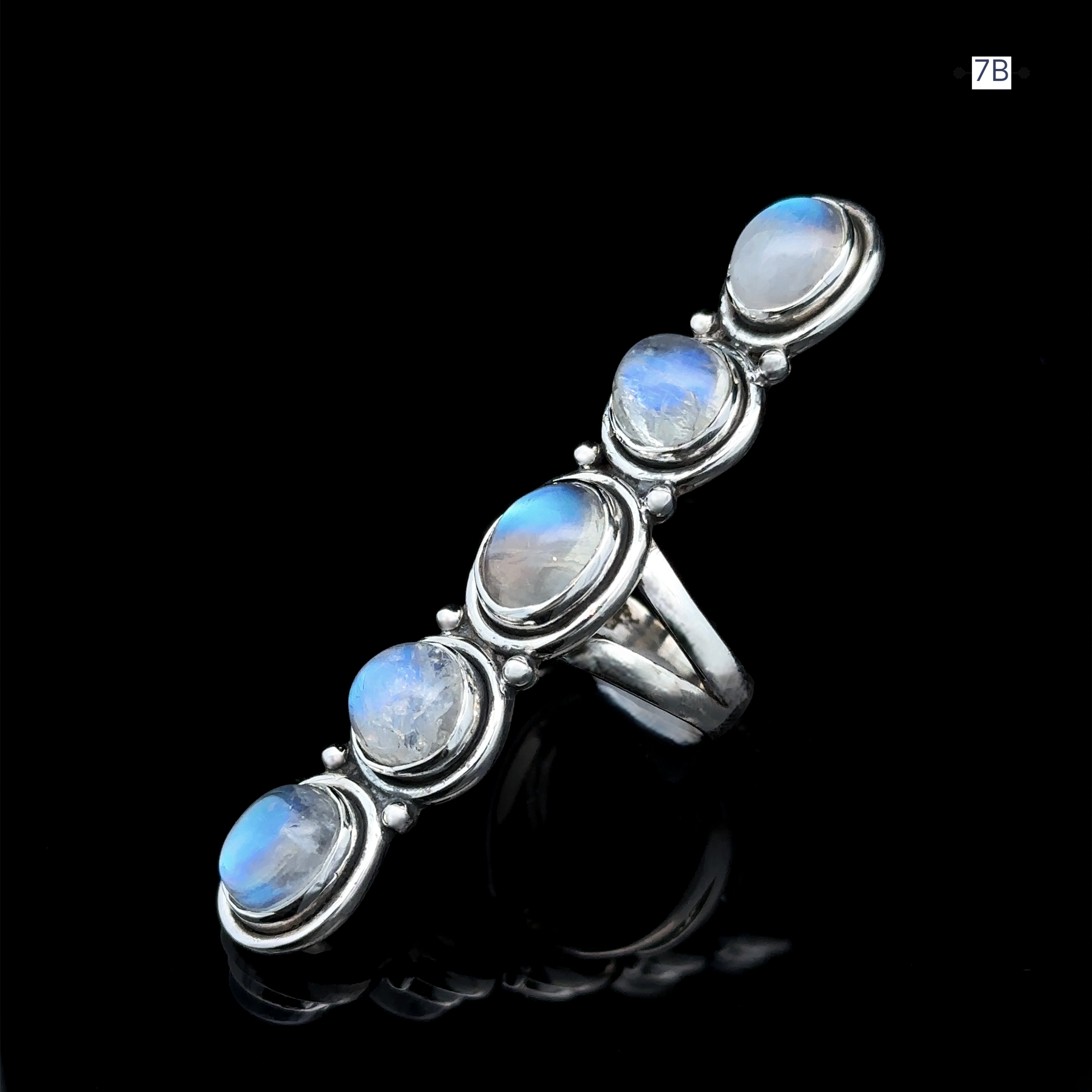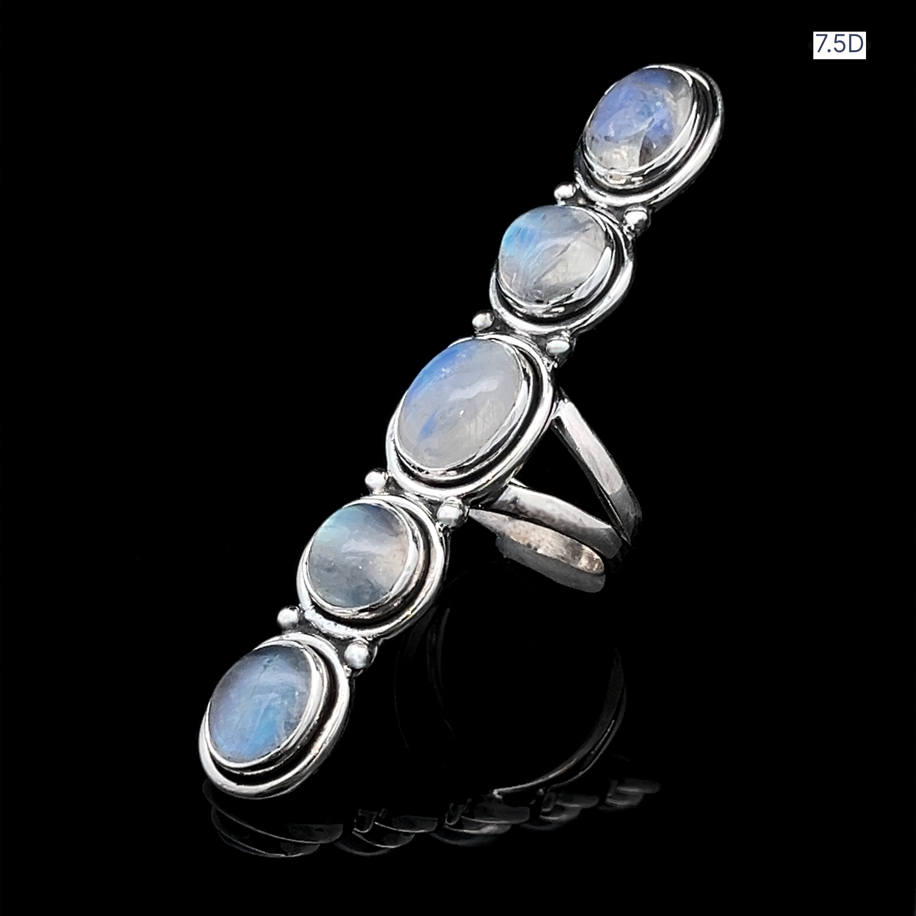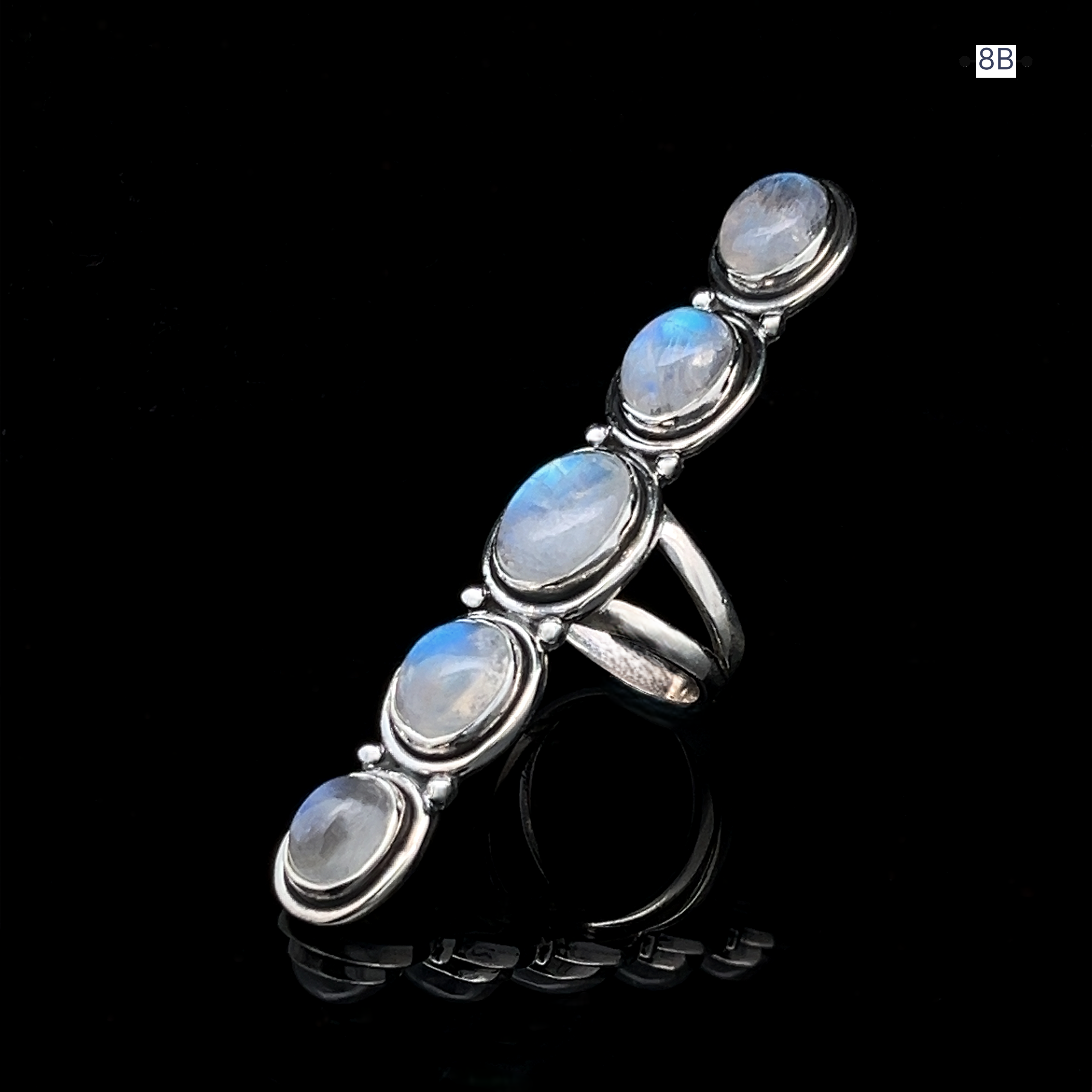 Channel your inner goddess. This stunning bohemian ring features a dramatic vertical row of glowing blue moonstones set in sterling silver—each one shimmering with ethereal light. With its long, finger-hugging silhouette and eye-catching design, it’s a true statement piece that radiates magic, mystery, and fierce feminine energy. A must-have for moon lovers and bold souls alike.