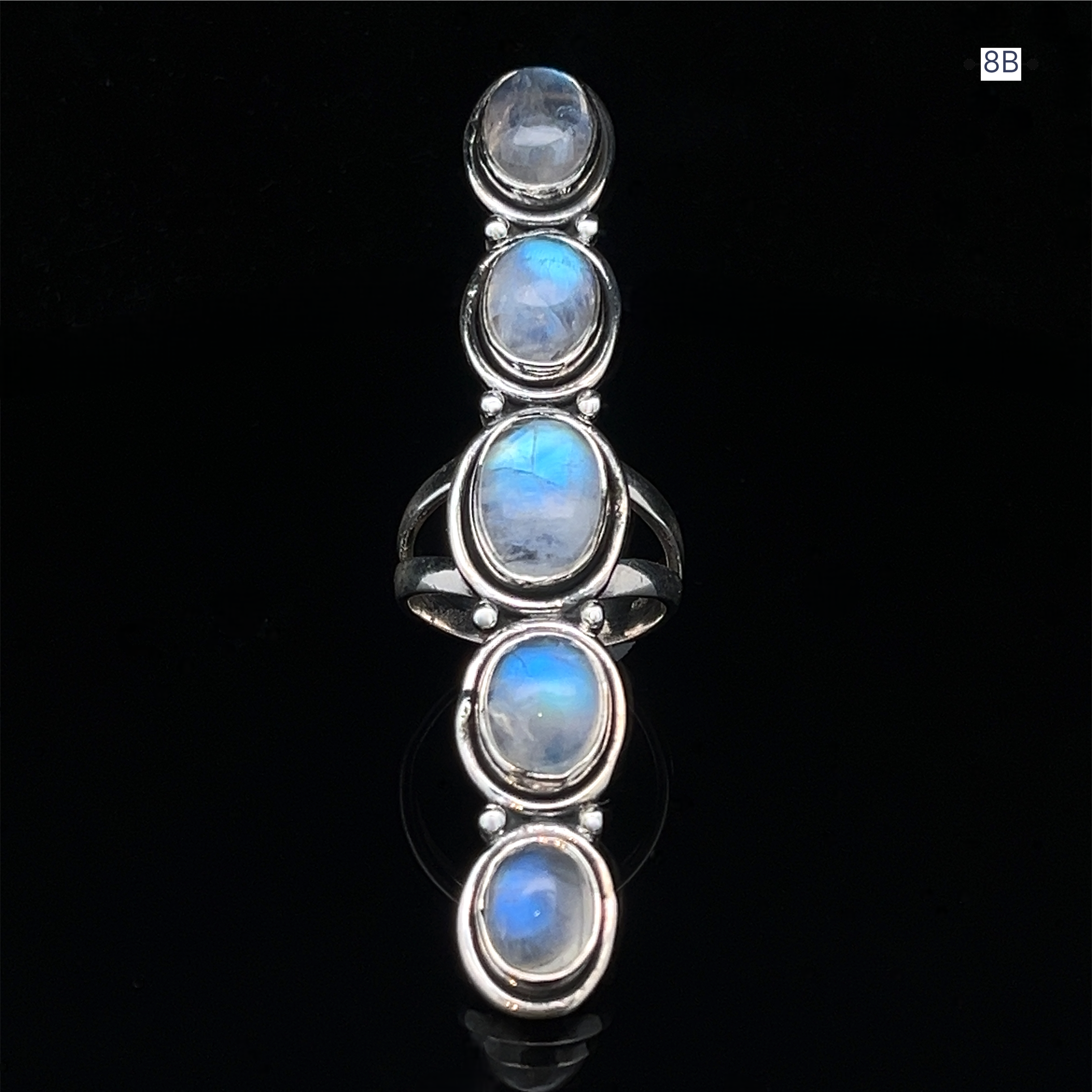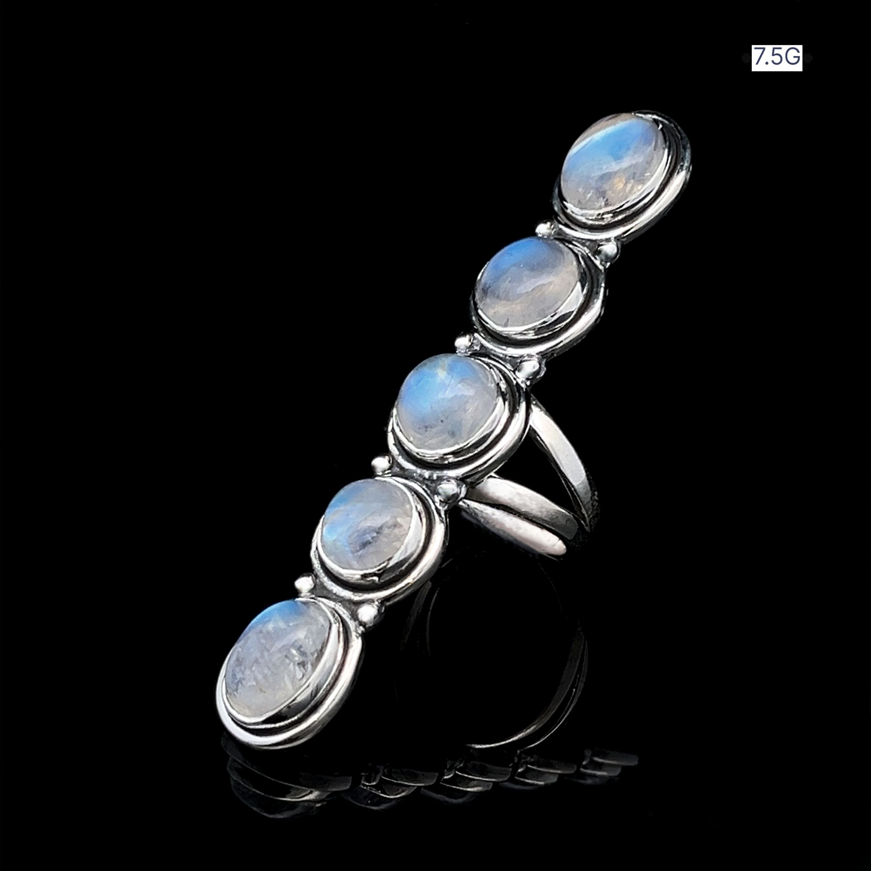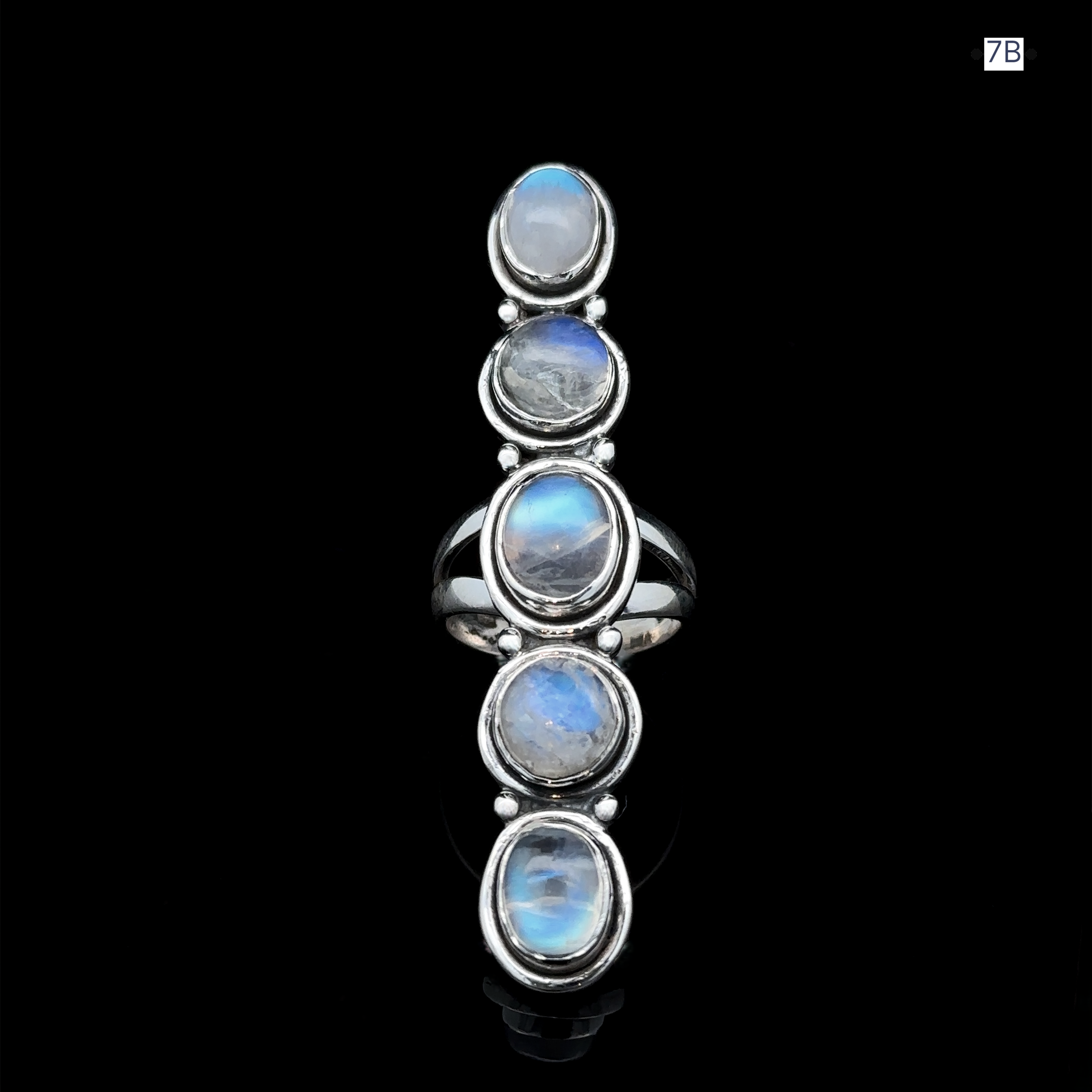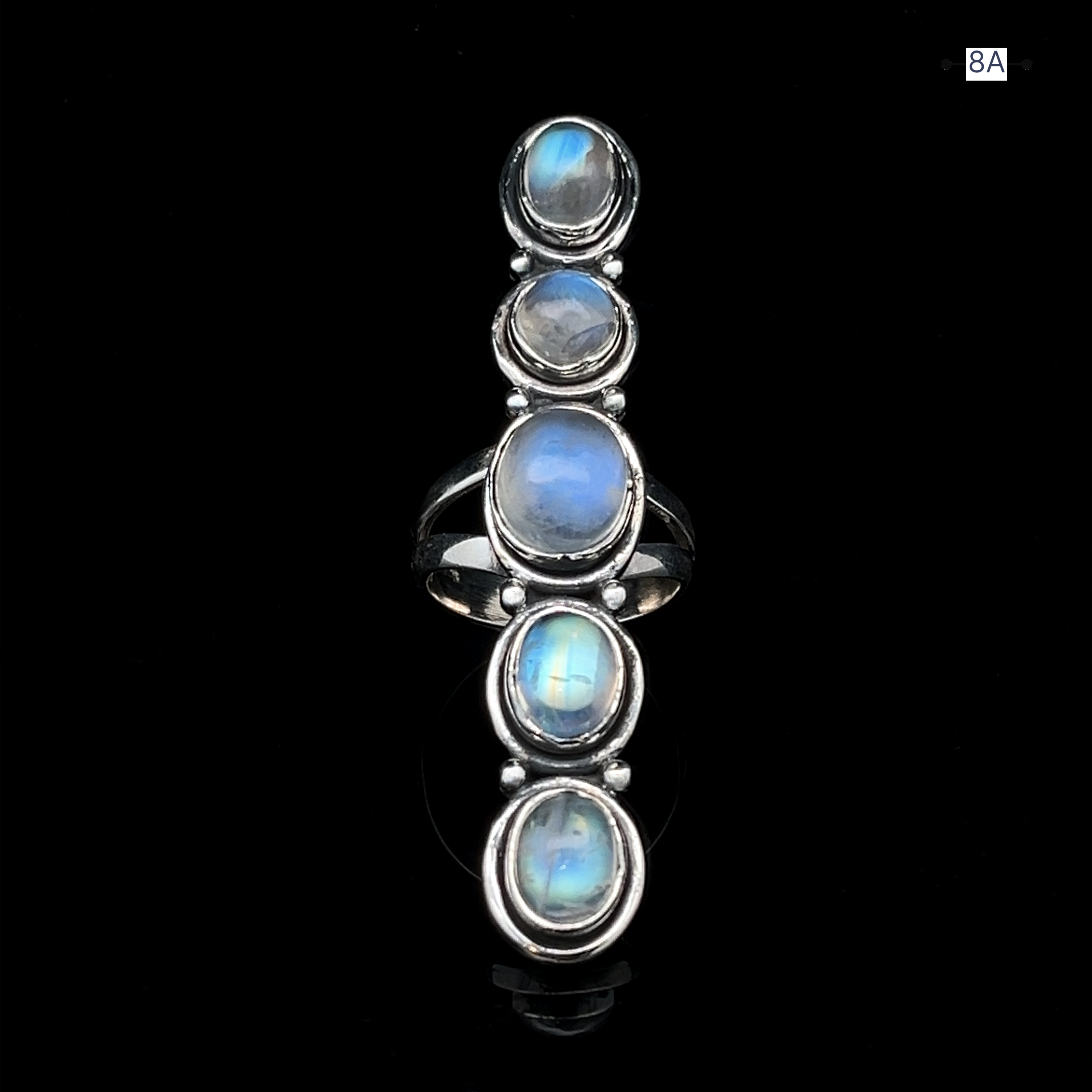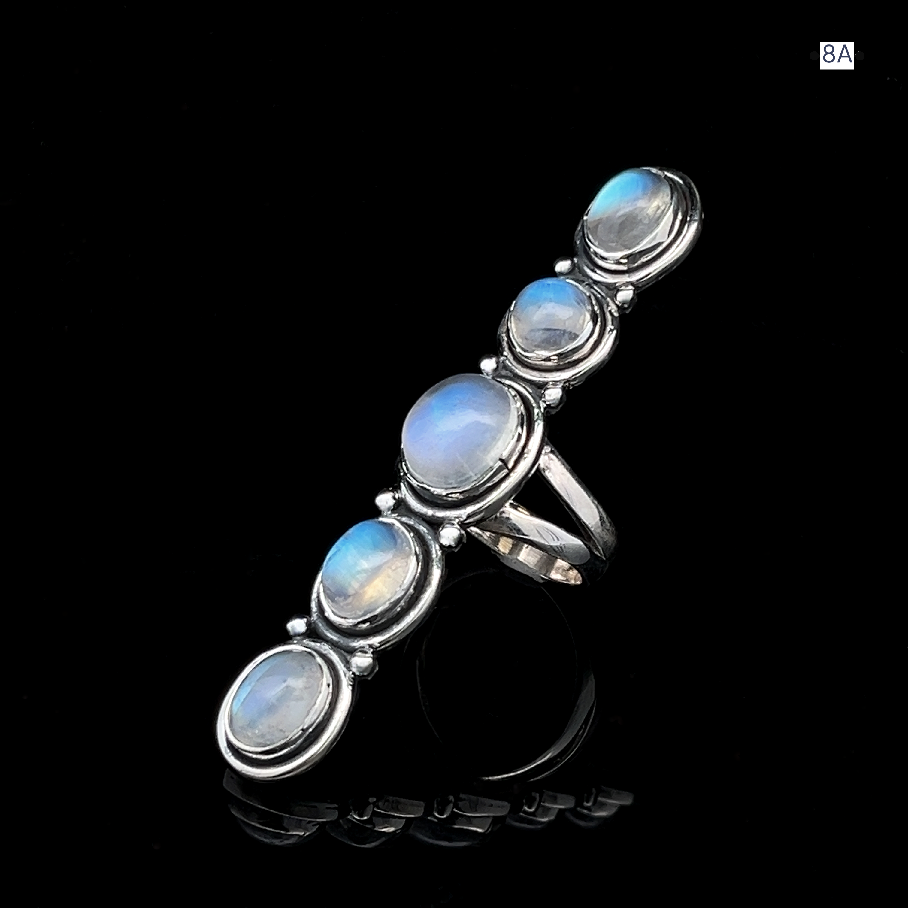Channel your inner goddess. This stunning bohemian ring features a dramatic vertical row of glowing blue moonstones set in sterling silver—each one shimmering with ethereal light. With its long, finger-hugging silhouette and eye-catching design, it’s a true statement piece that radiates magic, mystery, and fierce feminine energy. A must-have for moon lovers and bold souls alike.