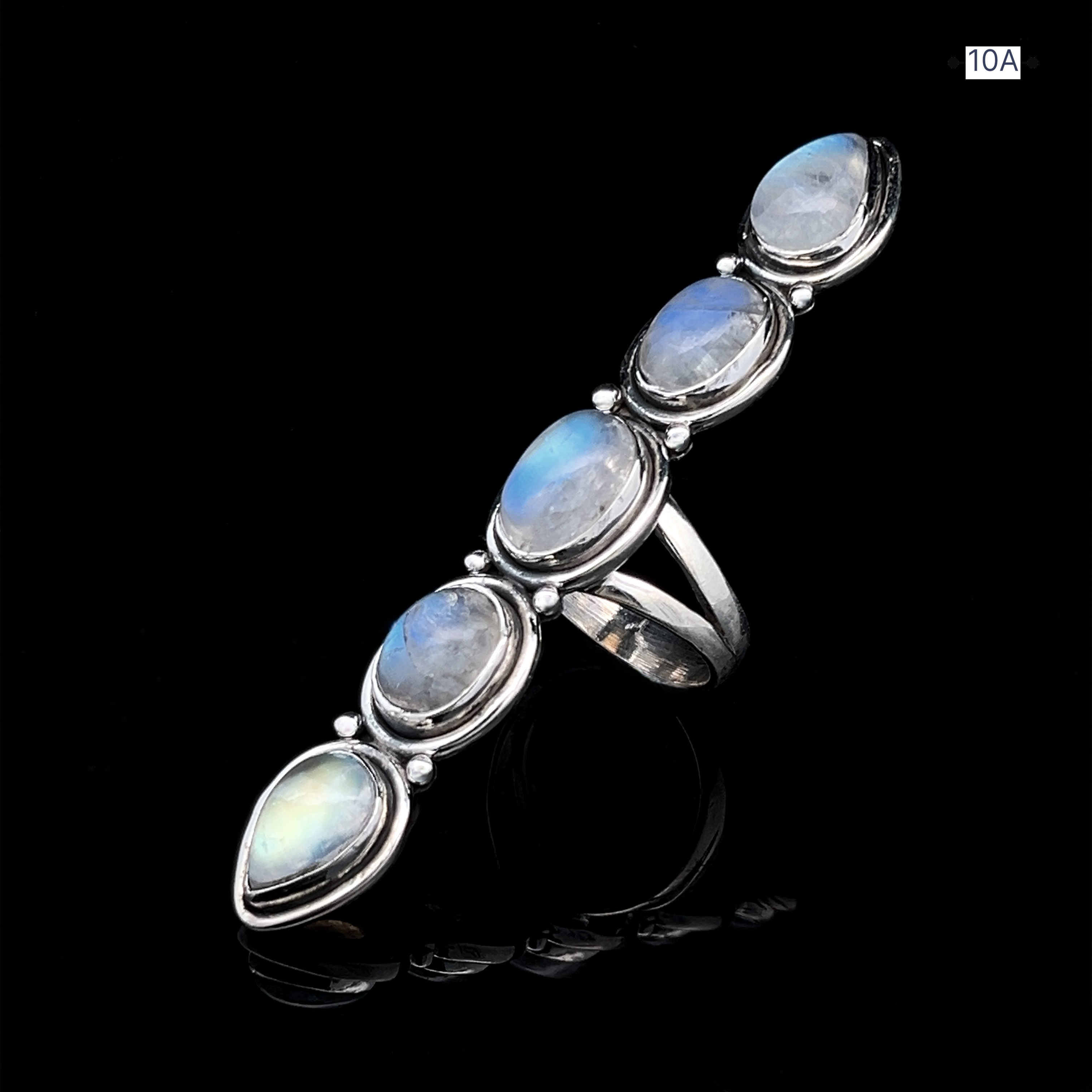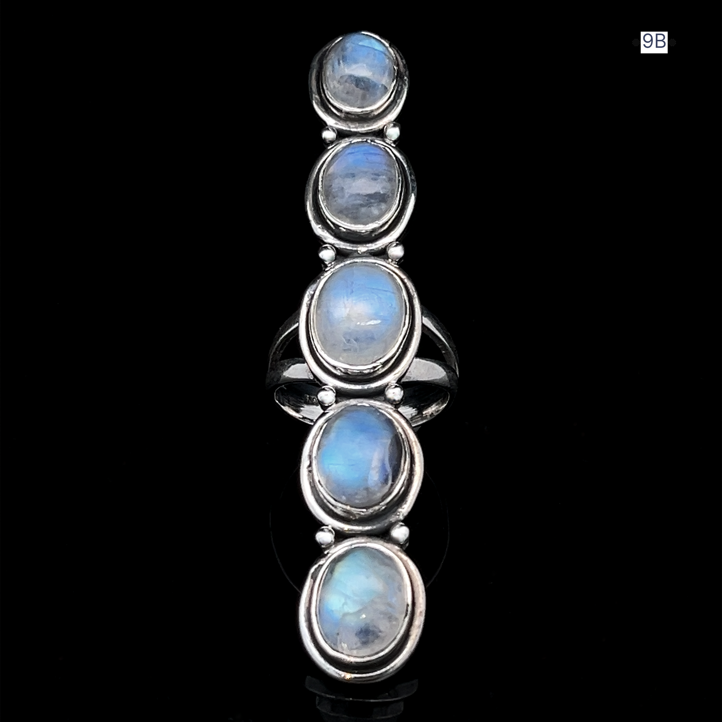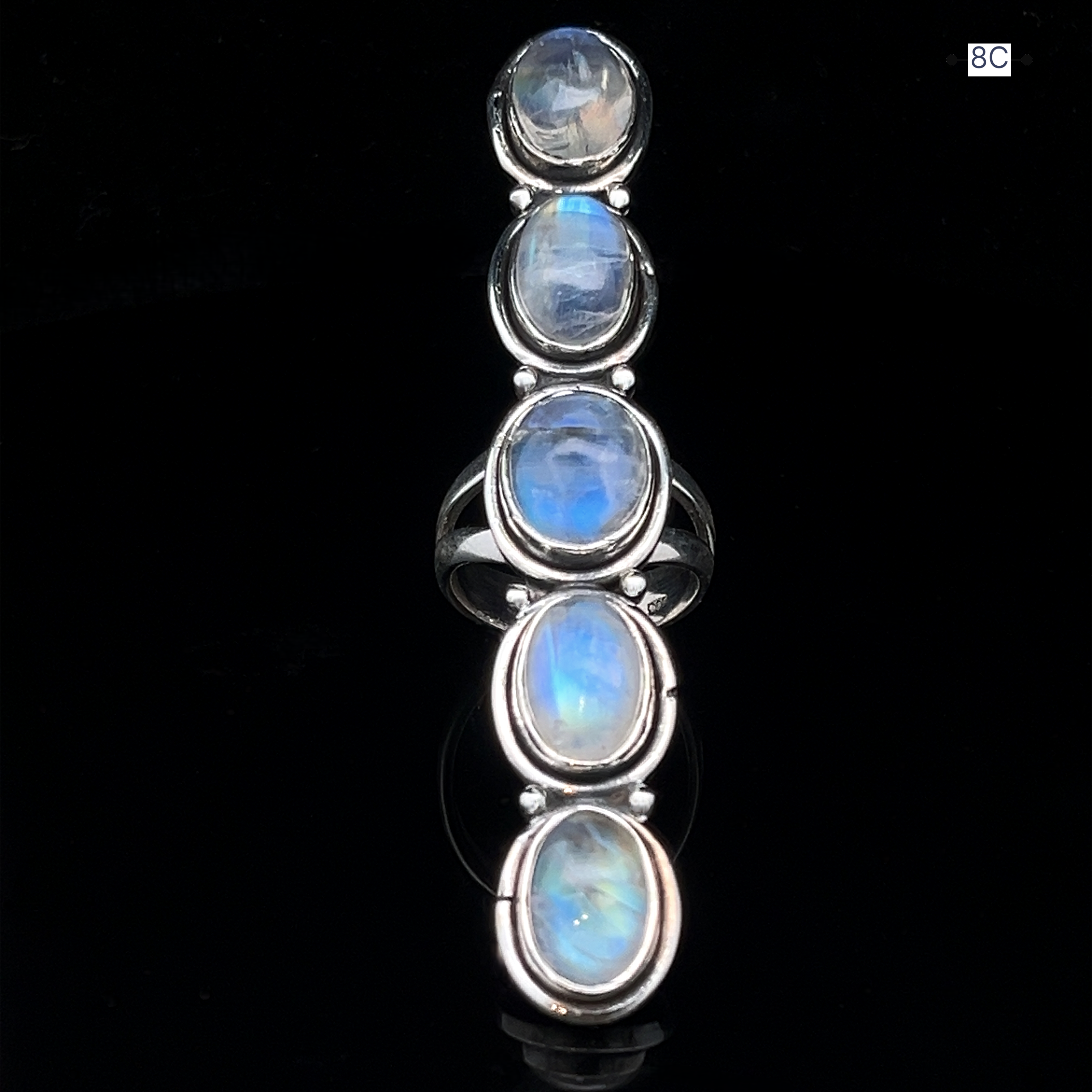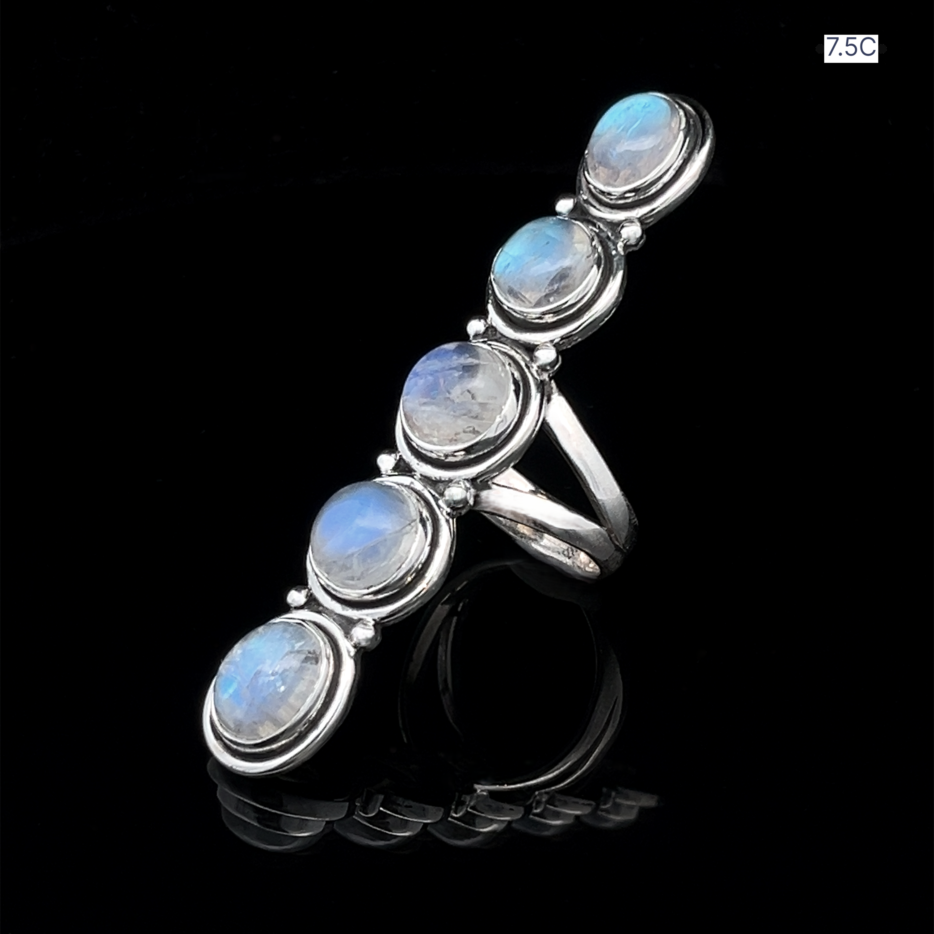 Channel your inner goddess. This stunning bohemian ring features a dramatic vertical row of glowing blue moonstones set in sterling silver—each one shimmering with ethereal light. With its long, finger-hugging silhouette and eye-catching design, it’s a true statement piece that radiates magic, mystery, and fierce feminine energy. A must-have for moon lovers and bold souls alike.