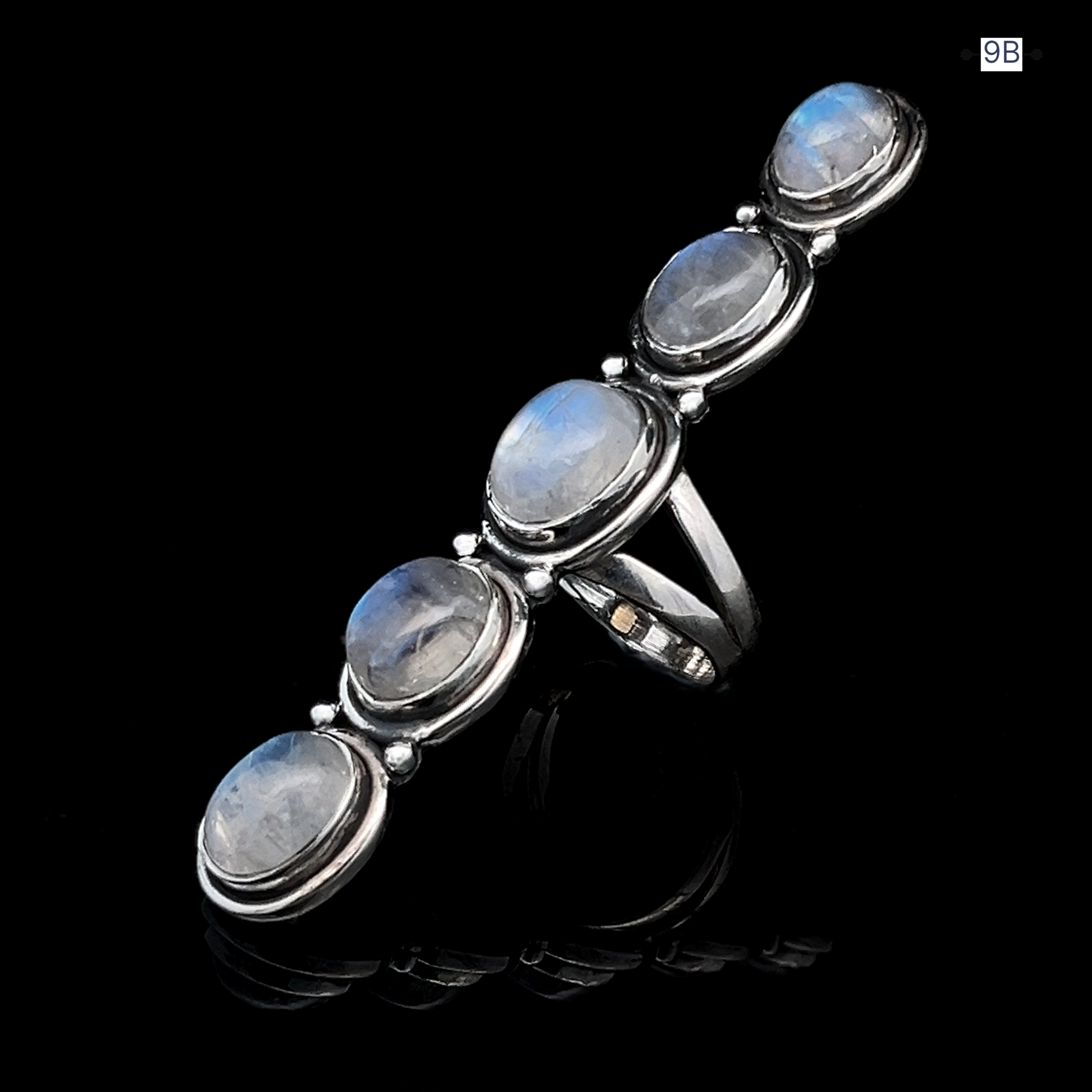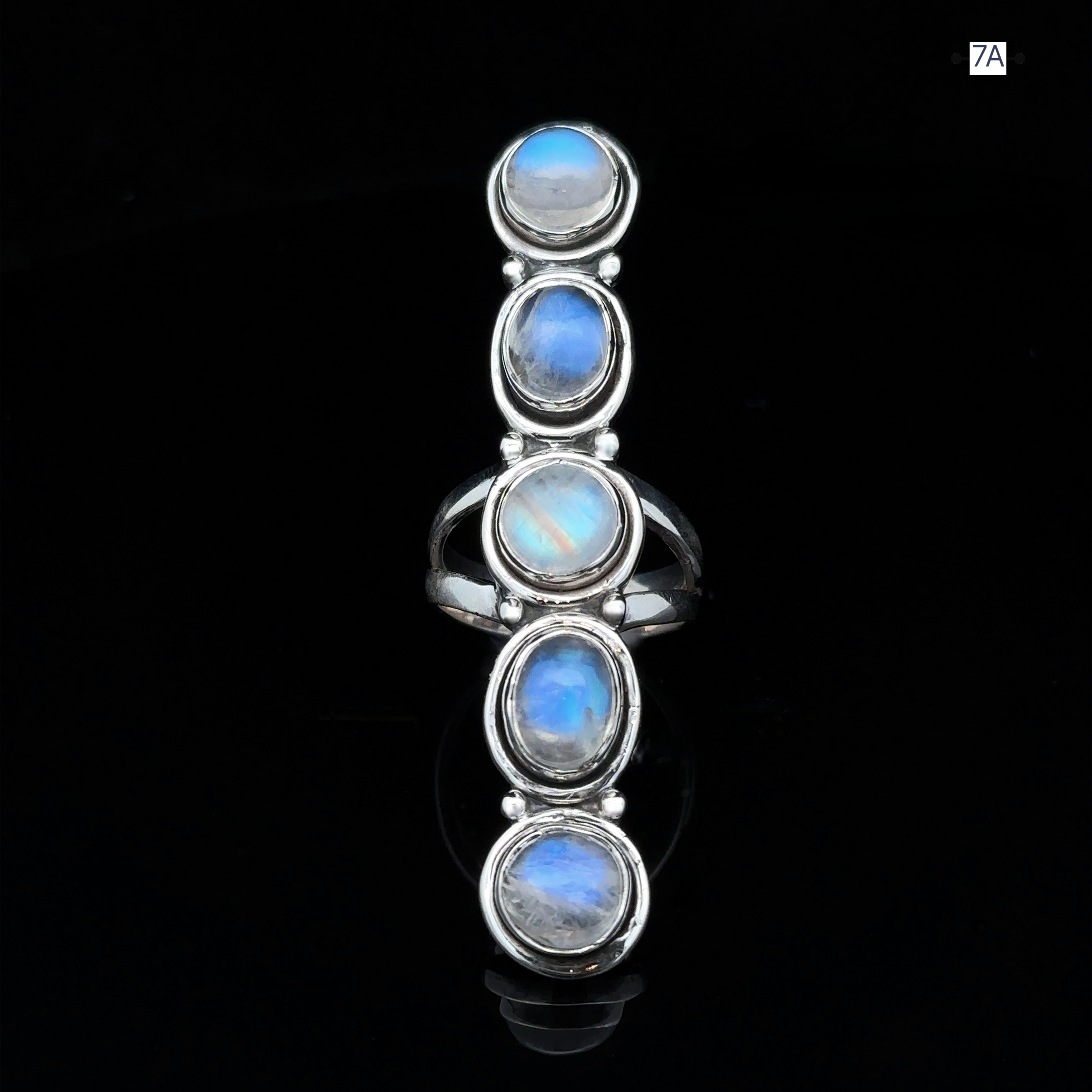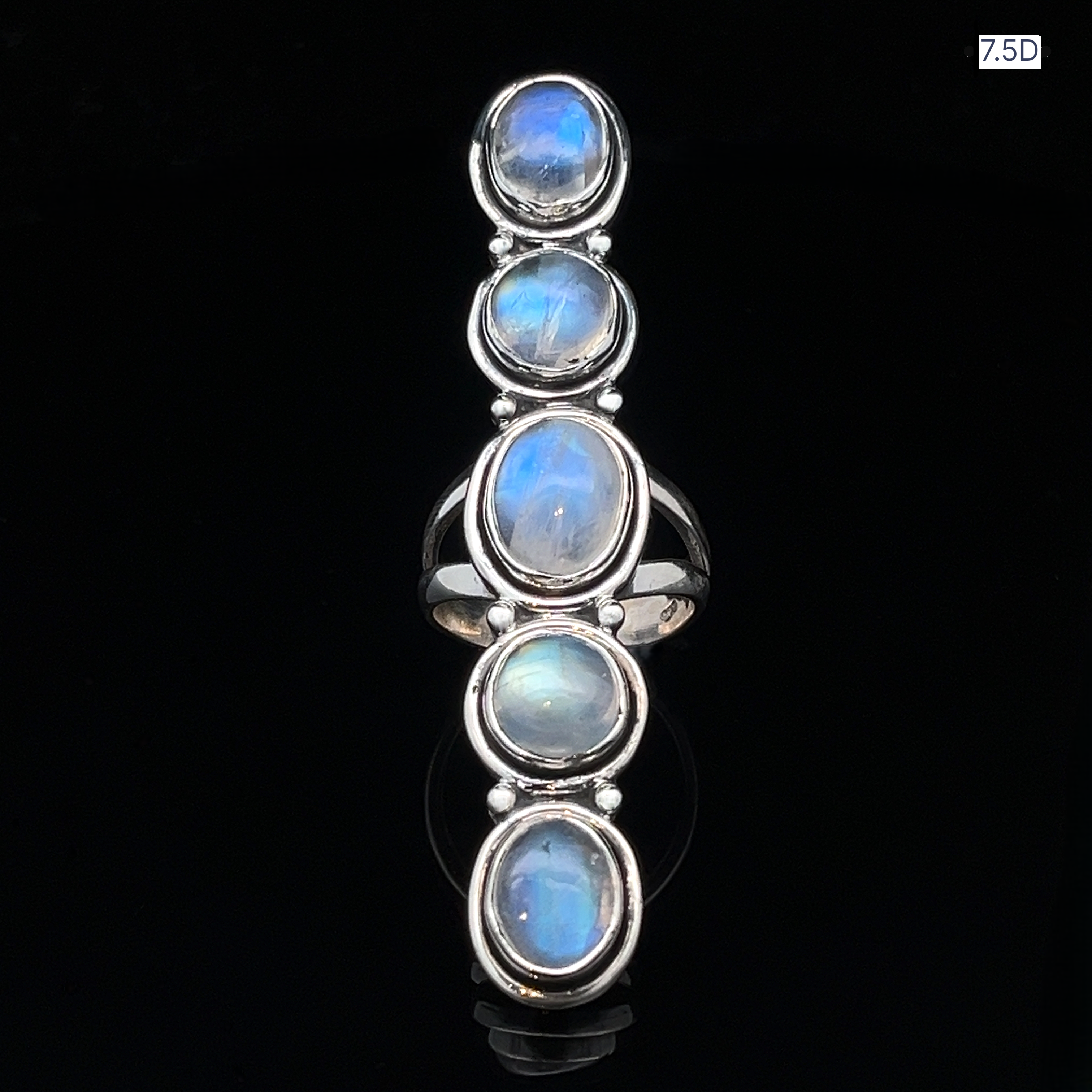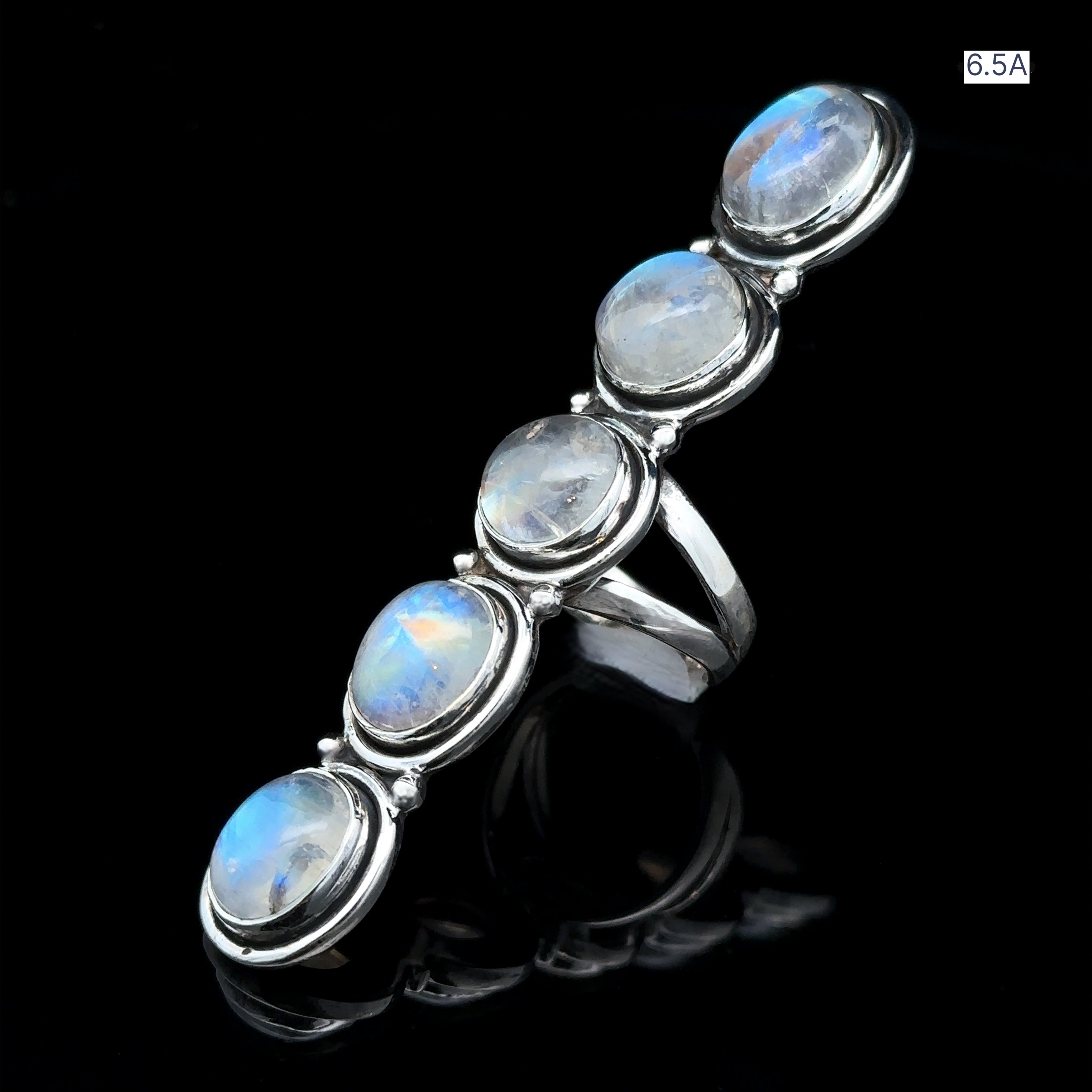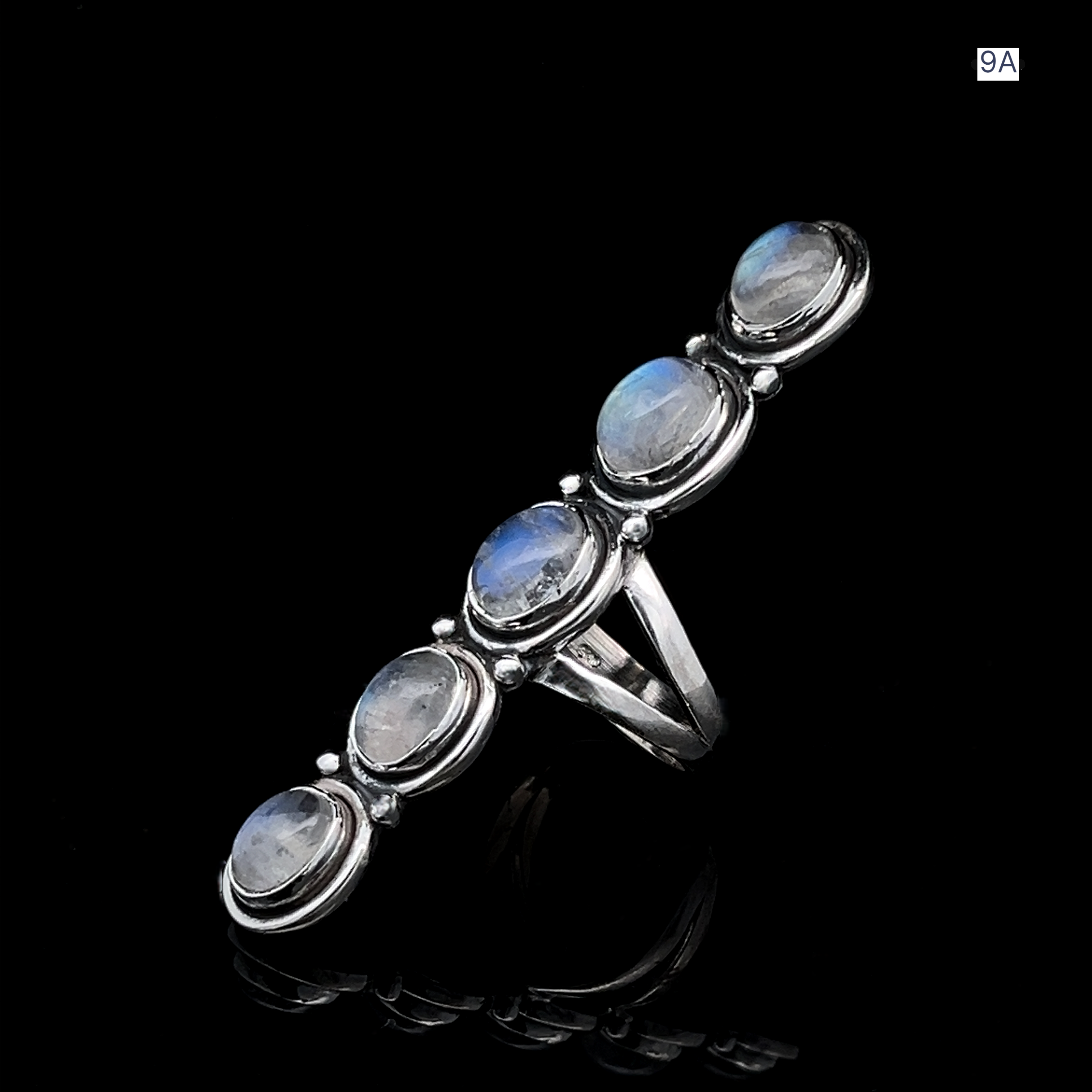 Channel your inner goddess. This stunning bohemian ring features a dramatic vertical row of glowing blue moonstones set in sterling silver—each one shimmering with ethereal light. With its long, finger-hugging silhouette and eye-catching design, it’s a true statement piece that radiates magic, mystery, and fierce feminine energy. A must-have for moon lovers and bold souls alike.