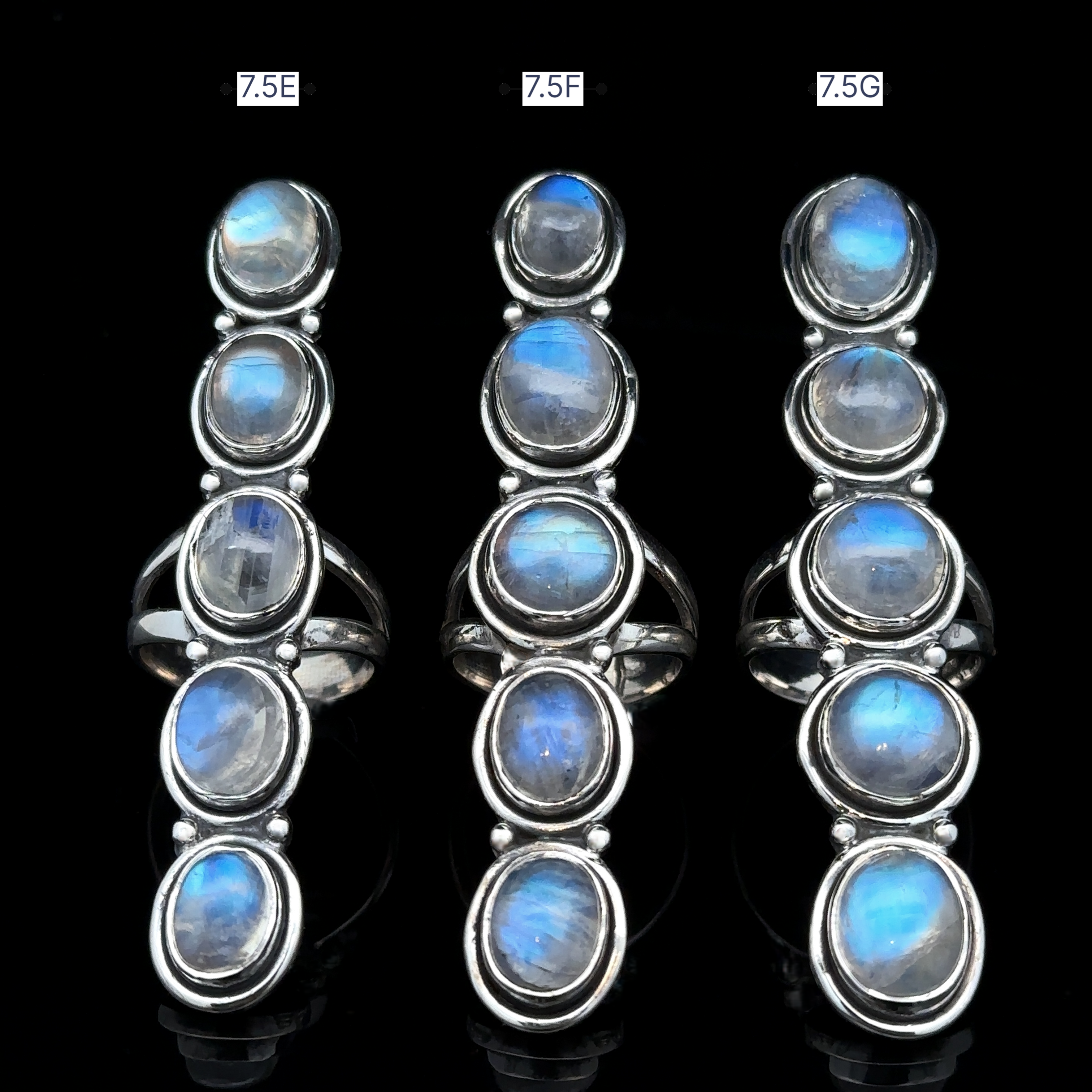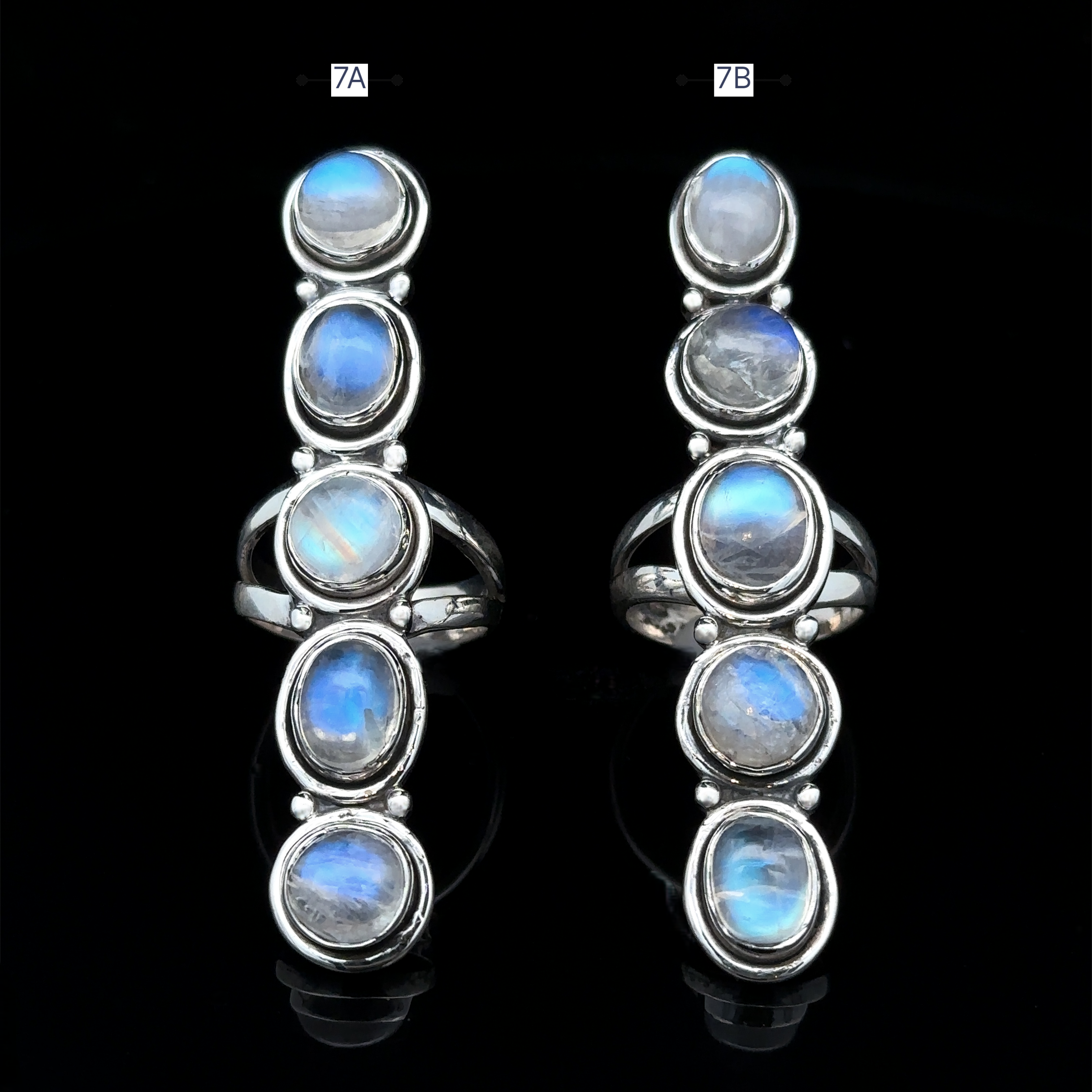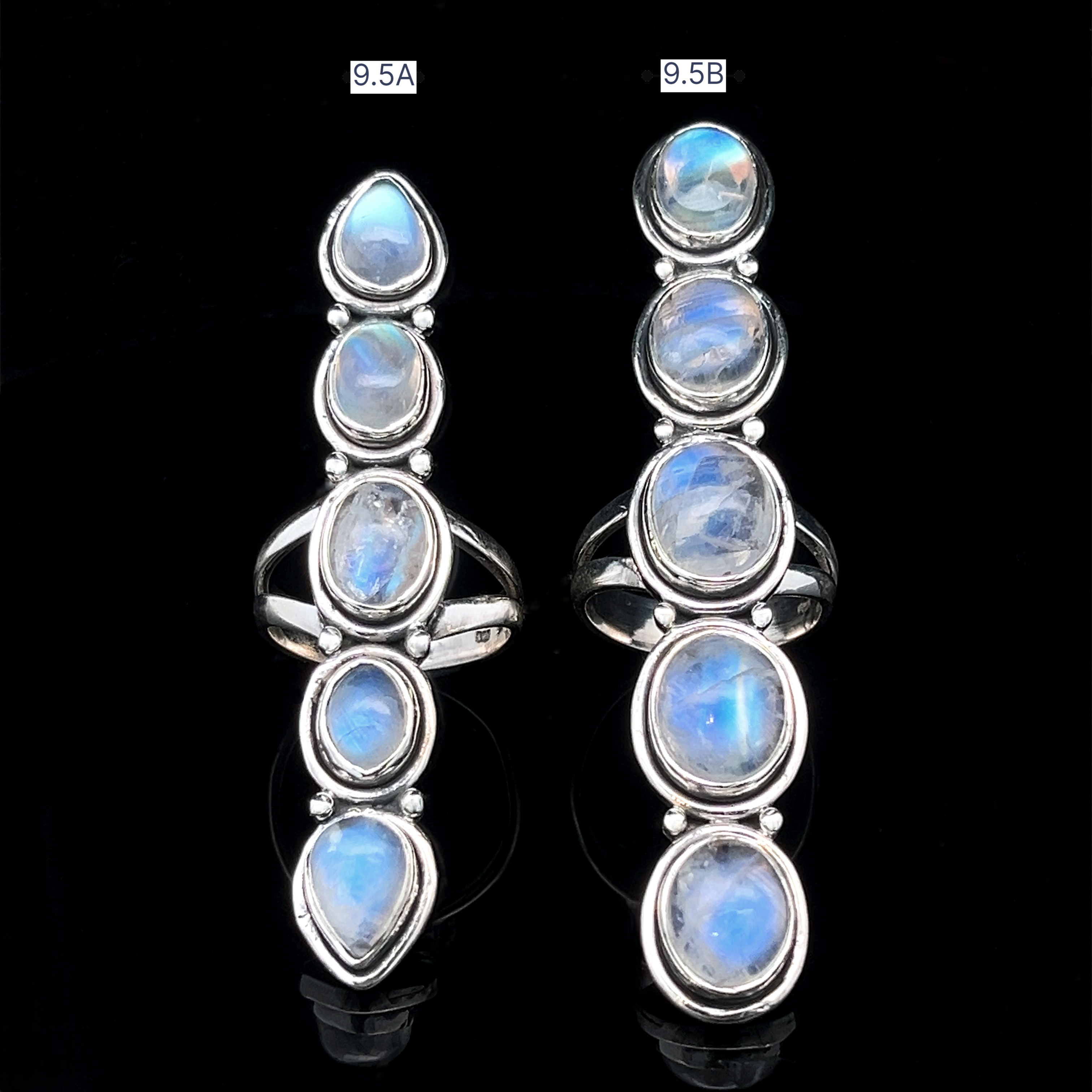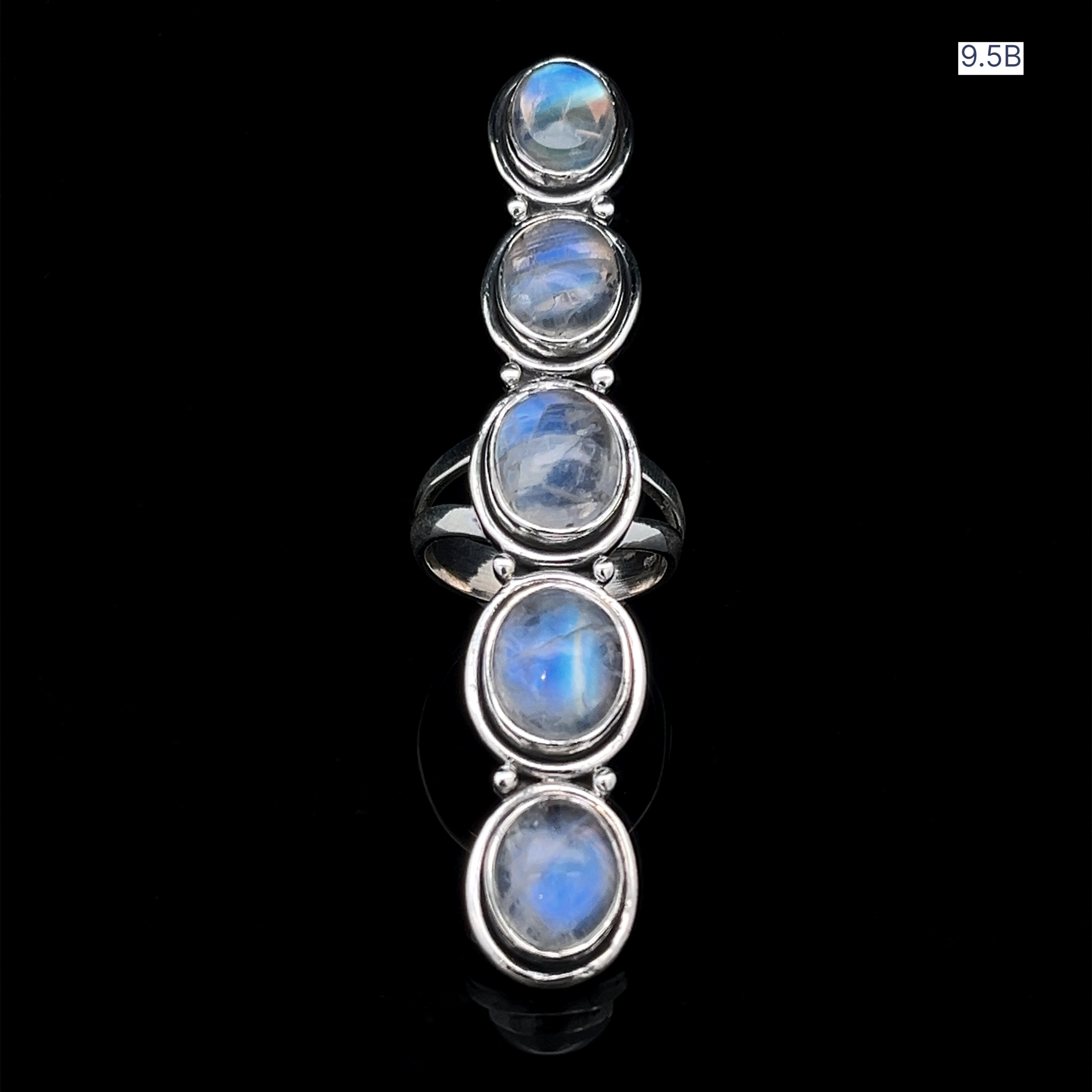 Channel your inner goddess. This stunning bohemian ring features a dramatic vertical row of glowing blue moonstones set in sterling silver—each one shimmering with ethereal light. With its long, finger-hugging silhouette and eye-catching design, it’s a true statement piece that radiates magic, mystery, and fierce feminine energy. A must-have for moon lovers and bold souls alike.