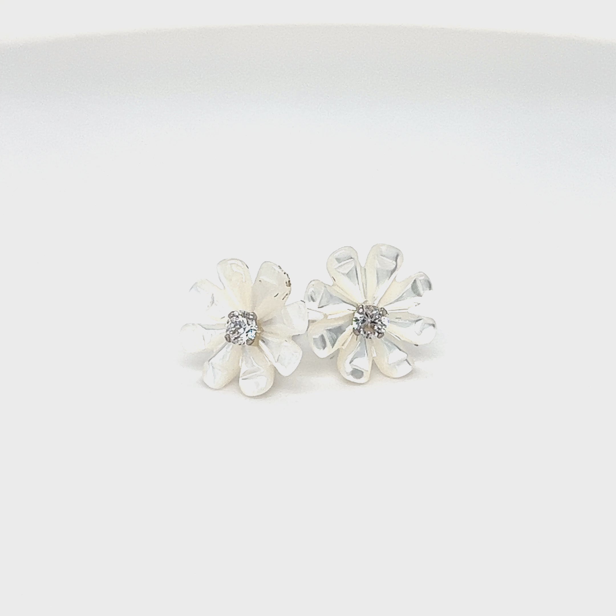 Adorn your ears with our unique studs featuring a delicate Mother of Pearl flower with a sparkling Cubic Zirconia center. These earrings effortlessly blend natural elegance and unique charm, with the milky white sheen of the mother of pearl creating a captivating contrast with the glistening cubic zirconia. Their simplicity and timeless beauty make them a striking accessory that resonates with the allure of nature. These studs are a stylish option, capturing the beauty and charm of a blossoming flower, making them a delightful addition to any outfit.