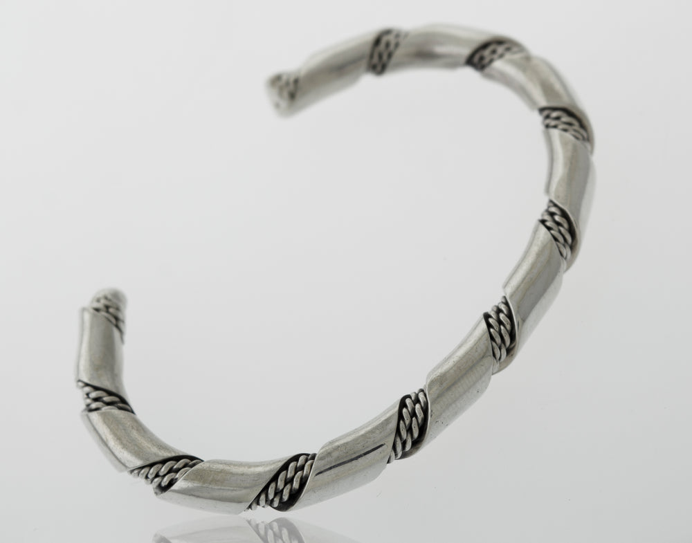 Native American Handmade Thick Silver Twist Cuff with twisted rope detailing on one side. The bracelet is open-ended, featuring a polished finish. This stunning statement piece carries a touch of Native American influence.
