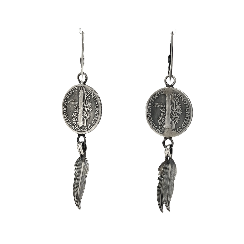 Silver earrings made from 2 Mercury dimes. Mercury dimes were minted from 1916 to 1945. It is more correctly known as the Winged Liberty Head Dime. Depicts young liberty, who is regularly mistaken as Mercury, the Roman god.