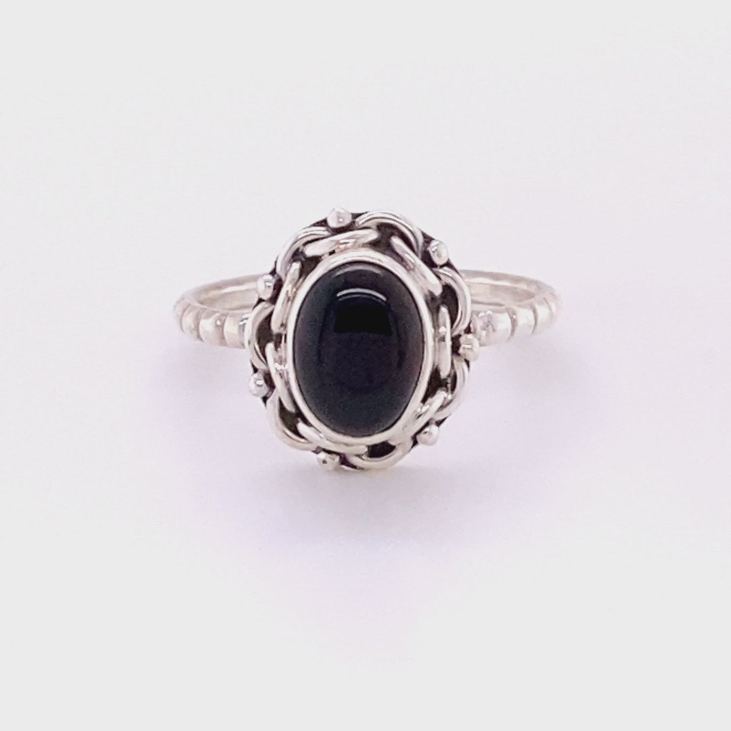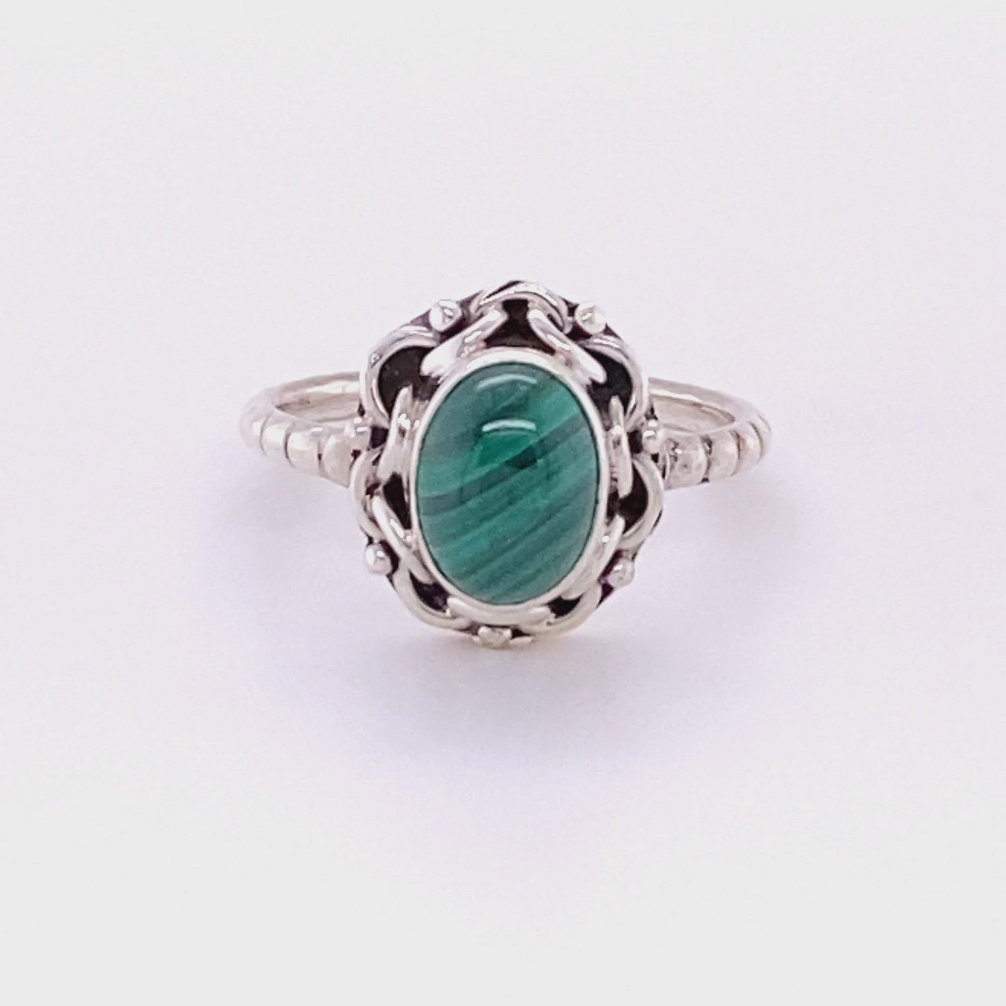 An attractive Bali-styled oval gemstone ring radiates with vintage charm. The brawny unique chain and rope setting add a little pizzazz to this timeless design. This captivating ring comes in three varieties, each with its own unique boho, hippy-chic spirit. Choose one of the earthy greens of malachite or aventurine. Malachite's unusual banding pattern makes each stone is its own unique piece of art with a natural silky luster that shines. The warmth of aventurine radiates with its translucence, soft and subtle glow. Revered for their healing properties, malachite and aventurine absorb environmental pollution, strengthen the wearer, and promote growth. Or choose the fierce and mysterious black onyx, which is used to quiet powerful emotions, and purify your energy. Either way, you'll have a stylish ring that can be worn on its own or paired with a friend.