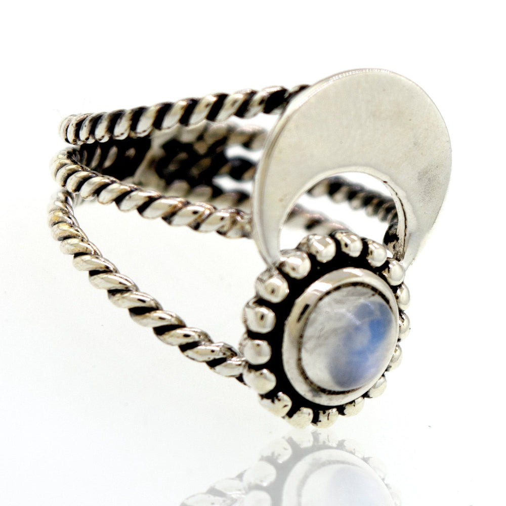 Elegant round moonstone ring with a crescent moon and triple shank design available exclusively on our online store.