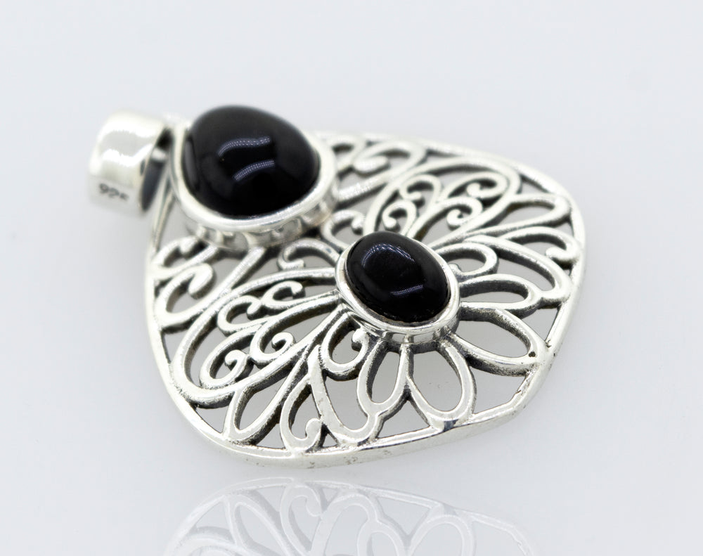 Beautiful onyx pendant with two stones set in a freestyle sterling silver setting.
