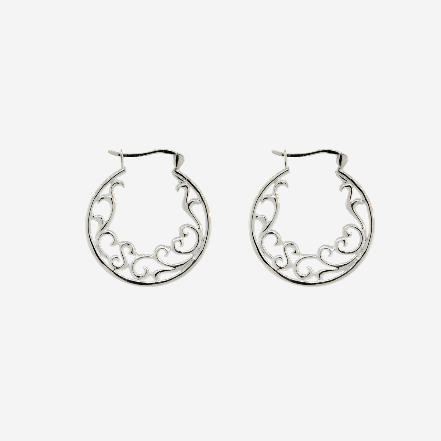 A simple pair of silver hoops with an ornate filigree design. Great for everyday wear.