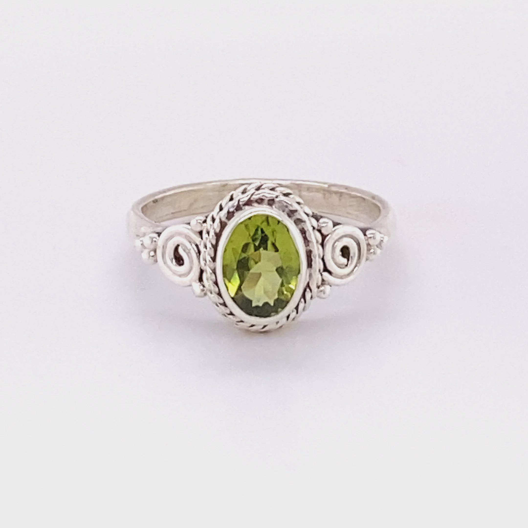 Be swept away by the magnificence of this Bali-styled peridot ring. With an intricately designed rope border and swooping spirals on either side, this ring is a fashionable piece for any occasion. The spirals of life are paired with peridot, the evening emerald, which is known to invoke feelings of joy, peace, and stir creativity. This delicate ring is a great way to bring more bliss and good tidings into your life or the life of a loved one.