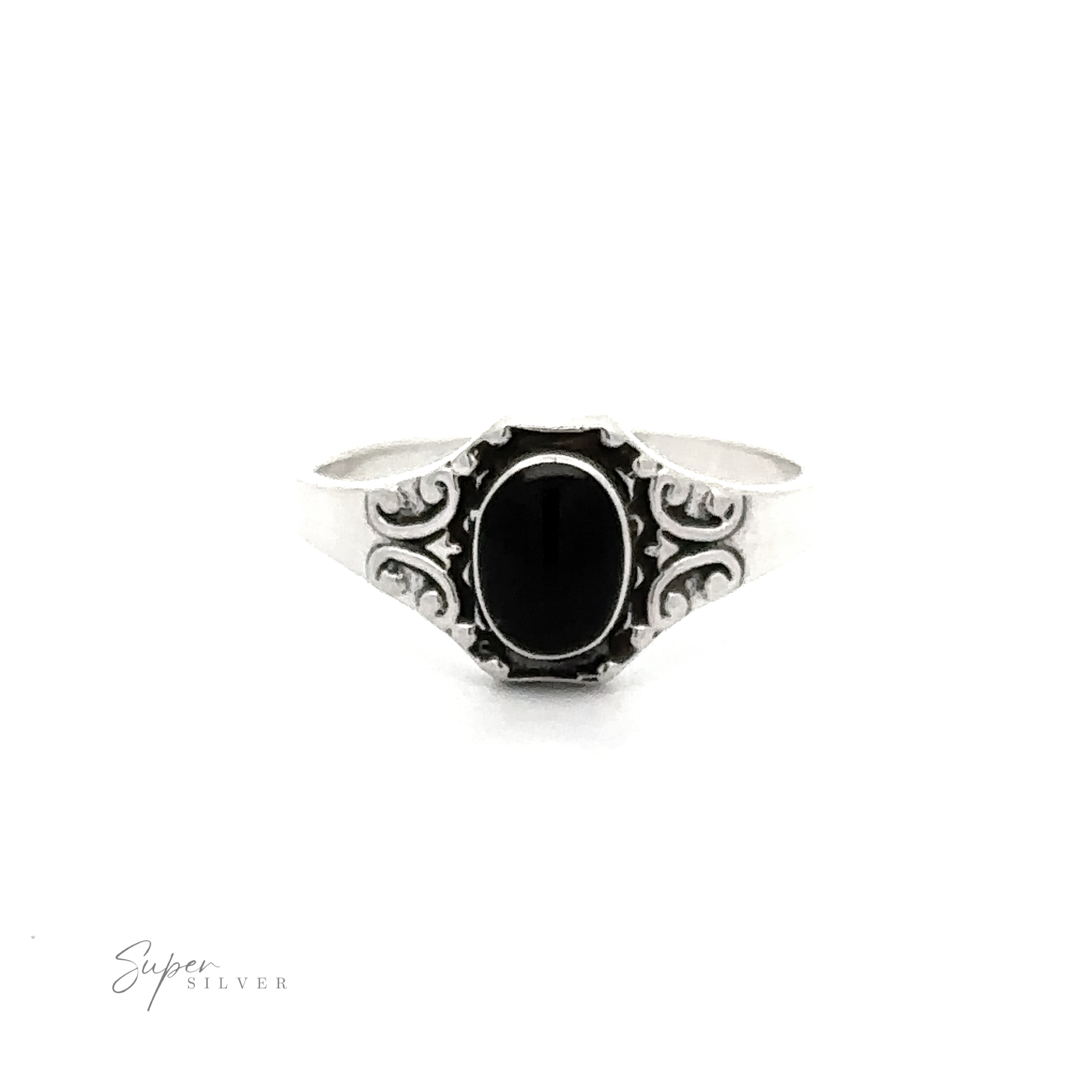 Oval Inlay Stone Ring with Antiqued Filigree Design