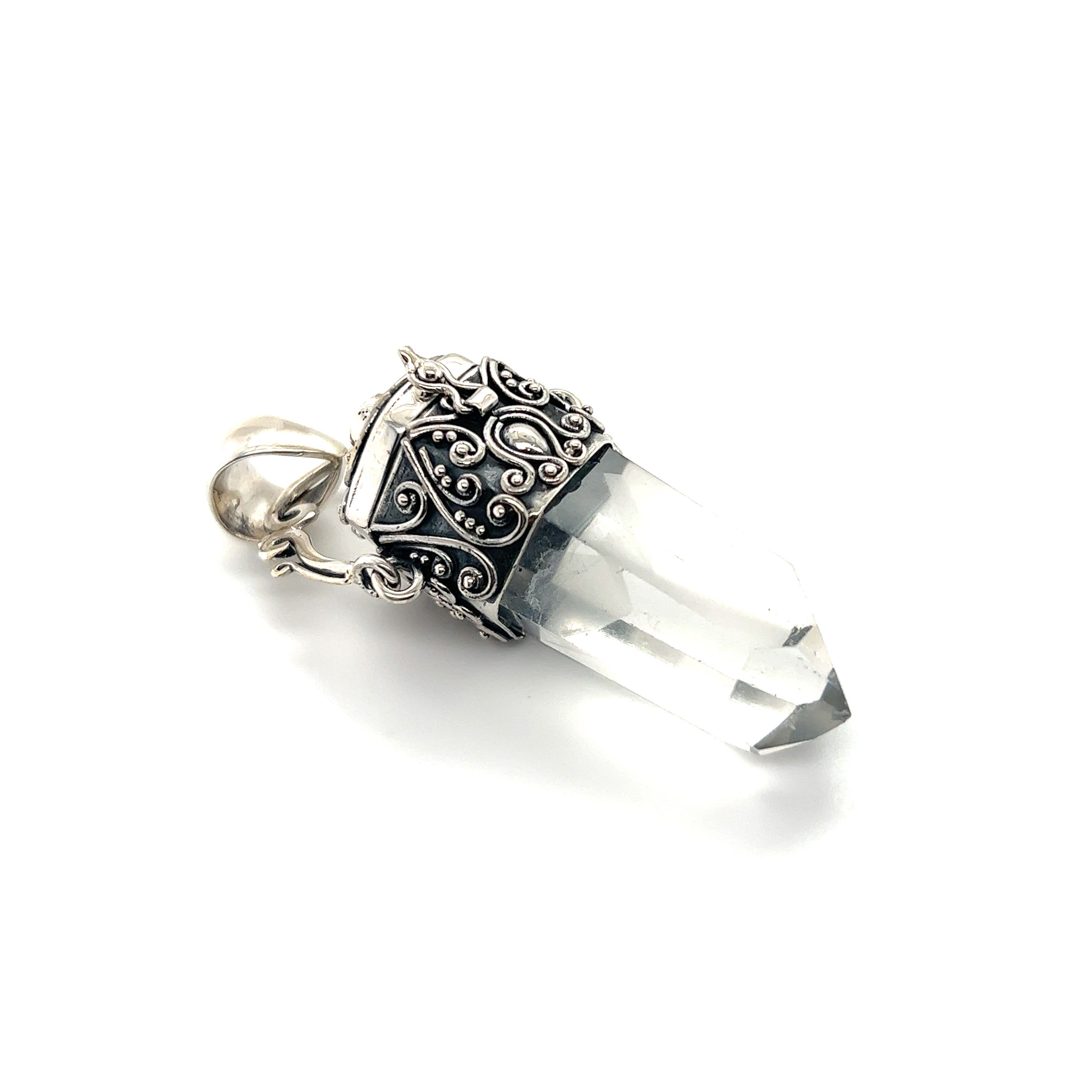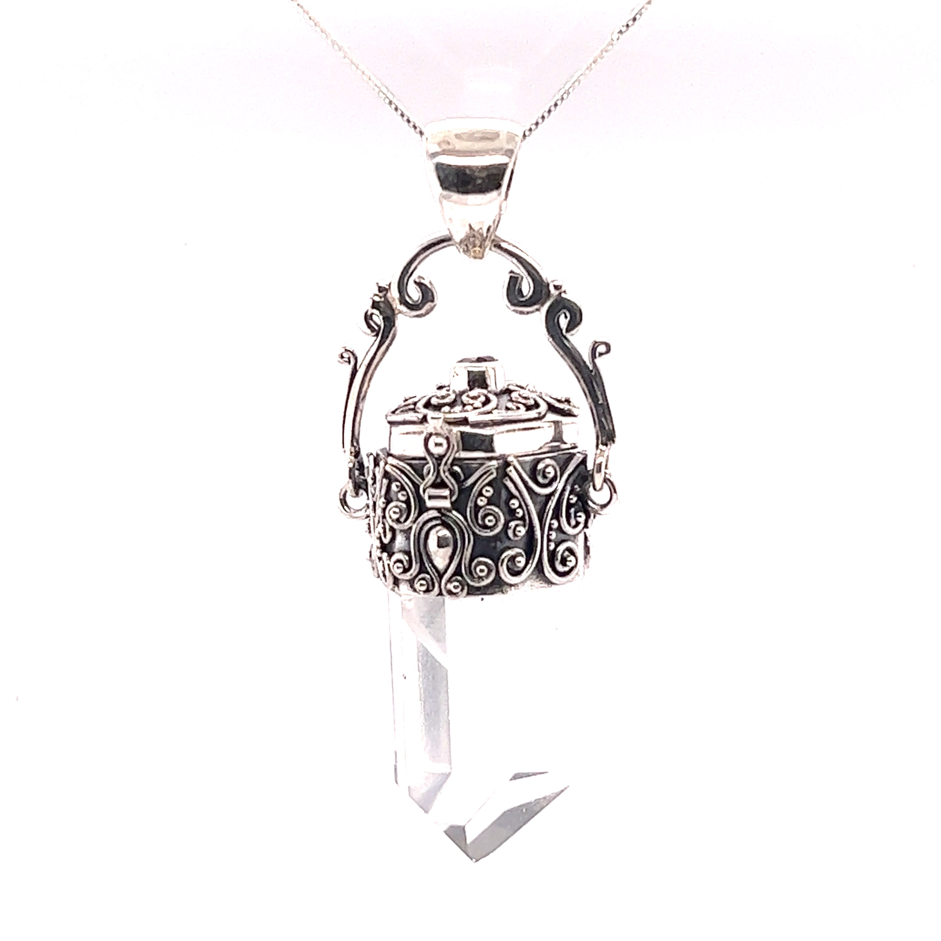 An ornate silver Phantom Crystal Poison Necklace featuring a clear quartz stone, making it a stunning statement piece in our Super Silver jewelry line.