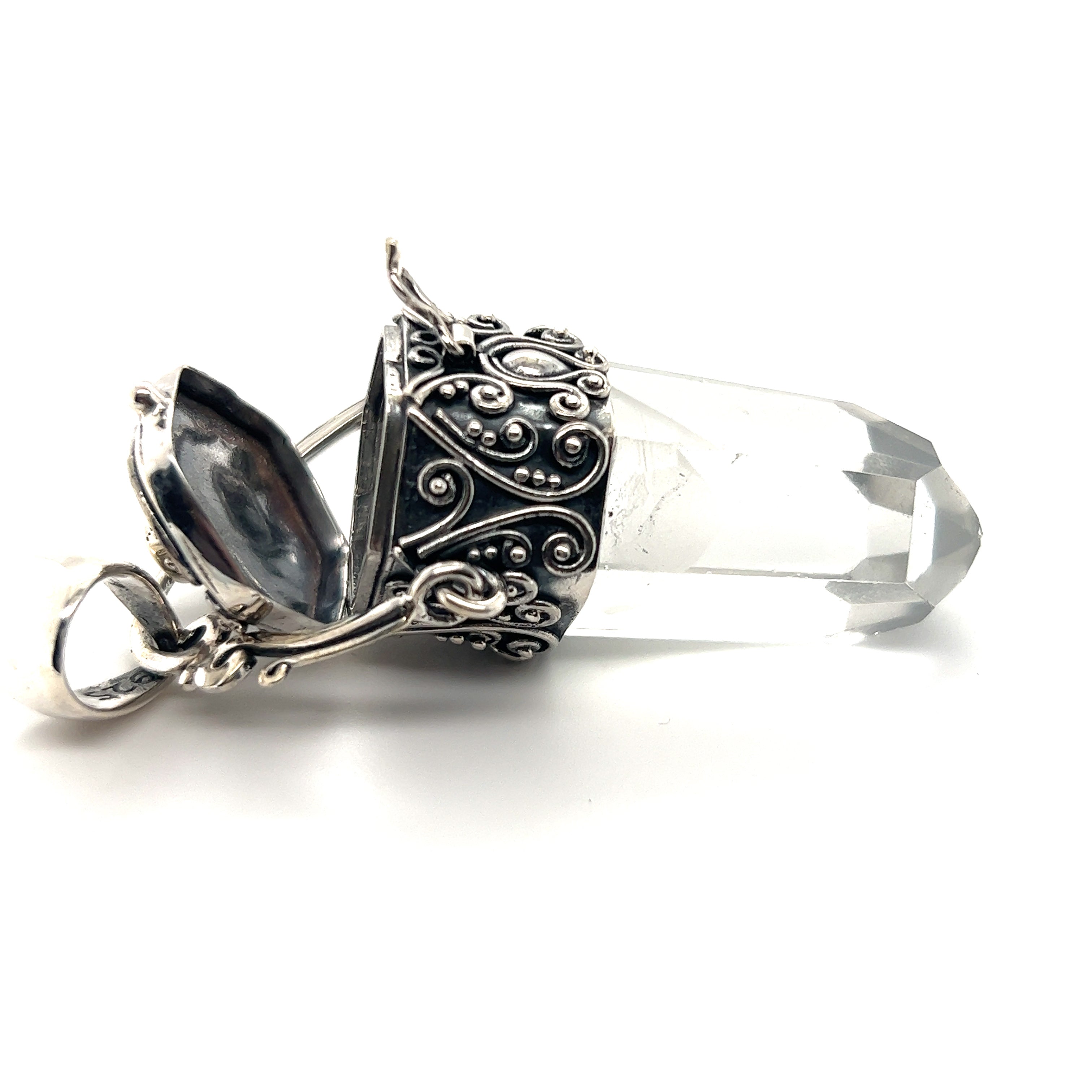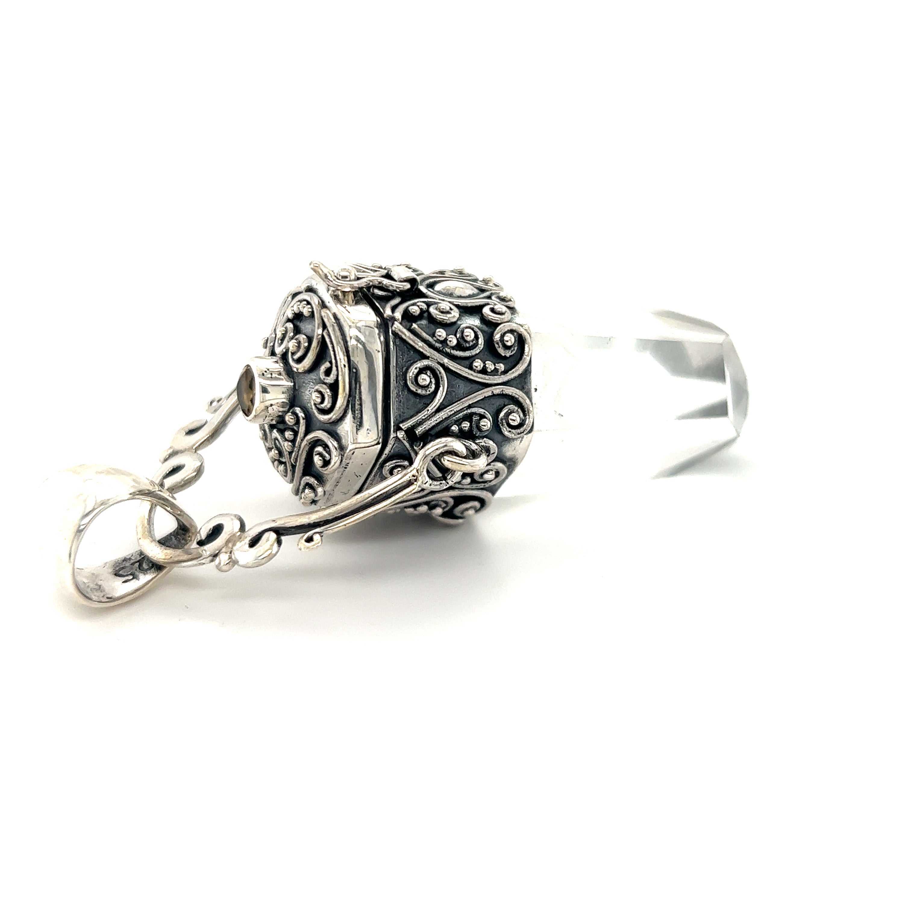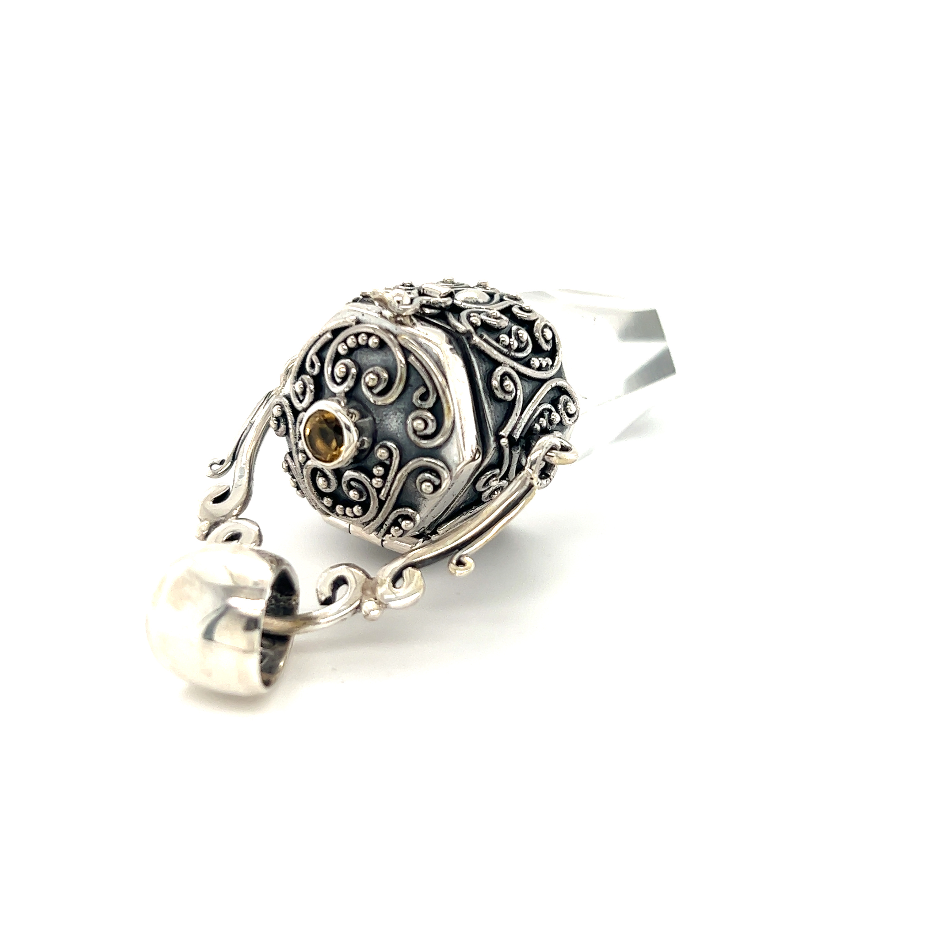 This fascinating phantom quartz crystal features an ornate Bali style detailing and a mysterious locking secret vault. Beautifully handcrafted by one of our treasured artisan collections, a mesmerizing and commanding jewelry line that never disappoints. This impressive, powerful crystal pendant will captivate you with its intricate swirls and beads, leading you down to the ghostly silhouette of the crystals' former self and capped off with a delicate citrine stone to give you that extra touch of sparkle! Phantom crystals are created when the past growth of a crystal still shows, and because of this, they are thought to remove past blockage, freeing us to flourish into our future selves. The spectral nature given to the stone enhances its spiritual affinity, making it particularly useful in healing and growing your innate wisdom. A tremendous gripping piece of art that is sure to be your new favorite statement pendant.