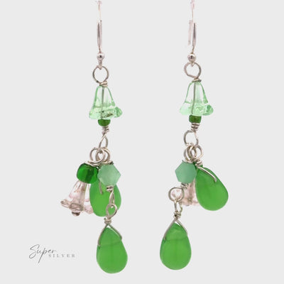 Colors range from a clear bead, soft green raindrop shaped beads and dark green accents.