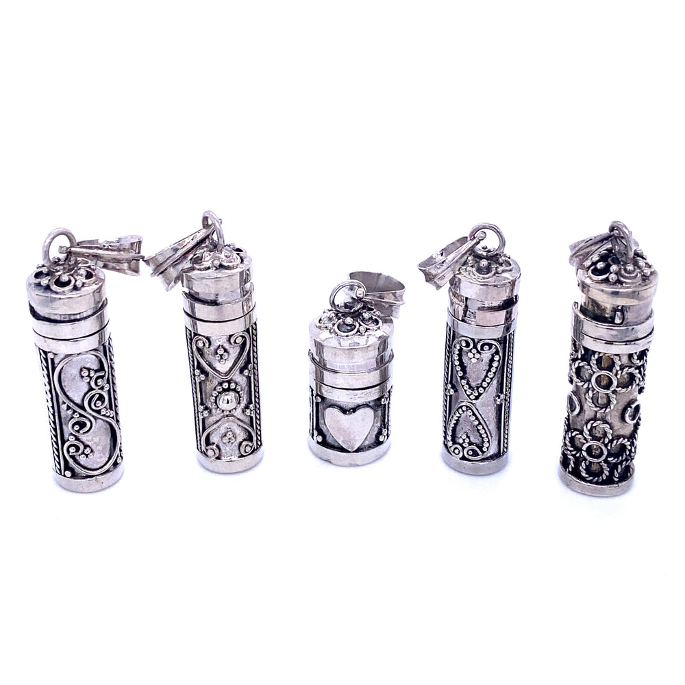 Make your wish come true with these beautiful, intricately crafted prayer box pendants. Prayer boxes have been used historically to hold religious scripture and prayers, keeping them close to the wearer's heart so that they might embody the message in their personal life. In more modern times, these pendants are used to hold mementos, affirmations, or other personal reminders to inspire the wearer in their everyday life. In addition, they have been used to hold the ashes of a loved one. These finely detailed prayer boxes come with five distinctly ornate designs so you can bring home a piece uniquely fitting to you or a loved one.