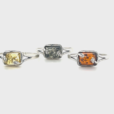 Rectangle shaped amber set into simple silver band with earthy detailing