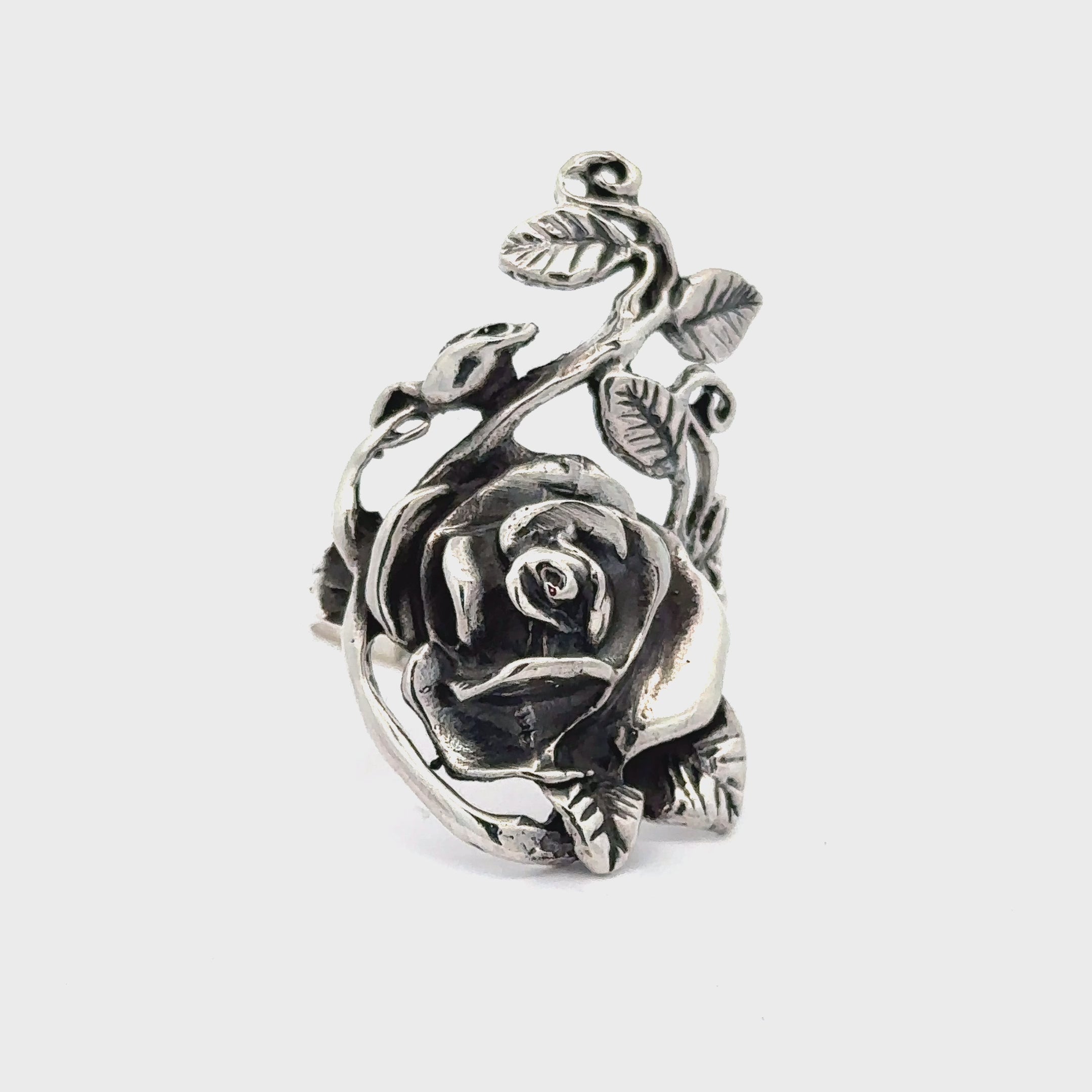 A grandiose rose ring with vines gracefully trailing down your finger. This illustrious rose is at the height of its bloom, making this exquisite ring an eye-catching statement piece that never goes out of style.