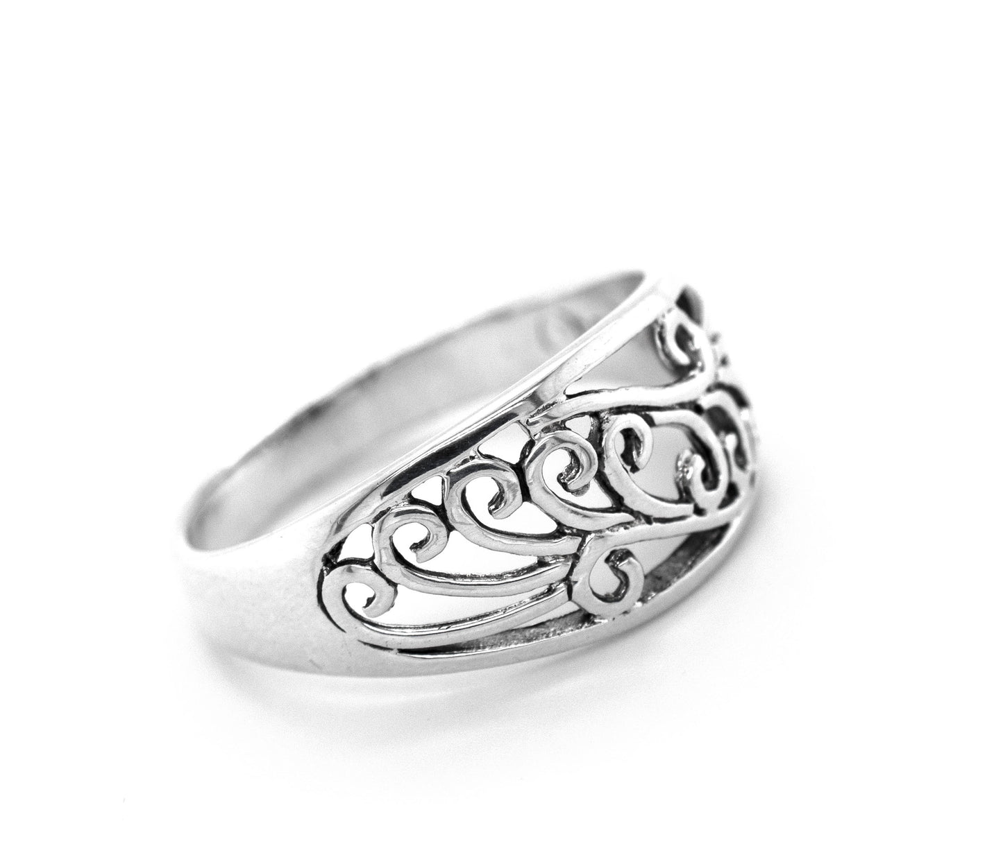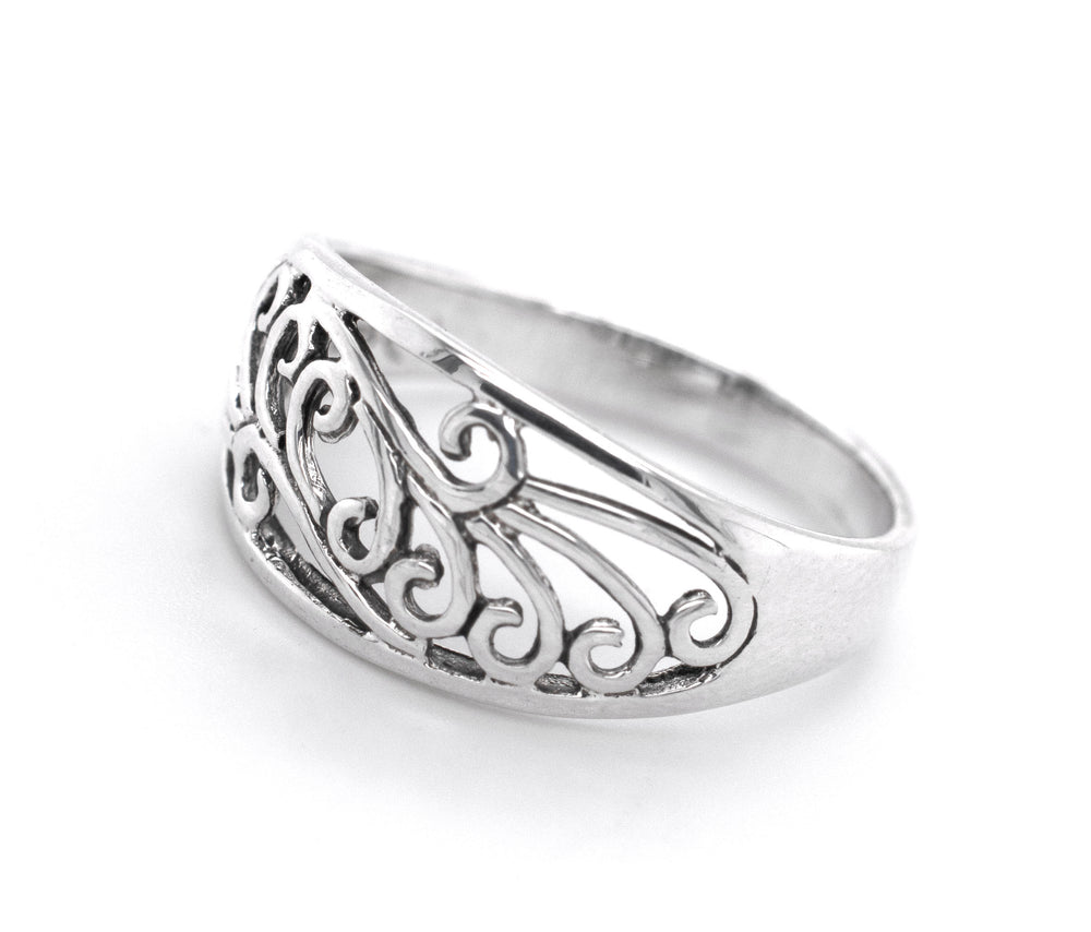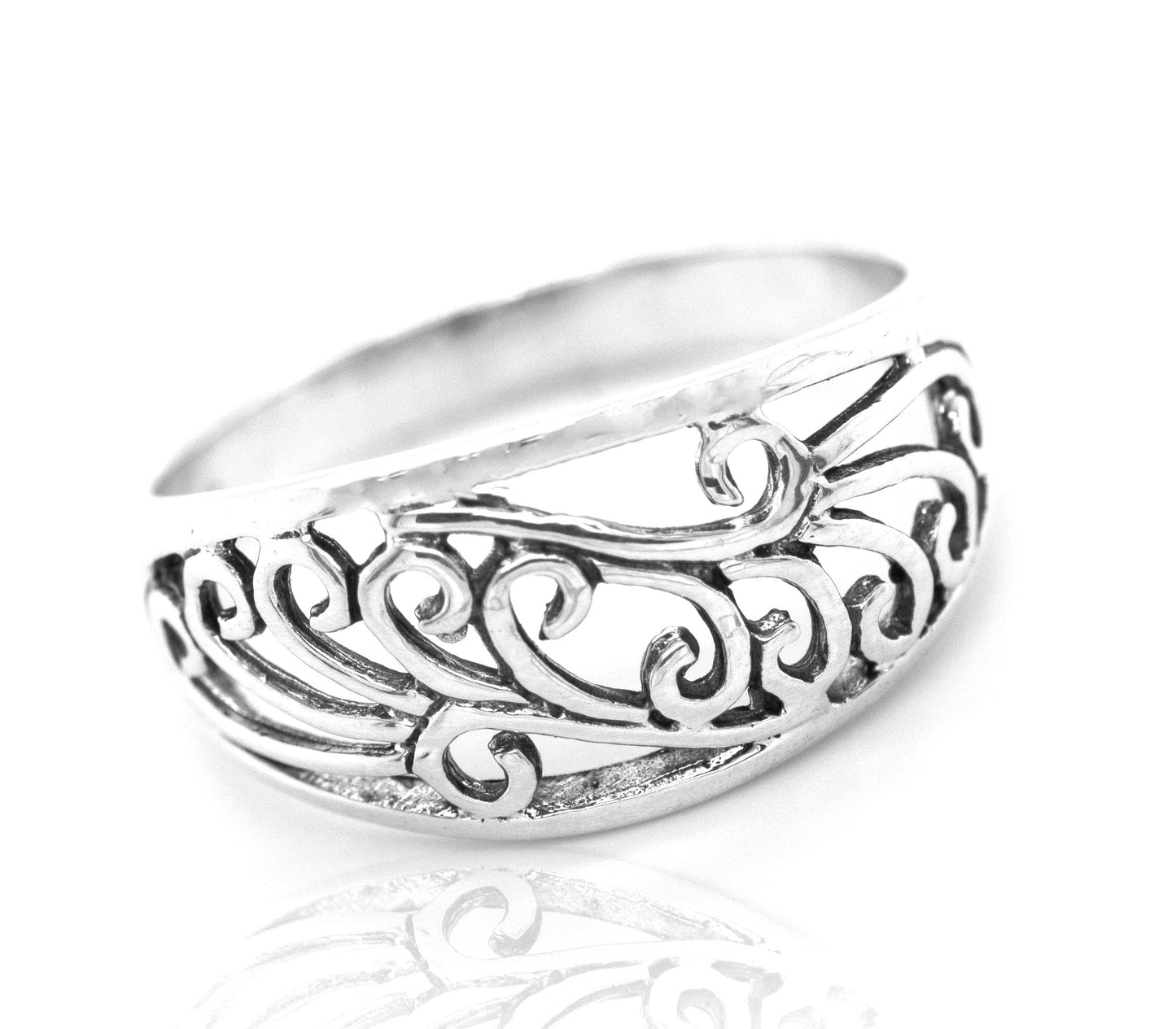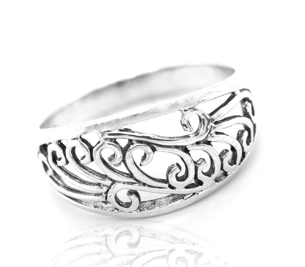 This beautiful filigree ring will add instant artful extravagance to your life with its heavenly swirls. The silky swell of the domed shape accentuates your finger's thin, lithe lines, complementing the old-world charm of this elegant art nouveau-styled ring. Wear on its own for a graceful flourish, or stack it for a more luxurious look.