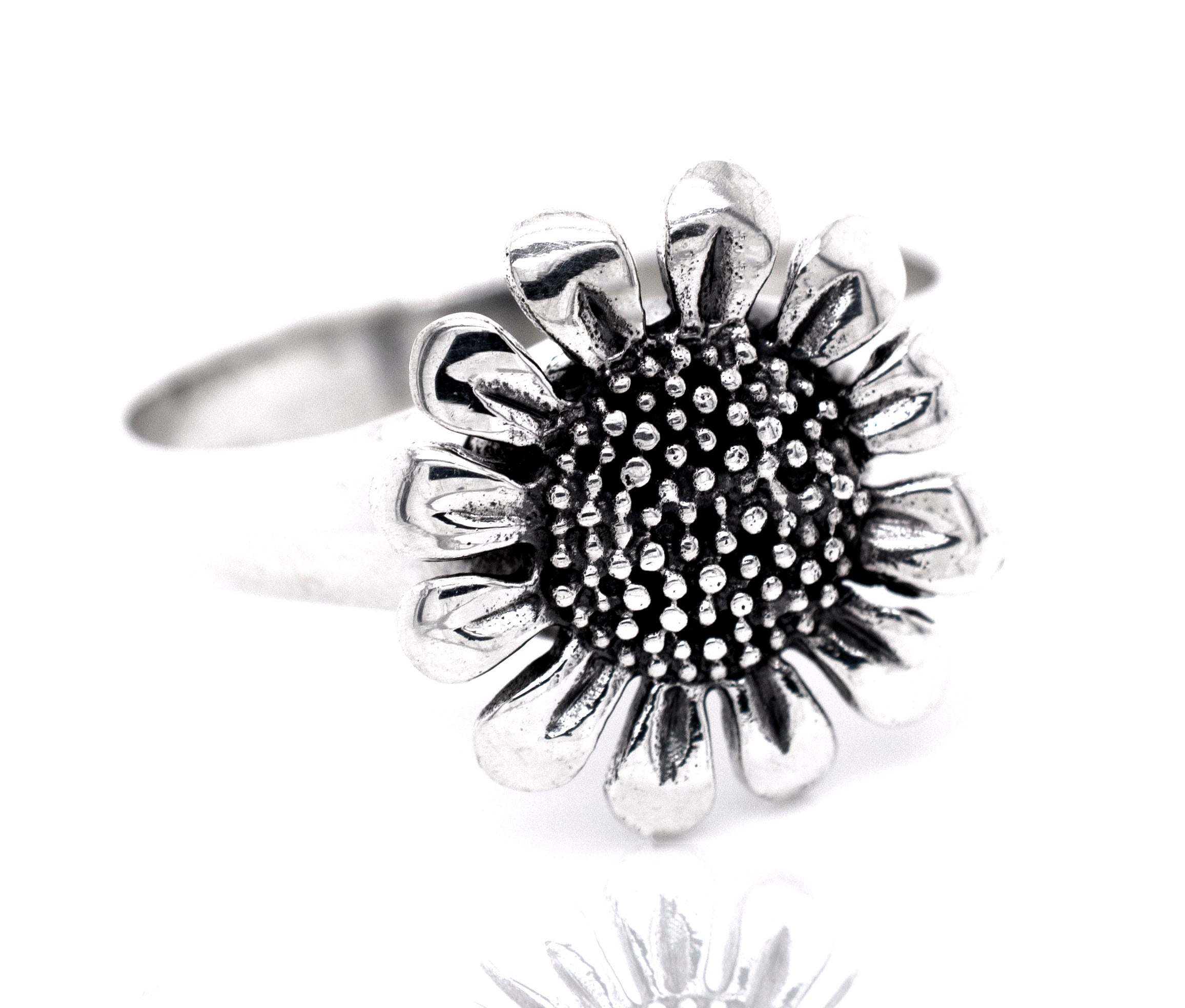 This beautifully detailed sunflower ring displays a cheerful flower in full bloom. This ring has been a best seller for years in our storefronts, and we are so happy to have it available online finally! It is a lovely nature ring that was made to last with its more durable, thicker silver setting. Sunflowers worship the sun, turning to soak up the most rays possible throughout the season. So let those summer vibes brighten your day year-round with this charming sunflower ring.