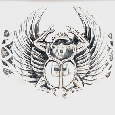 Command attention with this striking statement bracelet, a true masterpiece of artistry and symbolism. The bold cuff features intricately detailed lotus flowers along the sides, framing the powerful presence of the winged scarab—an ancient Egyptian emblem of transformation and protection.