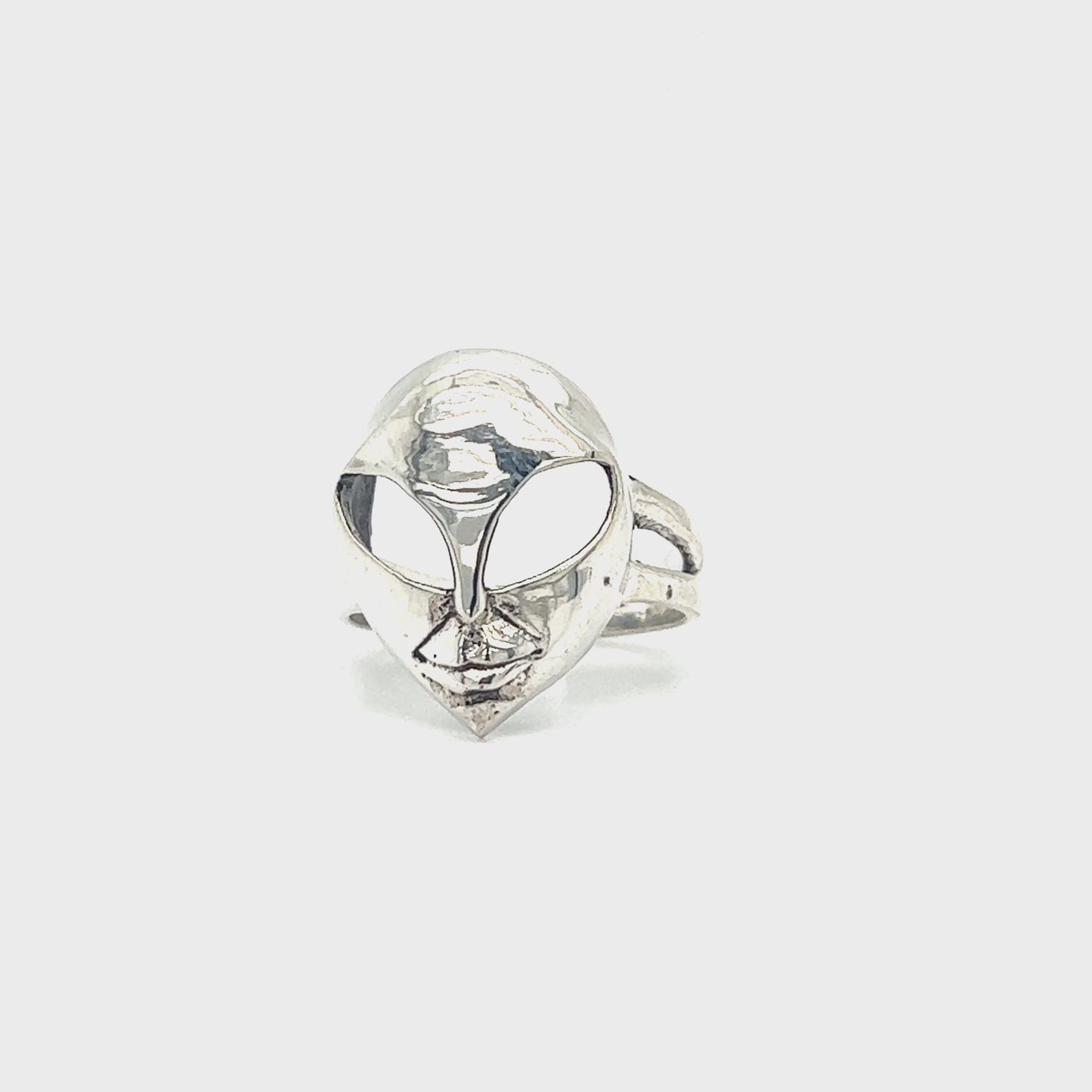 A Super Silver Alien Head Ring that serves as a fashion statement piece.