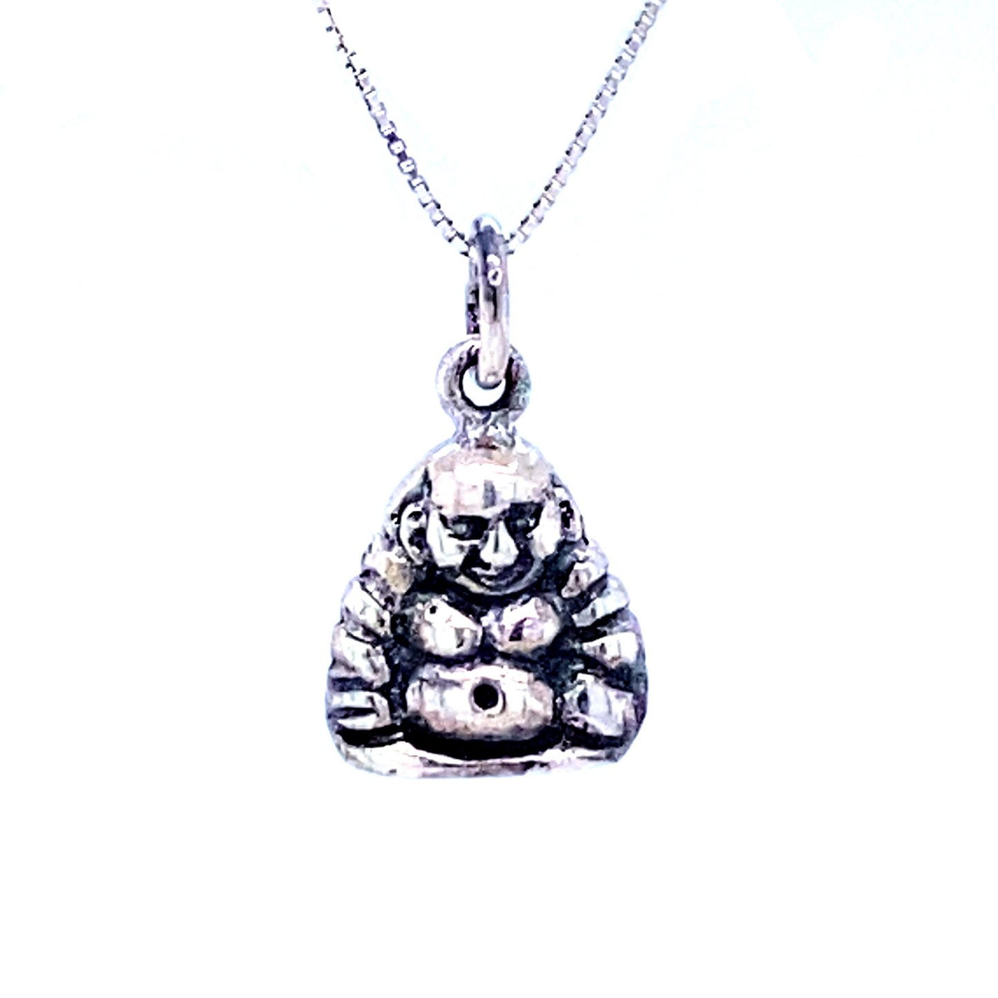 A wondrous charm displaying the laughing Buddha. This pendant is dainty and an excellent choice for layering with other charms. Oxidized to emphasize his sagely wisdom, rub his belly for good luck!