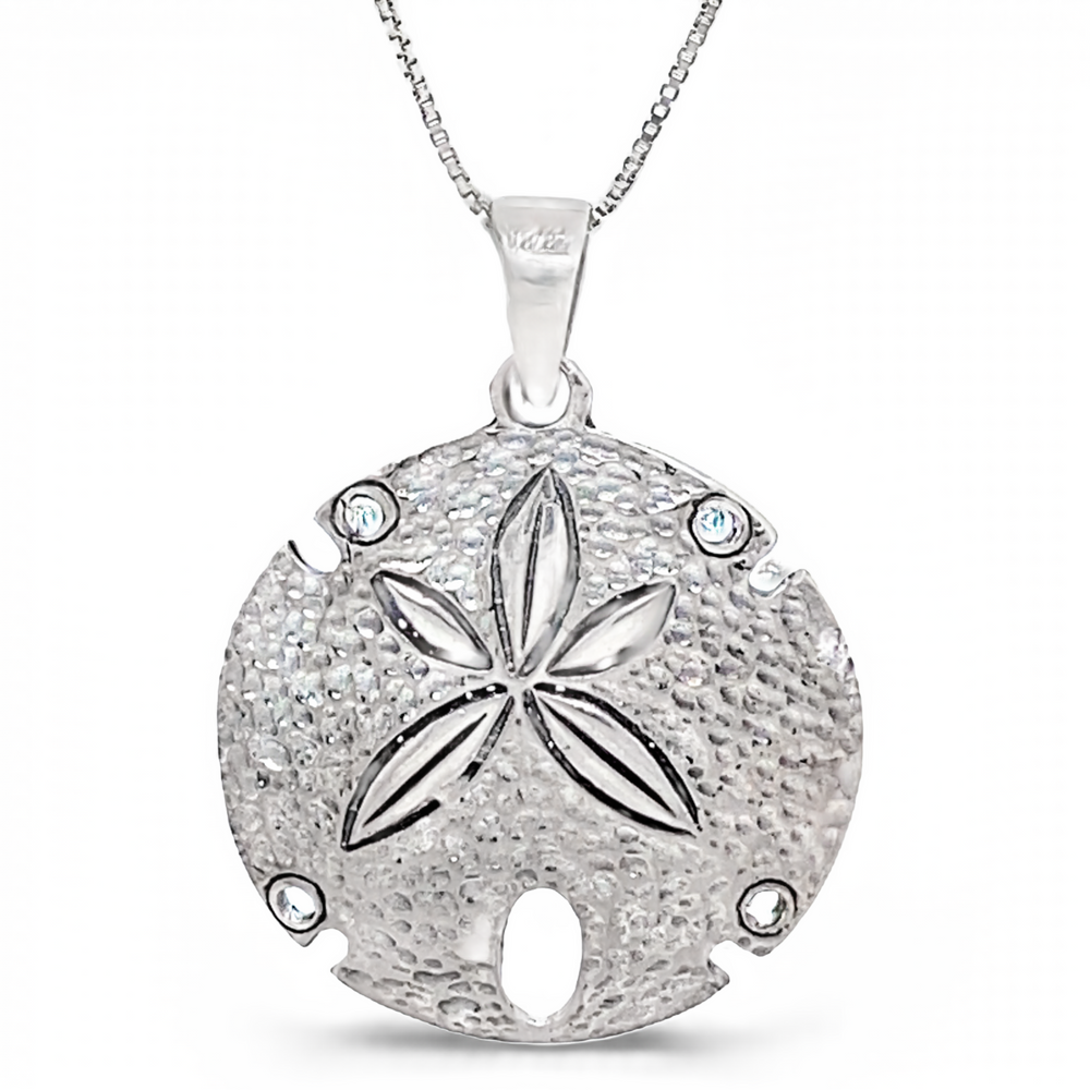 A stunning sand dollar pendant with a brilliant hammered finish. Carry the elegance of the ocean with you daily with this striking sand dollar pendant.