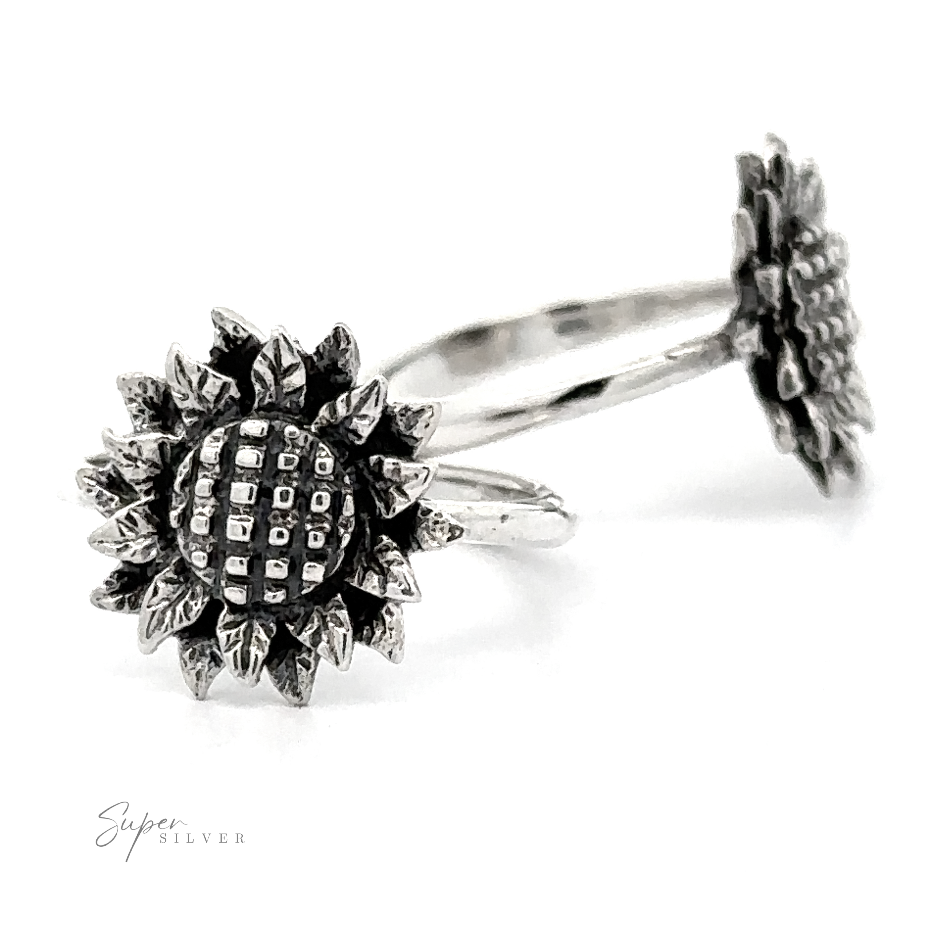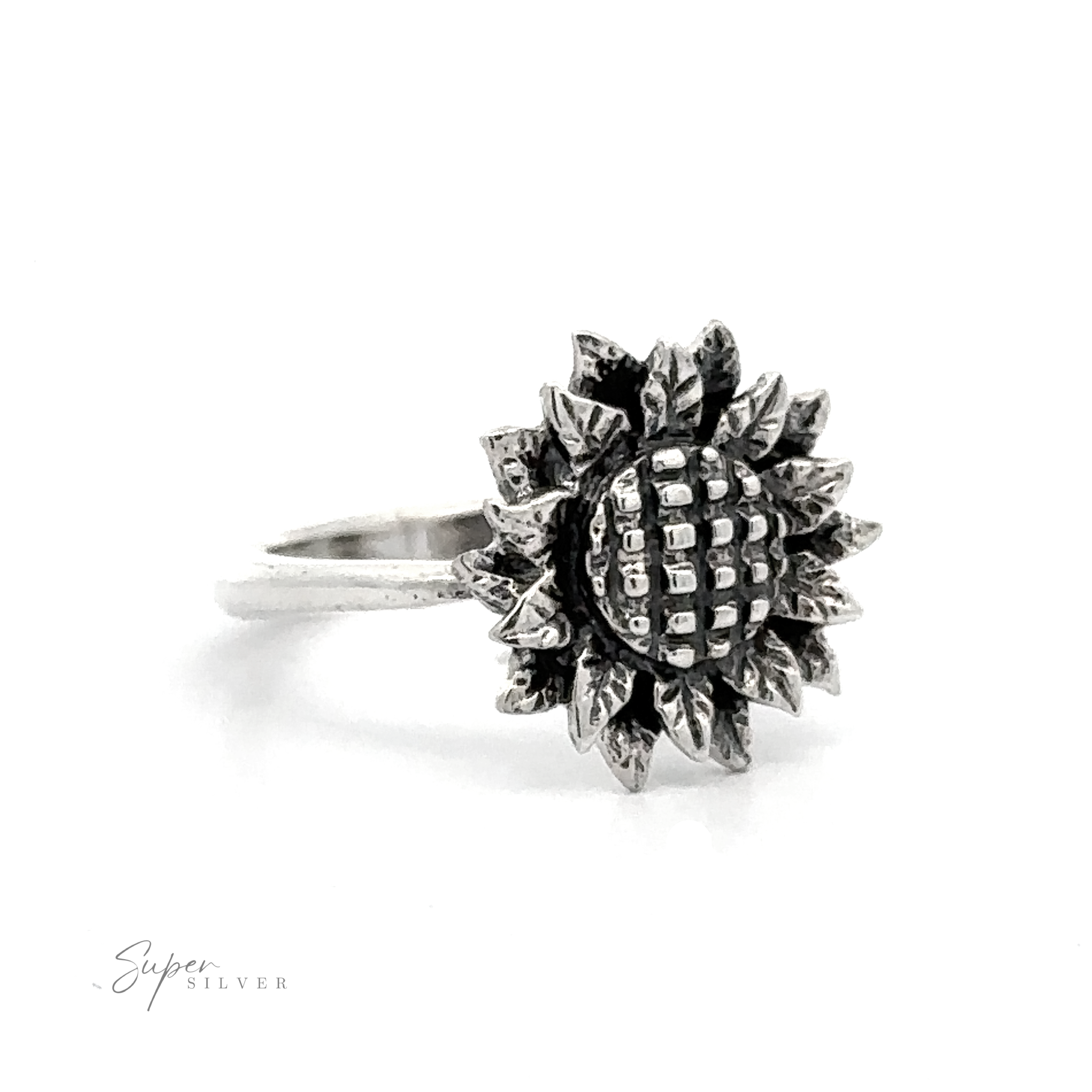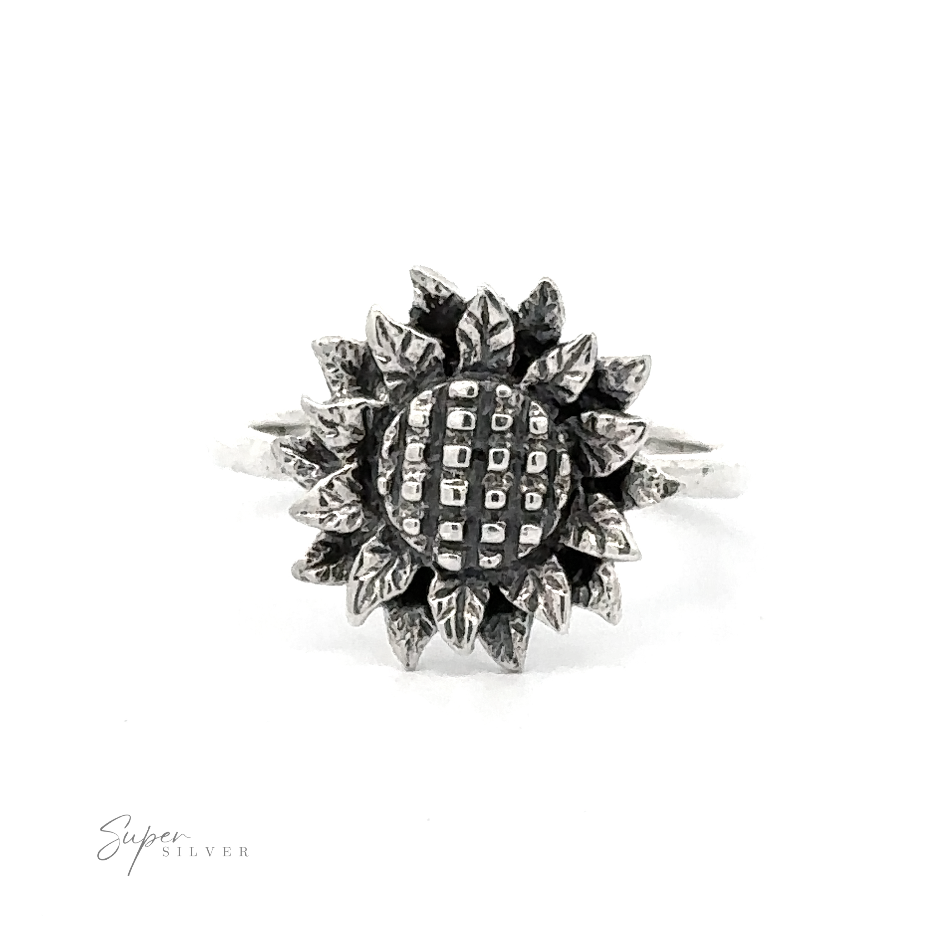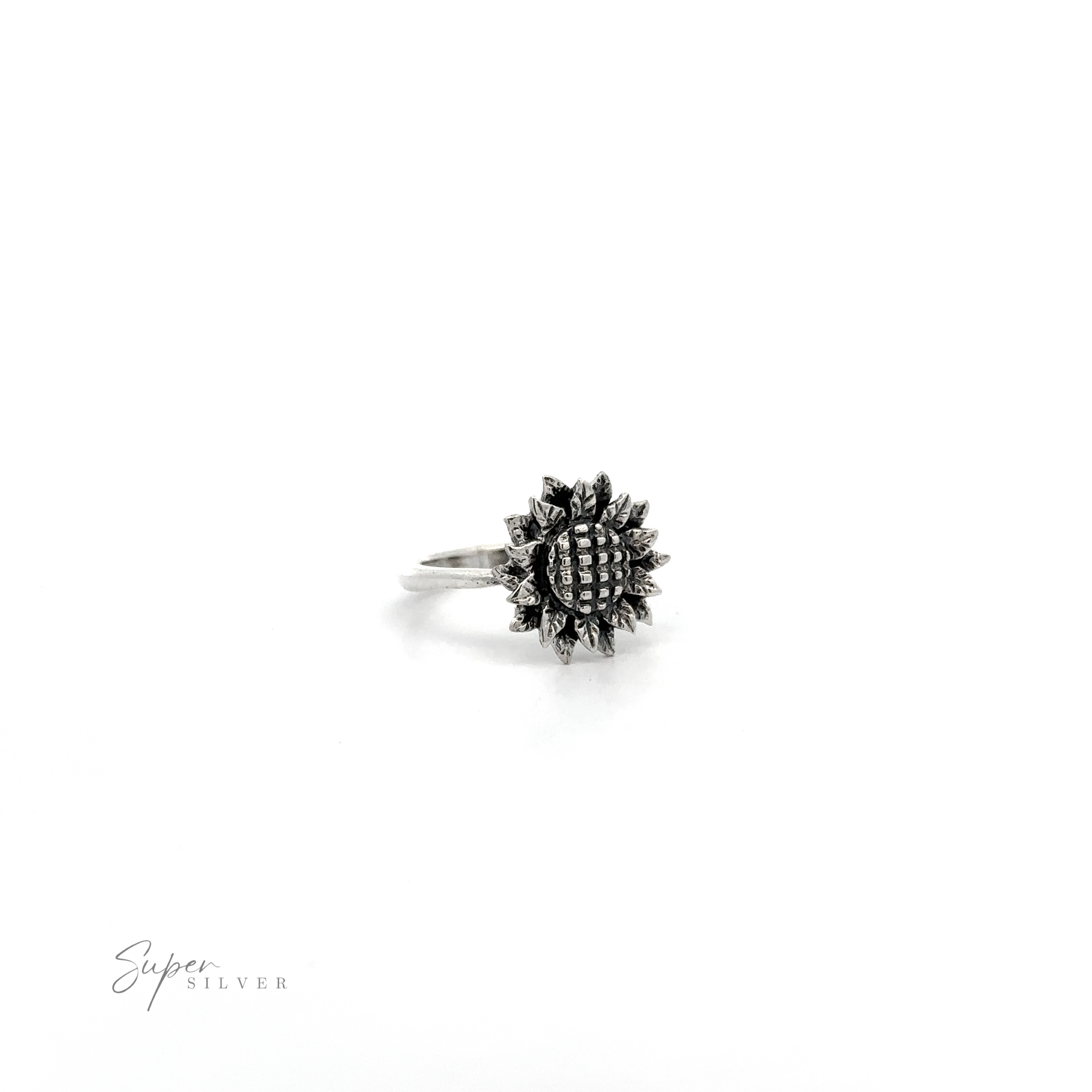 A Silver Sunflower Ring with detailed petals and textured center on a white background.