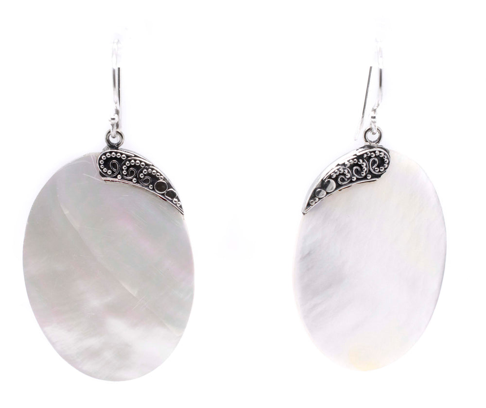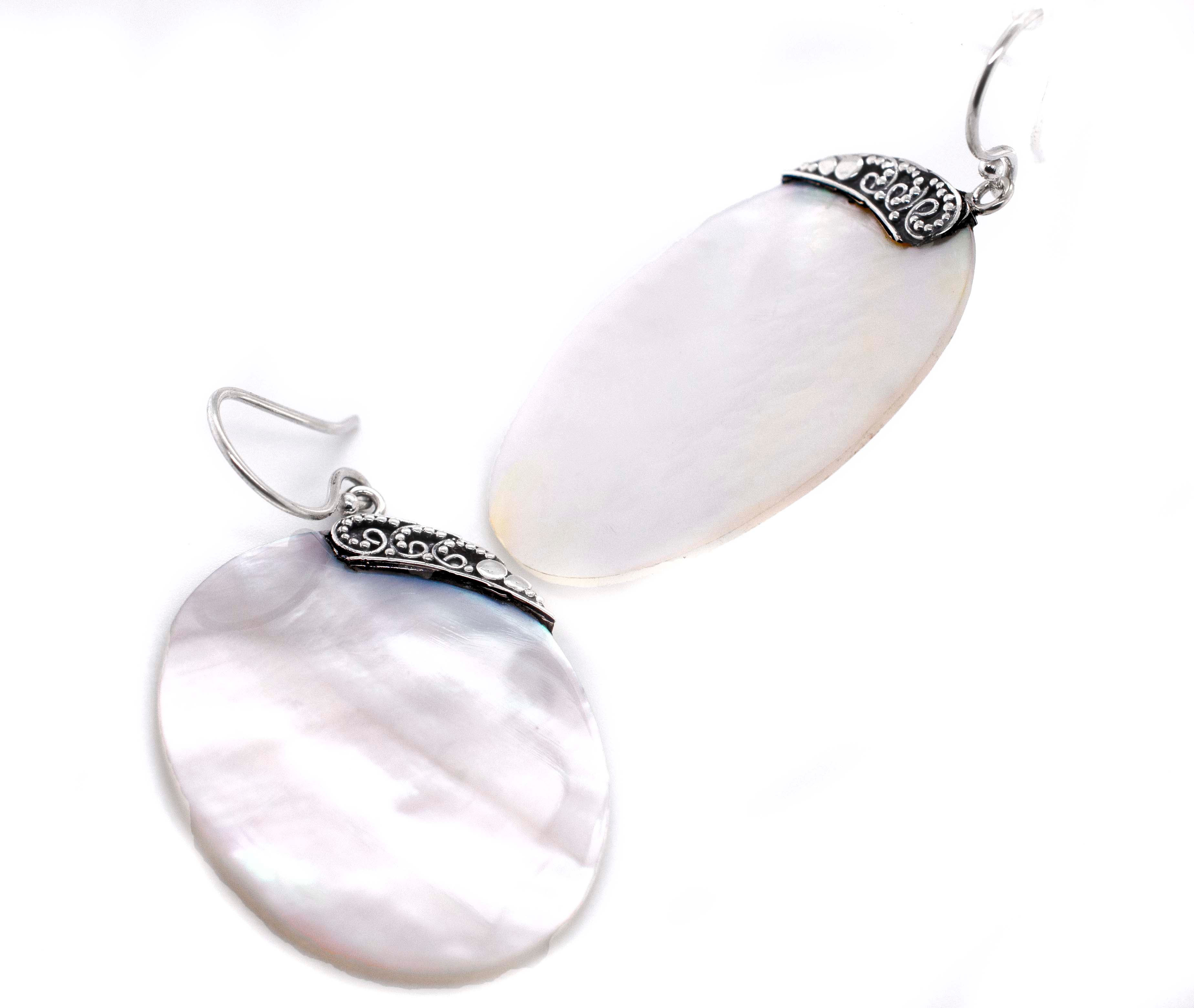 Make waves with these gorgeous mother-of-pearl earrings. Mother of pearl's milky white appearance is as elegant as it is timeless, effortlessly amplifying any semi-formal attire for a delicate, feminine appeal. In addition, the intricate silverwork is reminiscent of the ocean's rolling currents, pairing perfectly with the nautical theme that Mother of Pearl is known for. Pair these stunning statement earrings with some of our other Mother of Pearl pieces for a beautiful, eye-catching set.