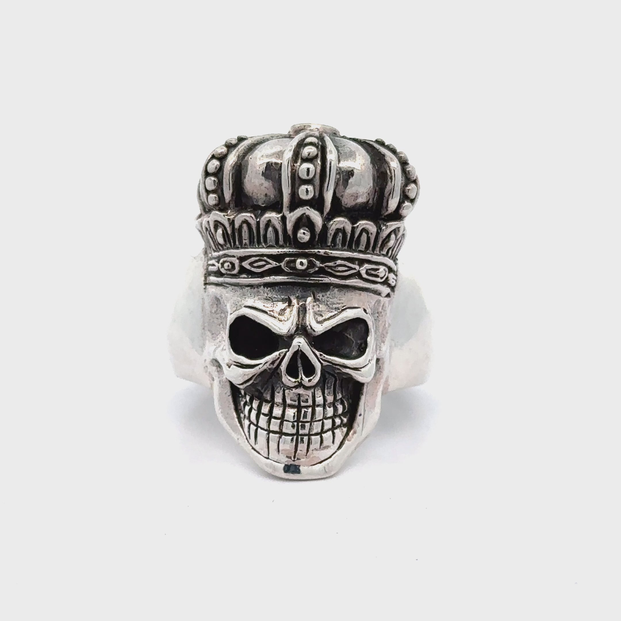 Command attention with our heavy silver ring, featuring a skull adorned with a large king's crown. This bold and striking piece combines regal elegance with edgy style, making it a unique statement accessory. The intricately detailed crown adds a touch of majesty to the rebellious skull design, perfect for those who dare to stand out. Embrace your inner royalty and make a powerful impression with this captivating and distinctive skull ring.