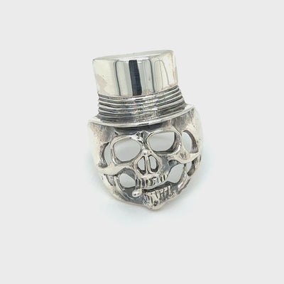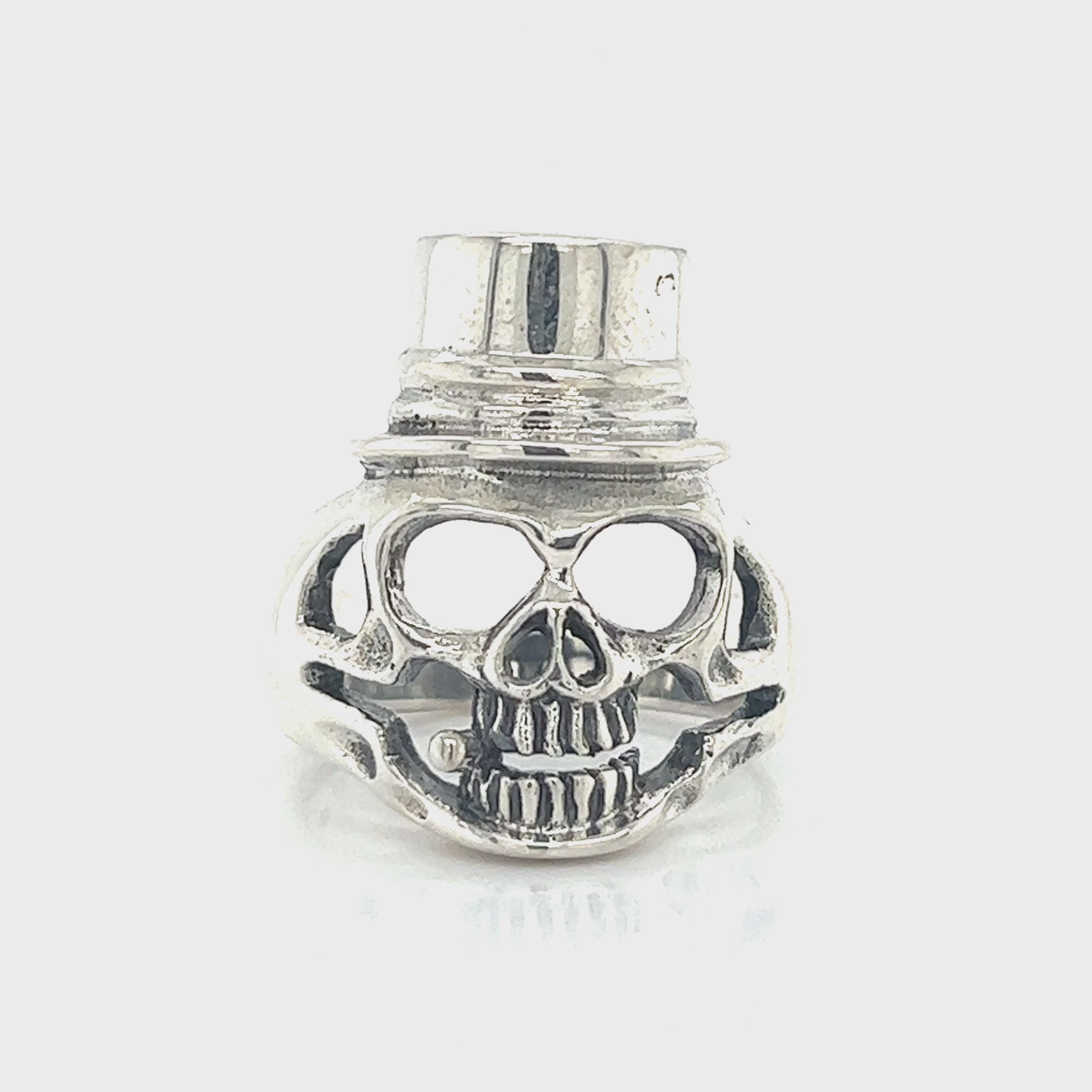 Infuse a dash of debonair flair into your style with this unique skull ring, complete with a dapper top hat. This ring's gleeful expression and stylish hat add a lively touch to the fierce skull motif, making it an exceptional choice for individuals who appreciate edgy fashion with bold statements. Whether you're strolling through the city streets or rocking out at a concert, this daring accessory guarantees attention and sets you apart.