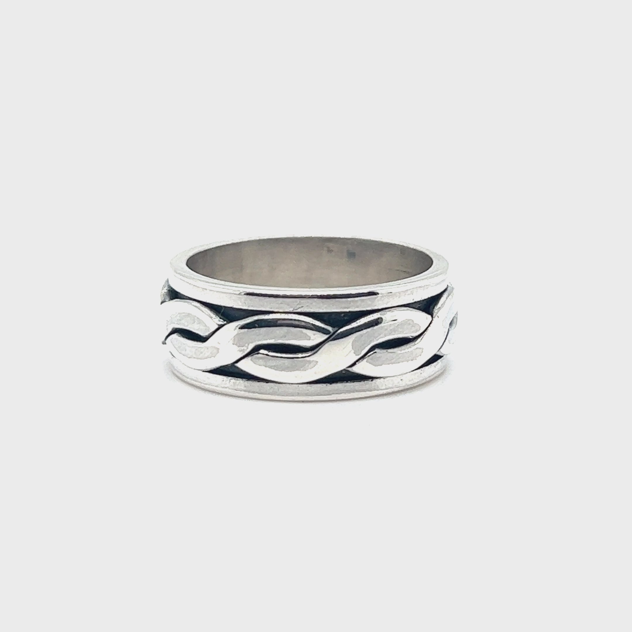 Keep it simple with our Sleek Woven Spinner Band. The smooth silver lines of this broader set band show off the brilliant burnished quality of silver while giving you a subtly rugged modern style that can pair with any outfit. Built for everyday wear and comfort, this sophisticated spinner ring makes a great unobtrusive fidget toy without sacrificing style.