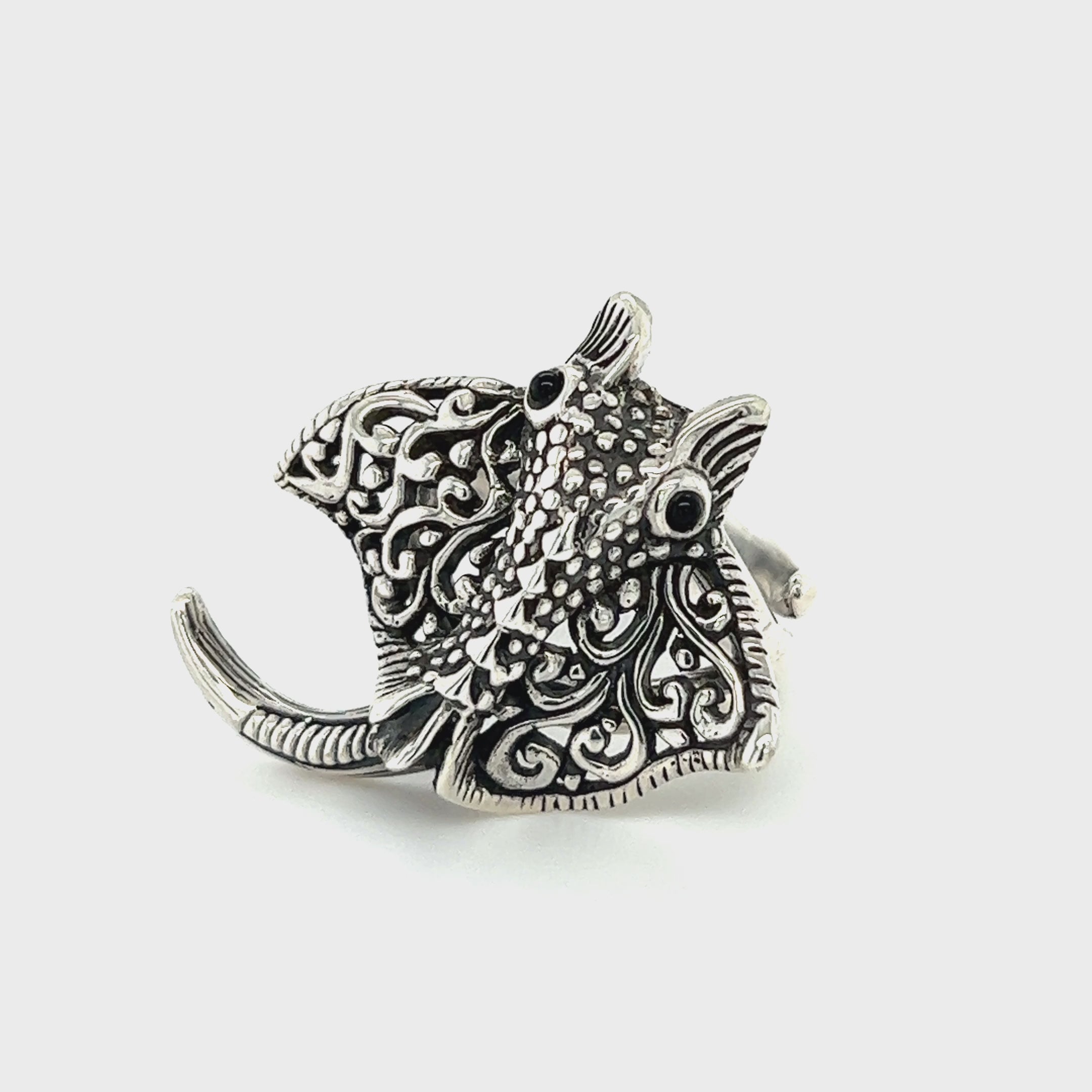 Embrace the captivating spirit of the ocean's depths with our Manta ray Statement Ring, a true masterpiece of exquisite craftsmanship. This ring's filigree swirls are reminiscent of the graceful currents of the sea, creating a breathtaking and intricate design. The Manta ray, often seen as the guardians of the sea, symbolize protection and grace in the underwater world. They are also regarded as the "messengers of the ocean," carrying news far and wide through the world's waters. With every wear, this ring will grace your hand with its remarkable beauty and inspire a connection with nature's wonders. Handcrafted by one of our cherished artisan collections, this captivating and commanding jewelry line consistently delivers pieces that are nothing short of extraordinary.