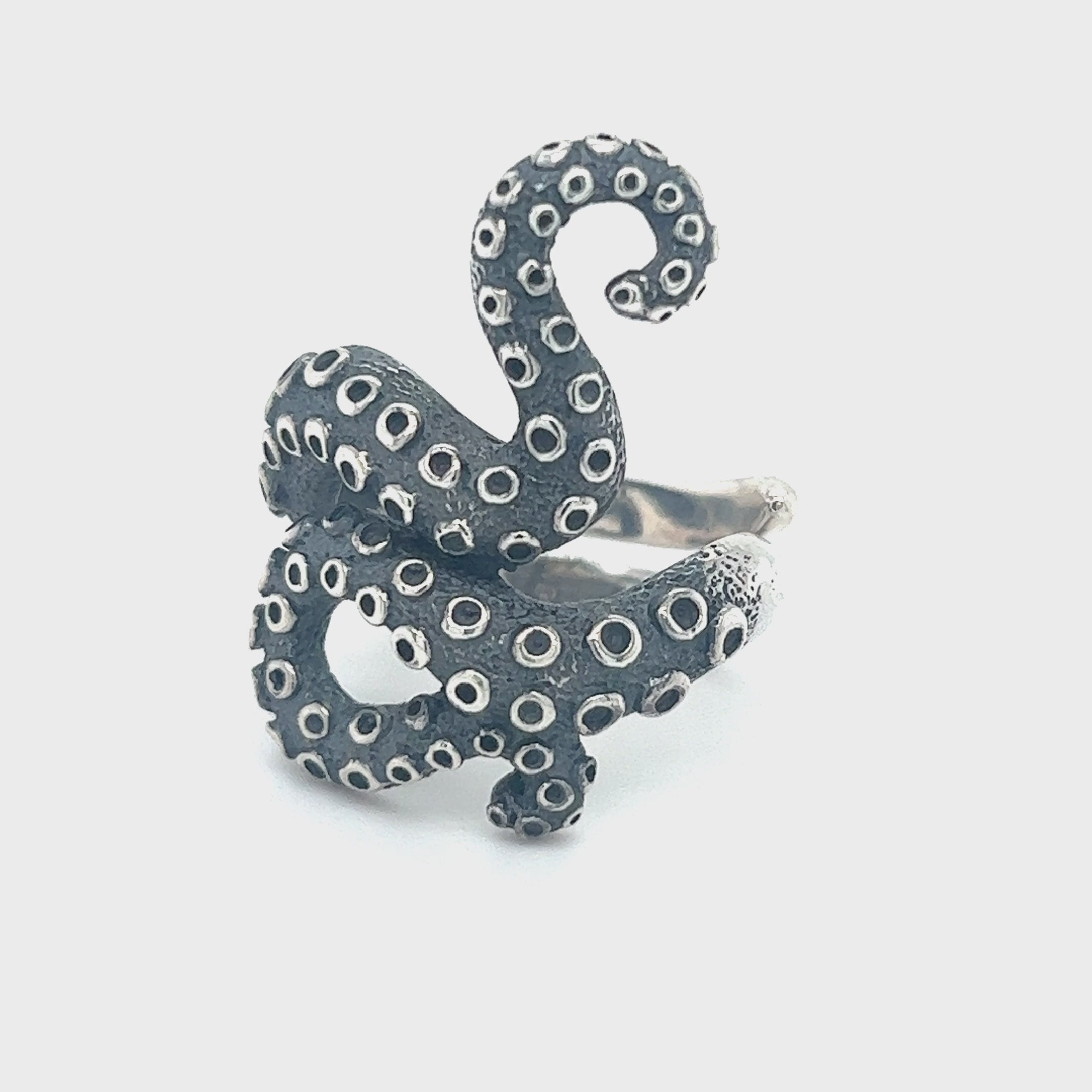 Immerse yourself in the mysteries of the deep sea with our Silver Tentacle Ring, a captivating statement piece that beckons the ocean's enigmatic allure. Crafted with intricate detail, this ring gracefully winds its tentacles around your finger, creating a sensation of being caressed by the ocean's embrace. Its dark, oxidized finish imparts an eerie, otherworldly charm reminiscent of the hidden wonders that lie beneath the waves. Symbolizing the octopus's intelligence, adaptability, and enigmatic nature, this ring invites you to explore the depths of your own uniqueness. Handcrafted by one of our treasured artisan collections, a mesmerizing and commanding jewelry line that never disappoints, this ring is a perfect choice for those enchanted by the ocean or those with a mysterious, adventurous spirit. Dive into a world of intrigue and beauty with our Silver Tentacle Ring, and let your style reflect the depths of your imagination.