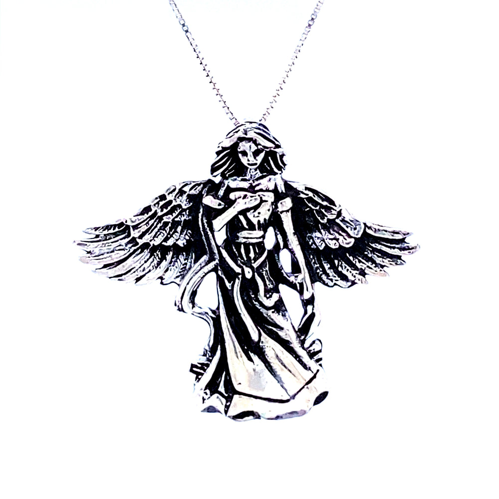 This heavenly pendant features a stunning angel holding their heart with wings spread. An exquisite antiqued detailing gives a fluent gaze, making this divine angel look like they are flowing in the wind.